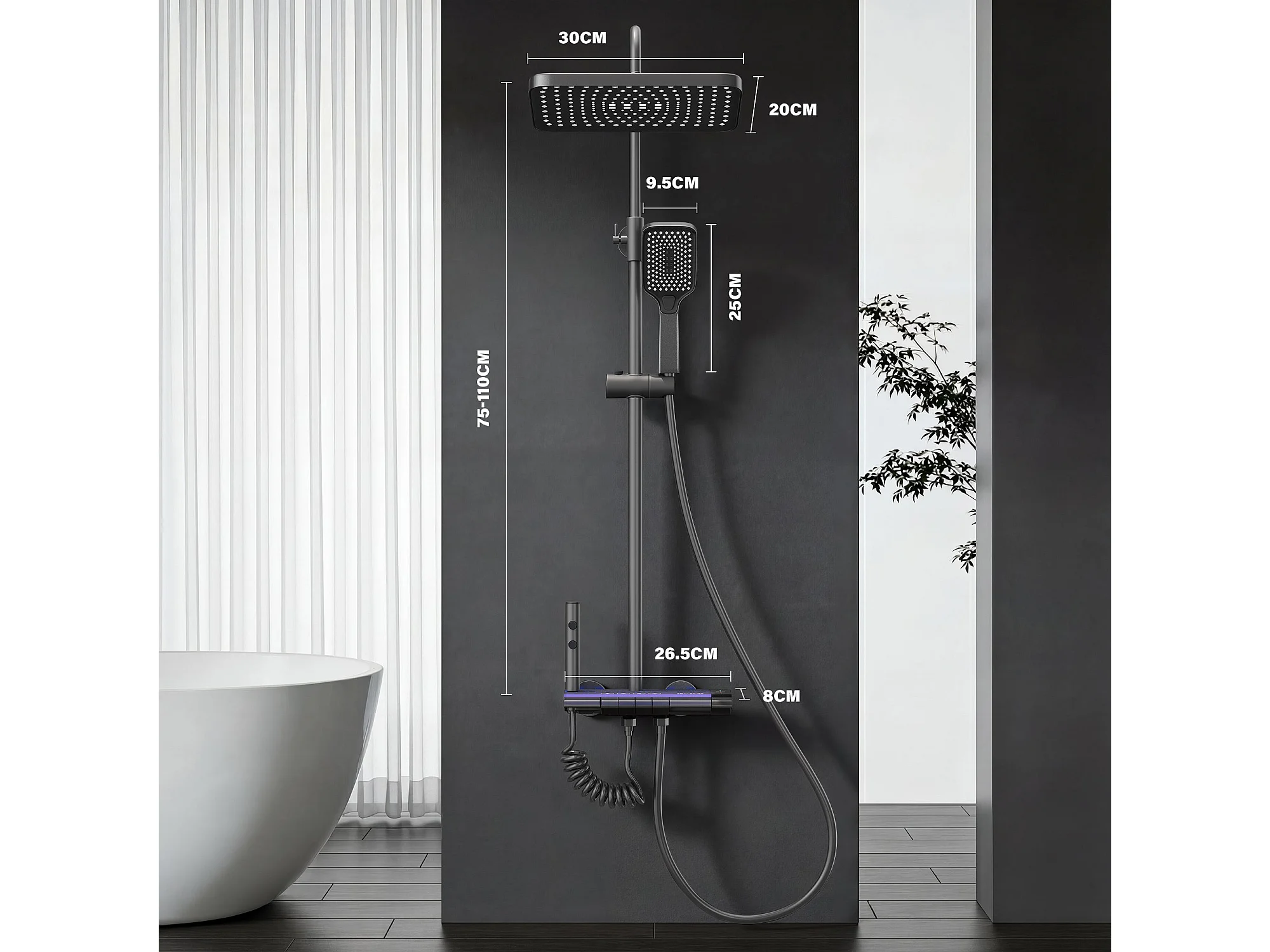 Colonne de douche thermostatique avec pomme de douche, réglable en hauteur, élégante