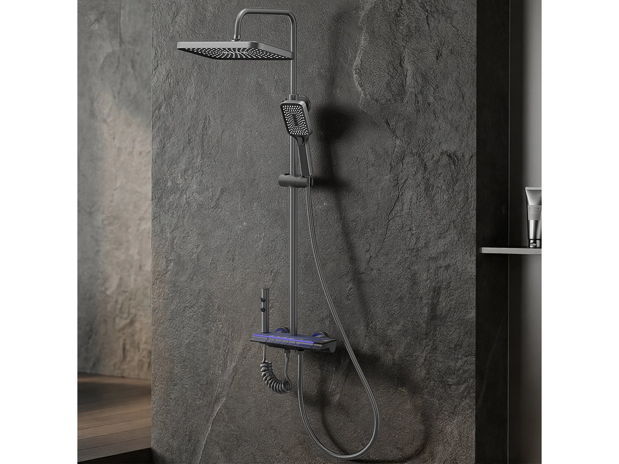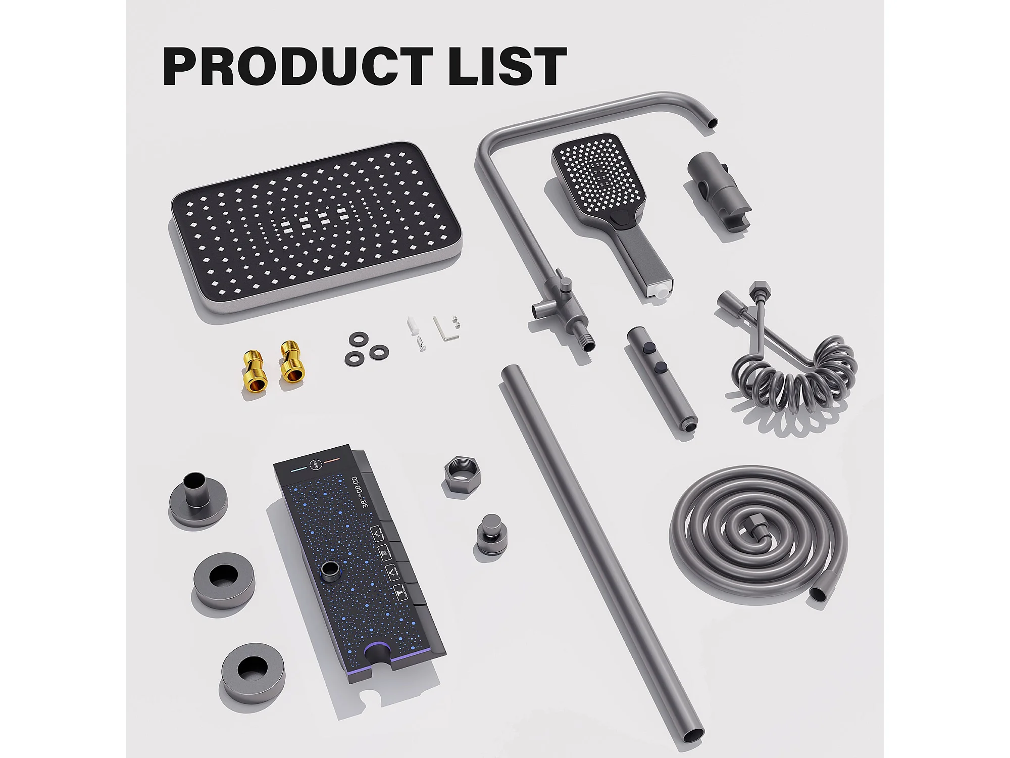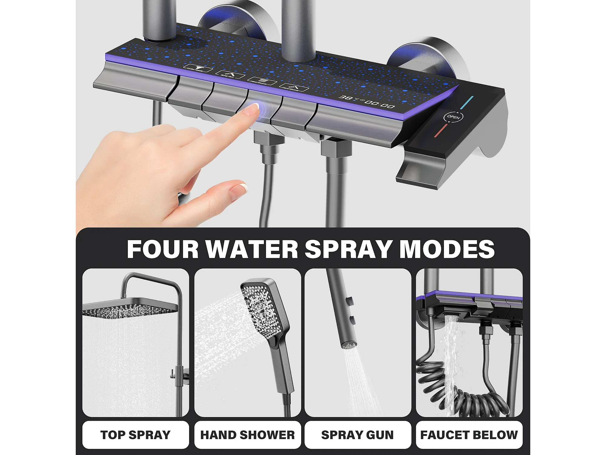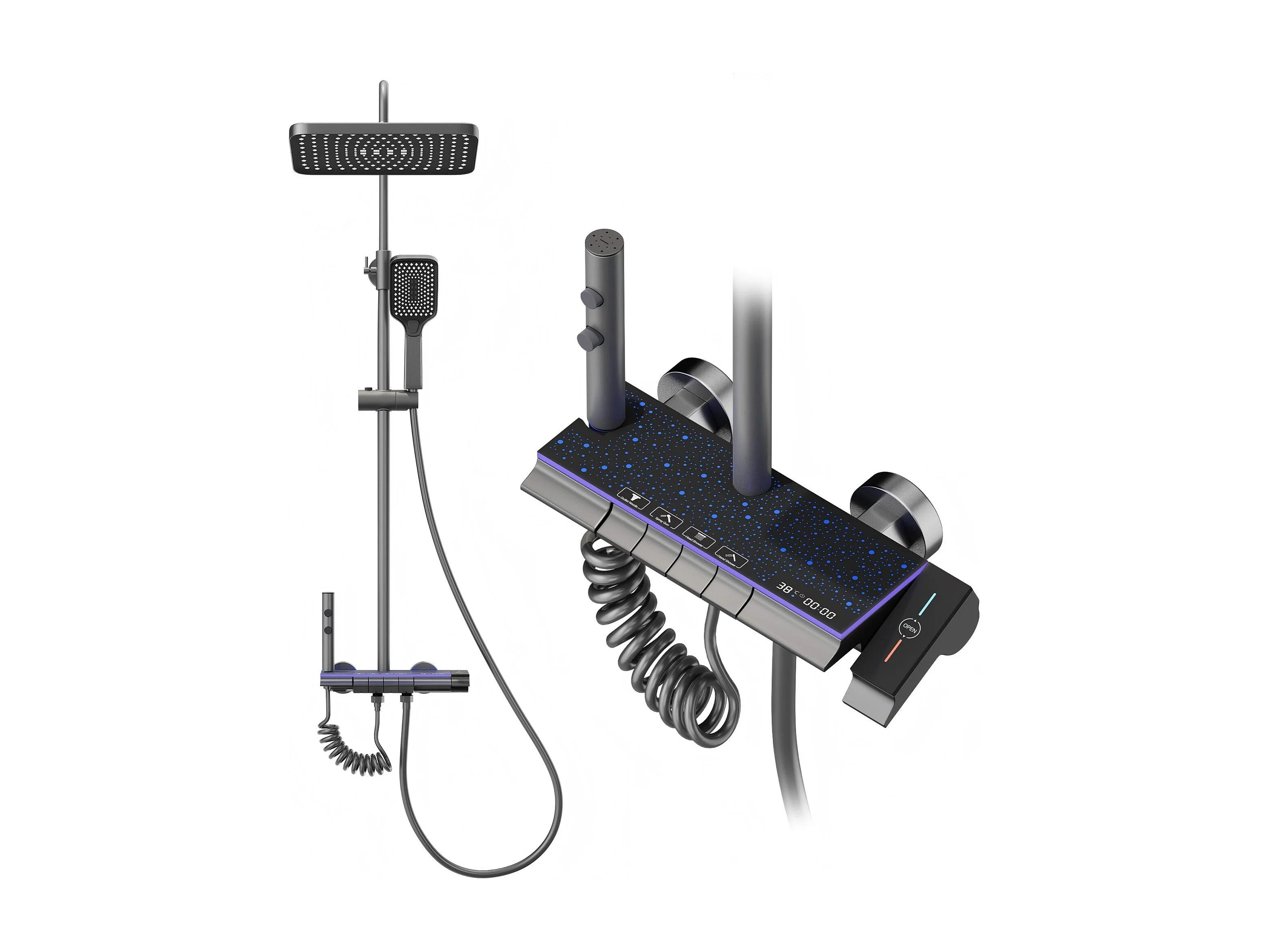 Colonne de douche en alliage de titane gris, pomme de douche rectangulaire, 4 modes de jet, affichage LED ciel étoilé, douchette à main réglable