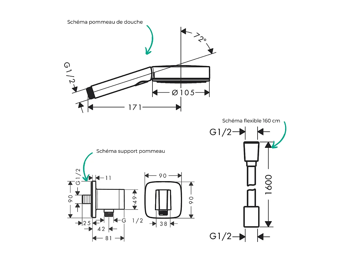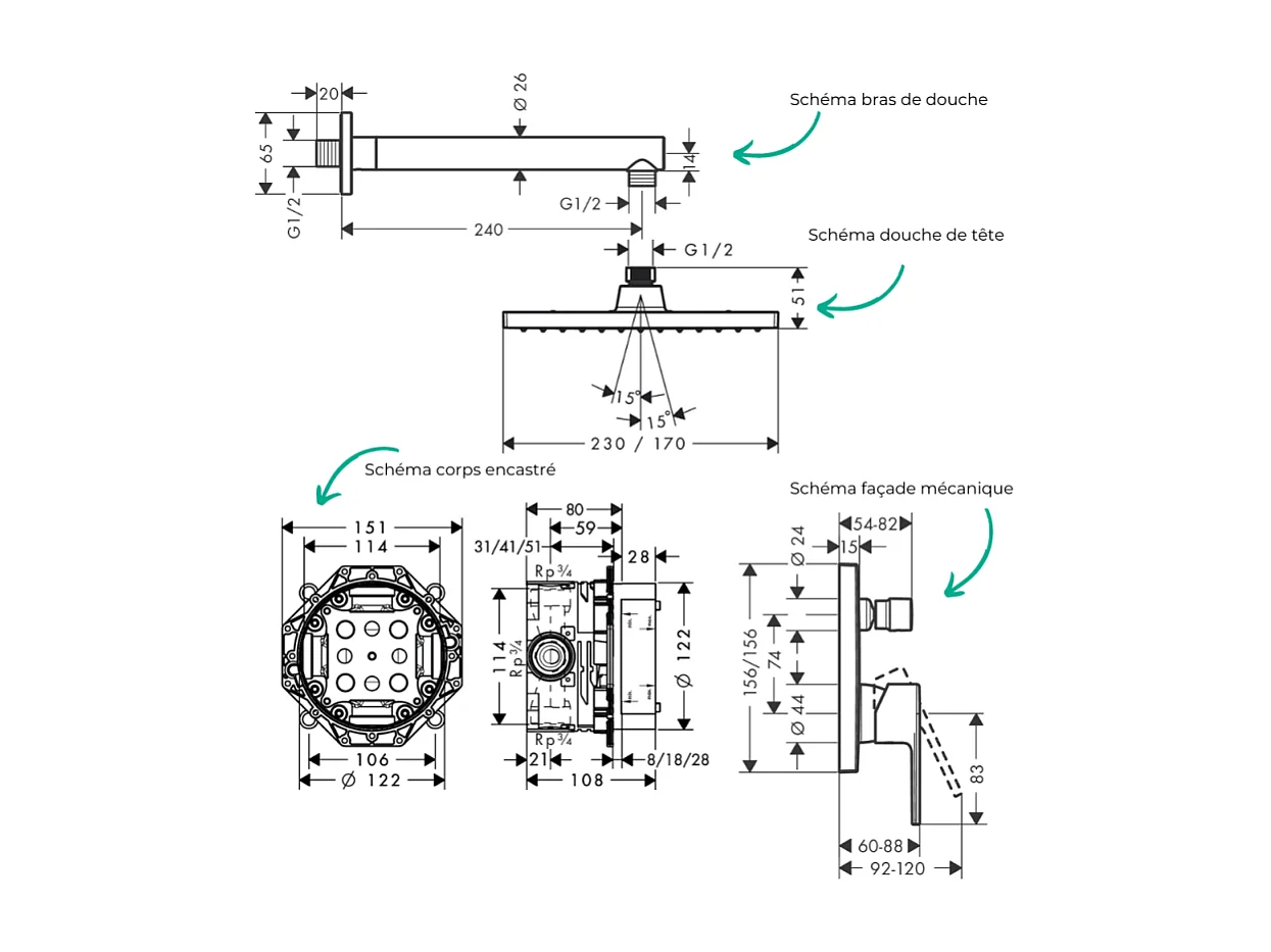Colonne de douche encastrée mécanique HANSGROHE Vernis Shape Douche de tête Vernis Shape Flexible Isiflex Douchette Pulsify chromé