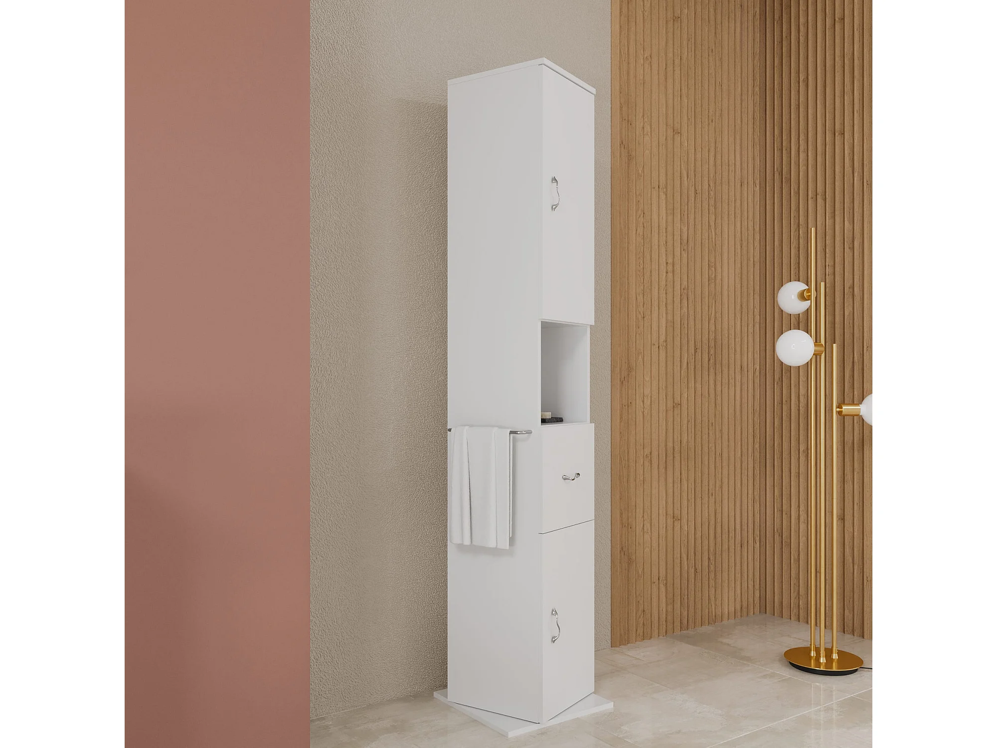 Colonne De Salle De Bains Pivotante 2 Portes, 1 Tiroir Et Compartiment Ouvert | Easy