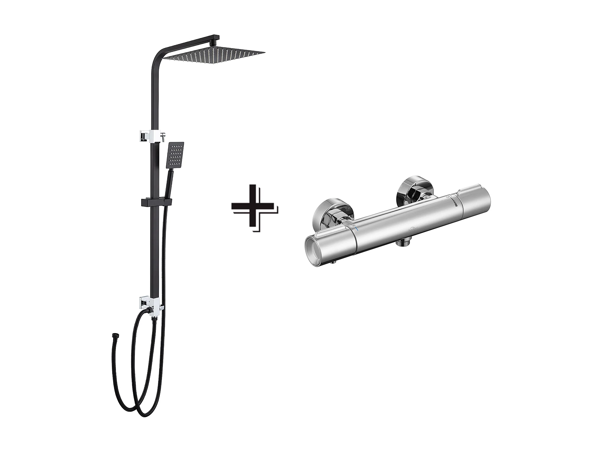 Colonne Douche Noir,Sans Mitigeur,Hauteur Réglable 690-1130cm+Mitigeur Thermostatique Douche Bouton Sécurisé à 38°C,Chromé