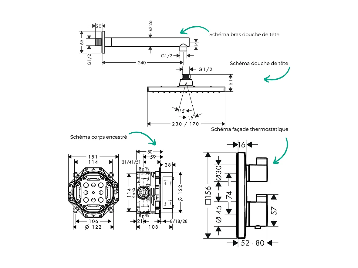 Colonne douche thermostatique HANSGROHE Ecostat Square Douche de tête Vernis Shape Flexible Designflex Douchette Pulsify chromé