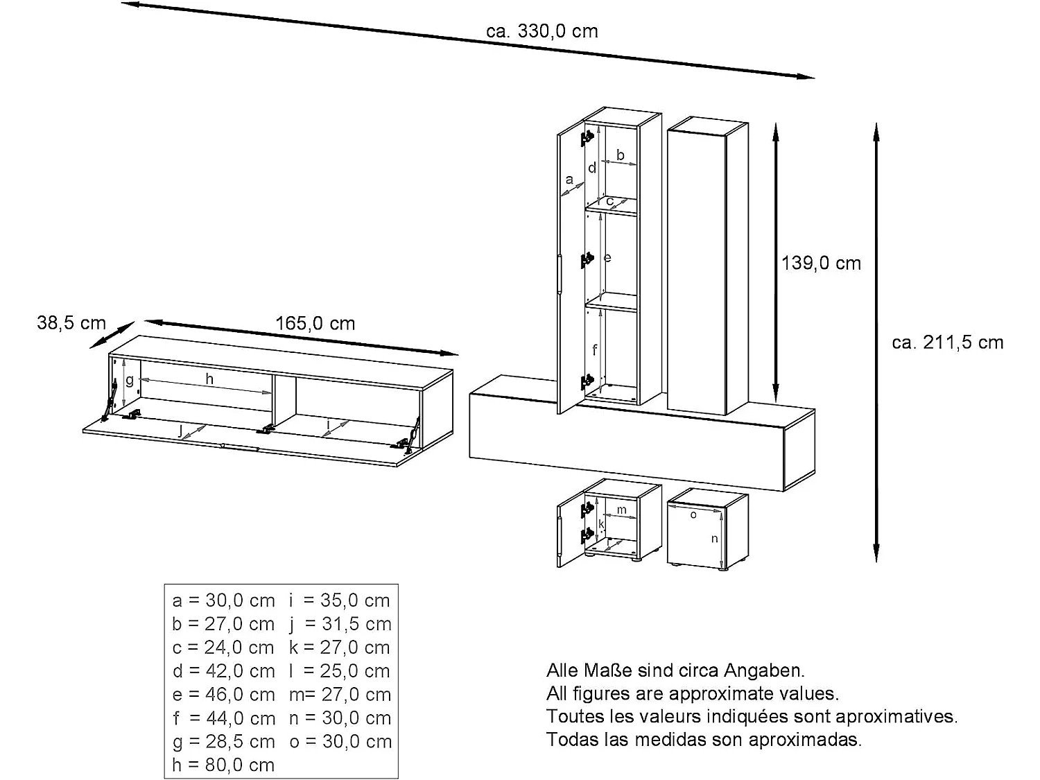 Combinaison Murale Corps en Blanc Mat/Façades en Blanc Haute Brillance et Avola-Anthracite (HxLxP): 204 x 330 x 39