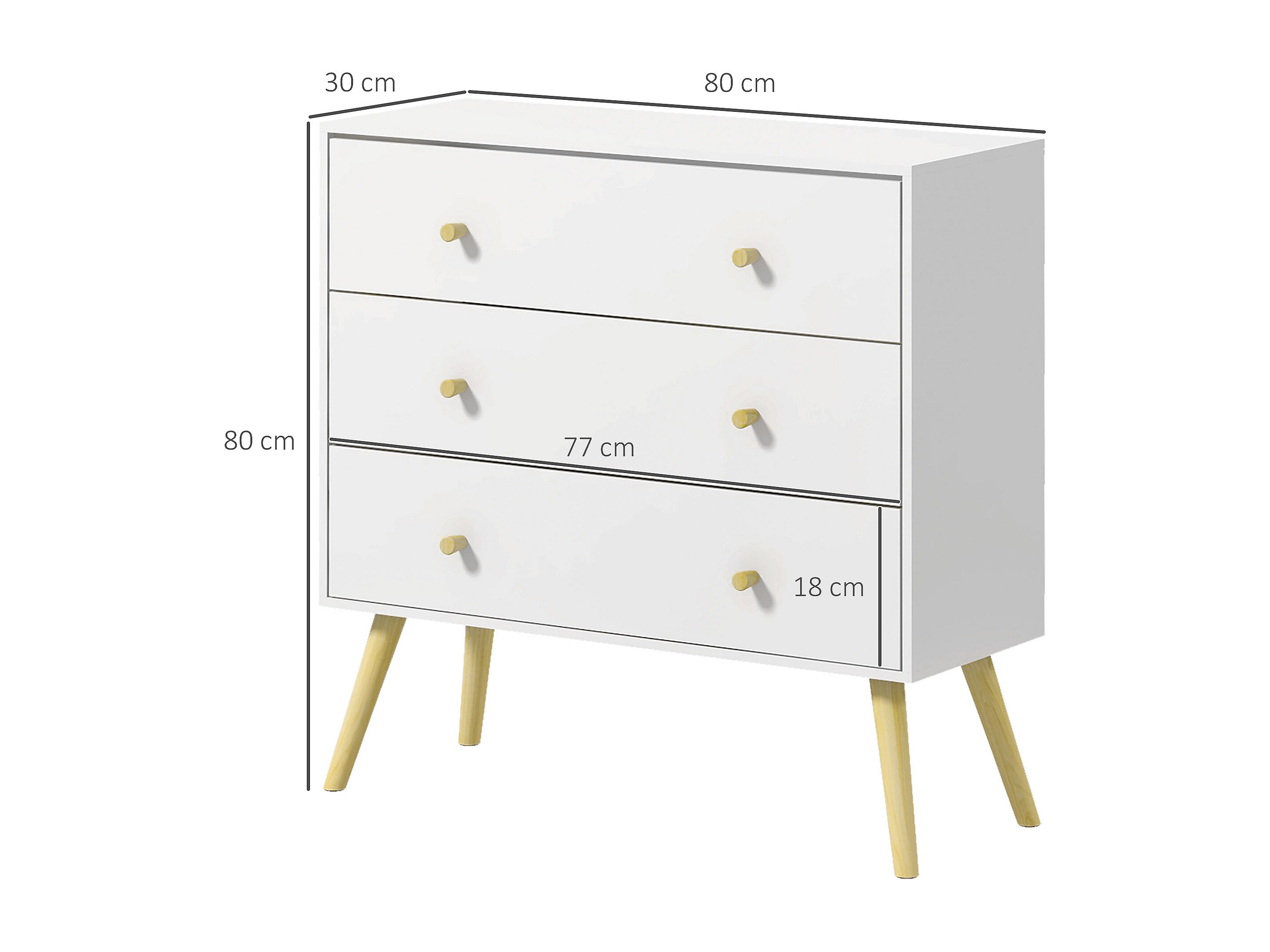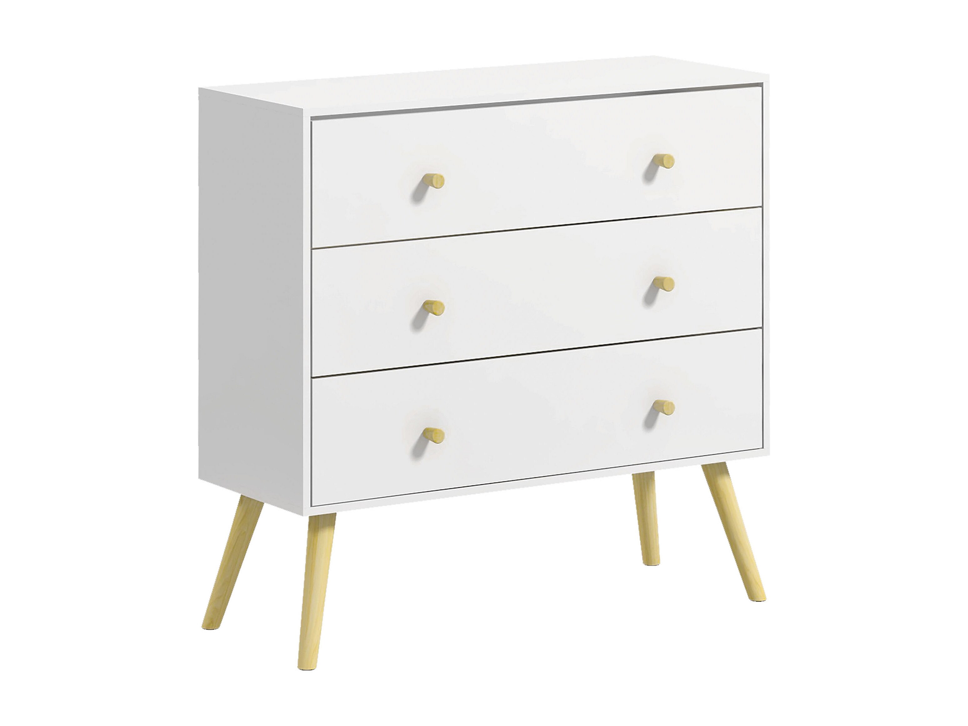 Commode 3 tiroirs design scandinave piètement effilé incliné bois pin panneaux blanc