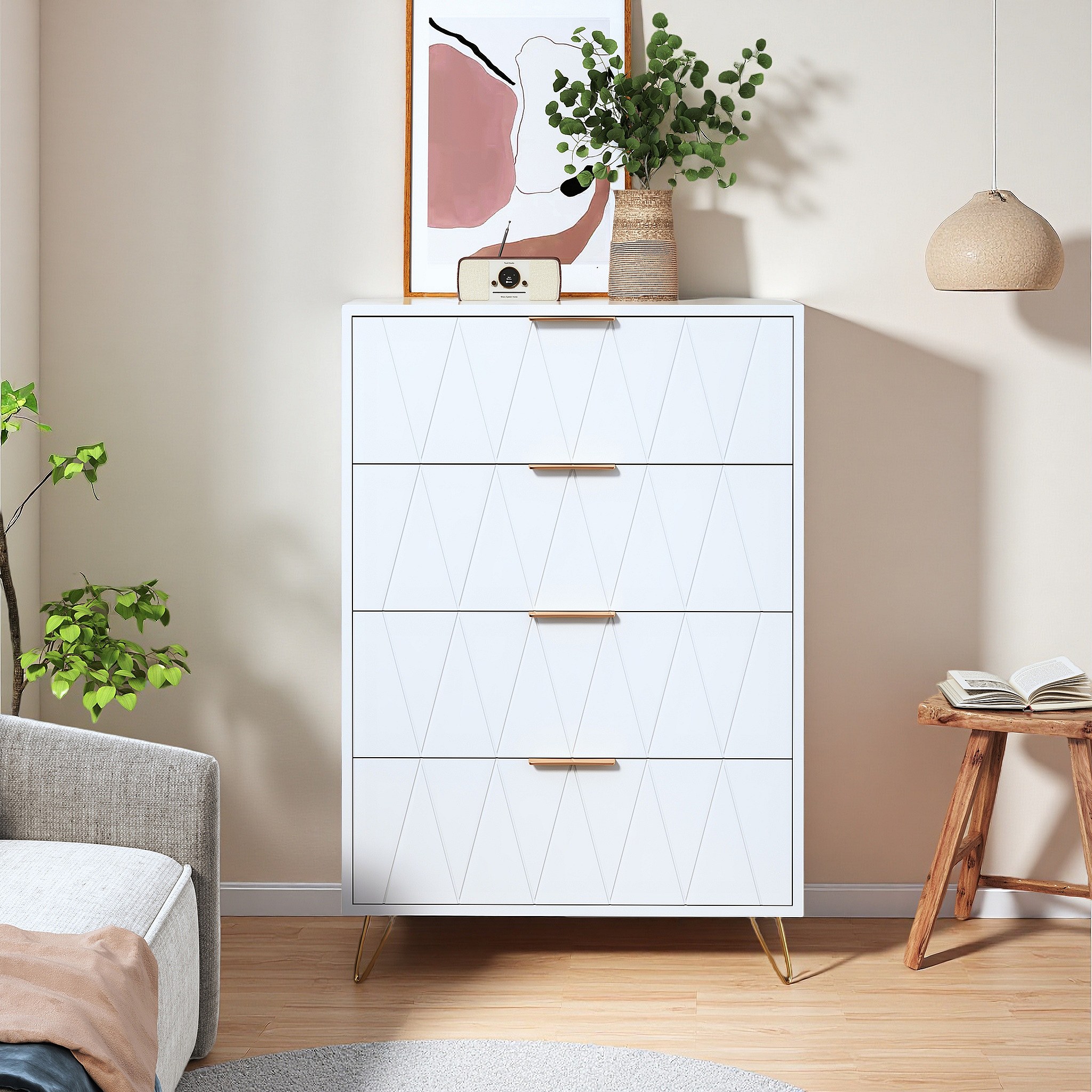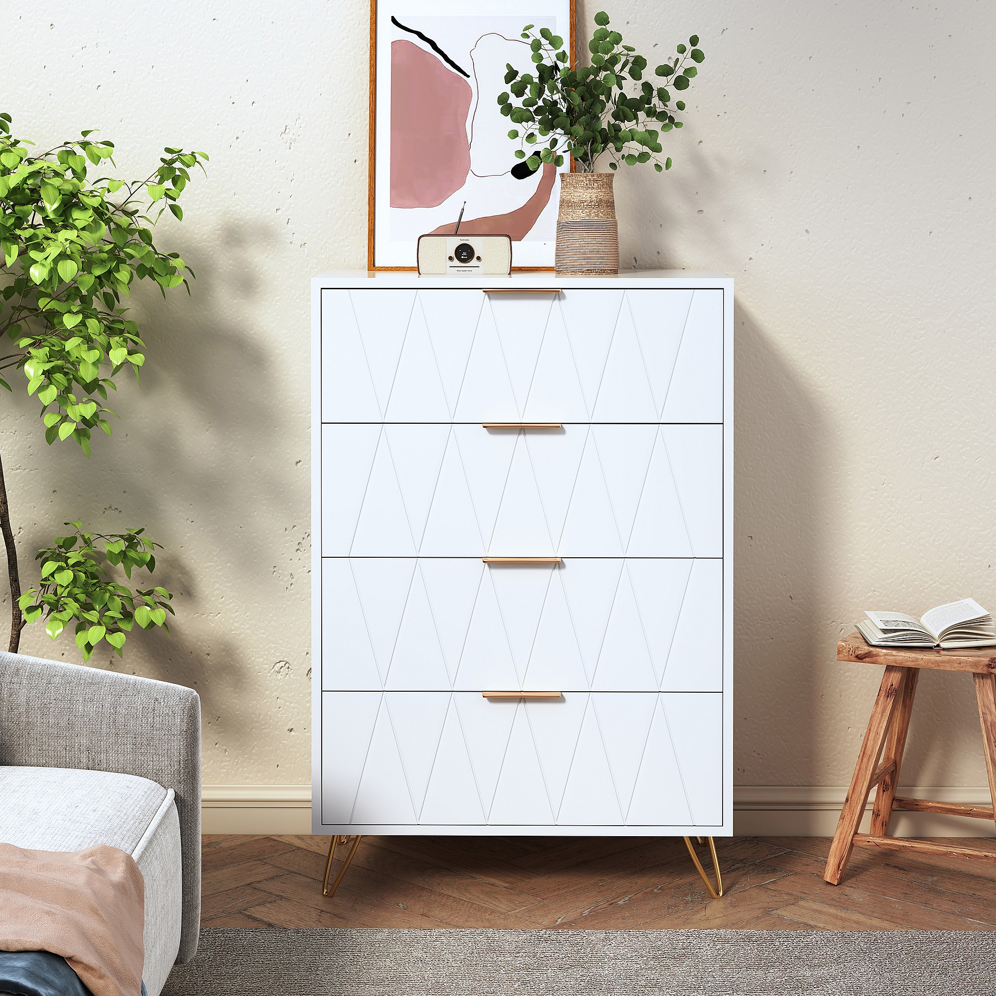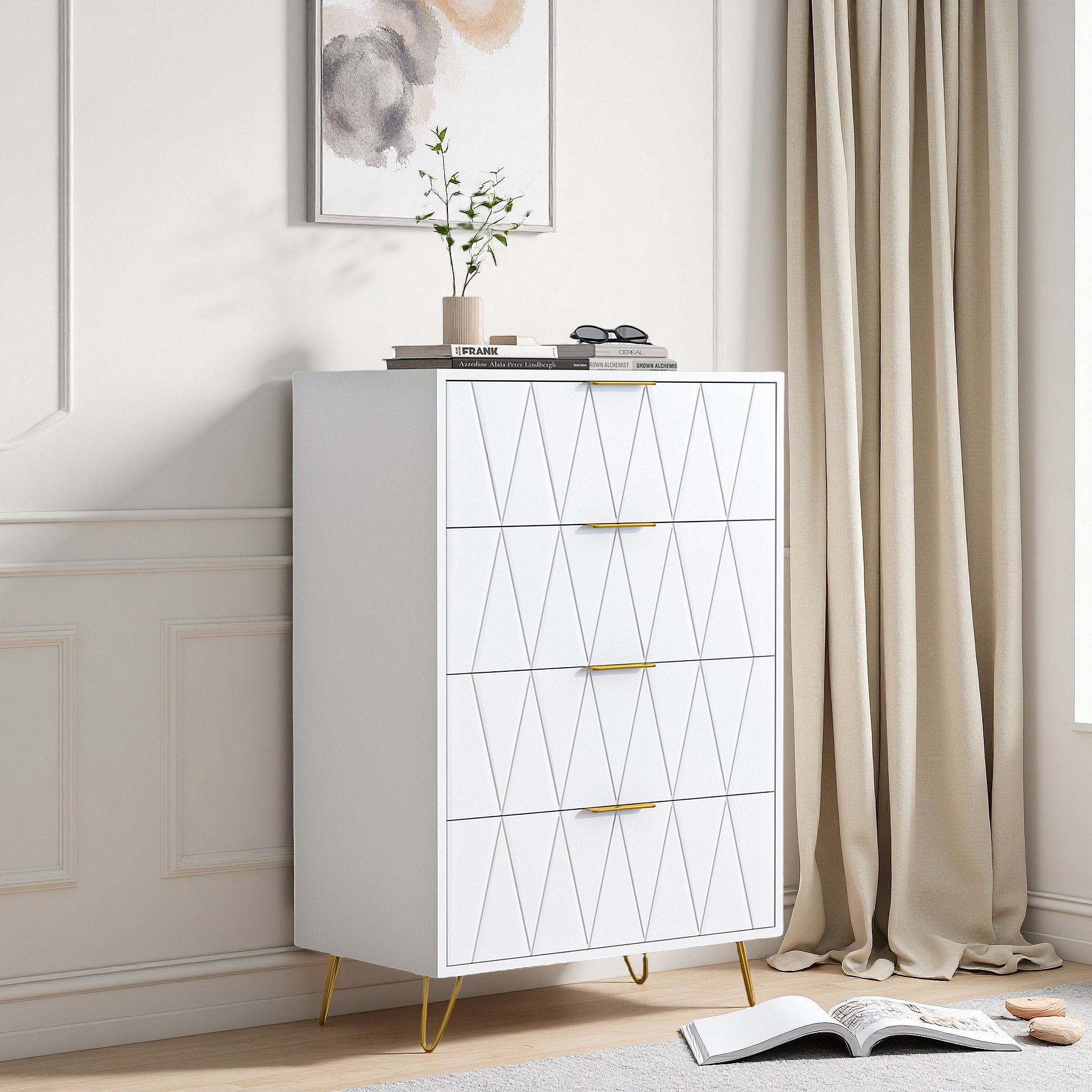 Commode 4 tiroirs blanche avec façades à motif losange en relief, panneaux mélaminés, grande capacité de rangement et robuste