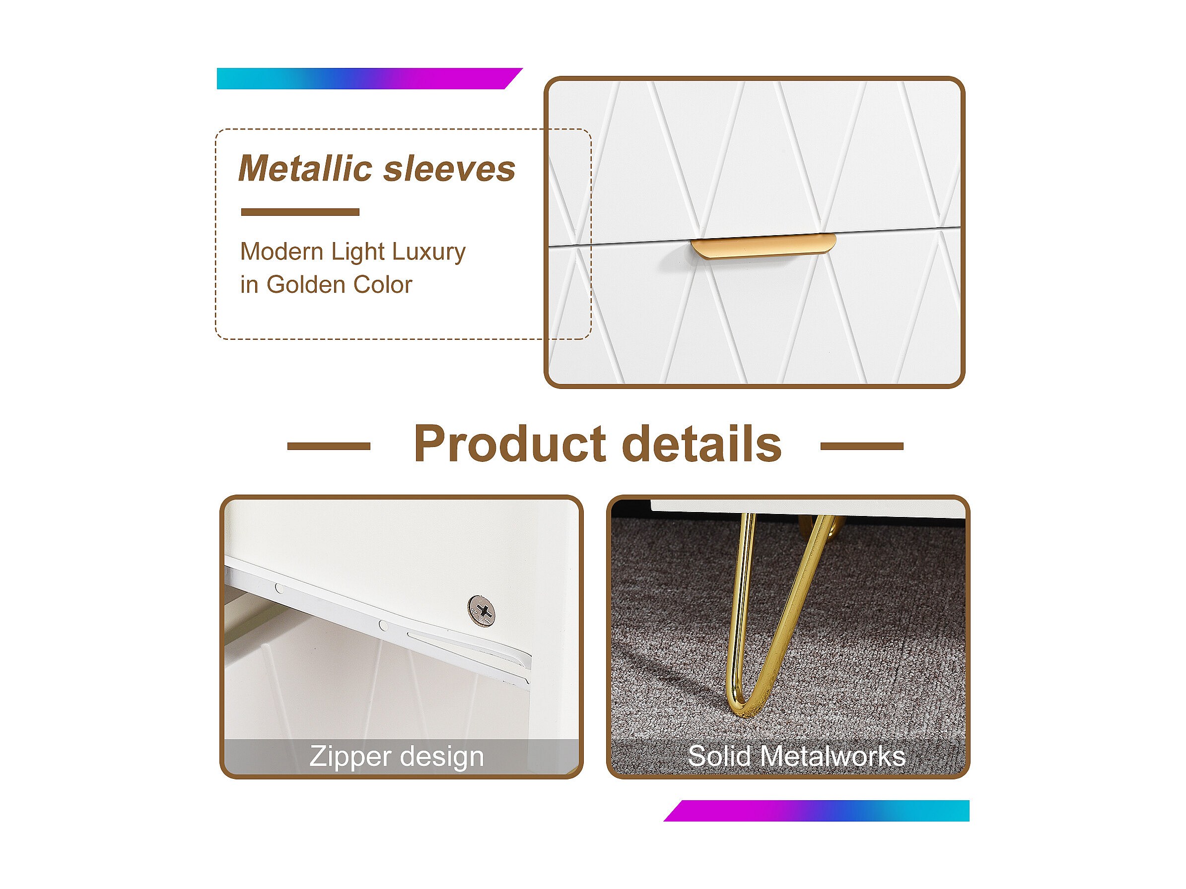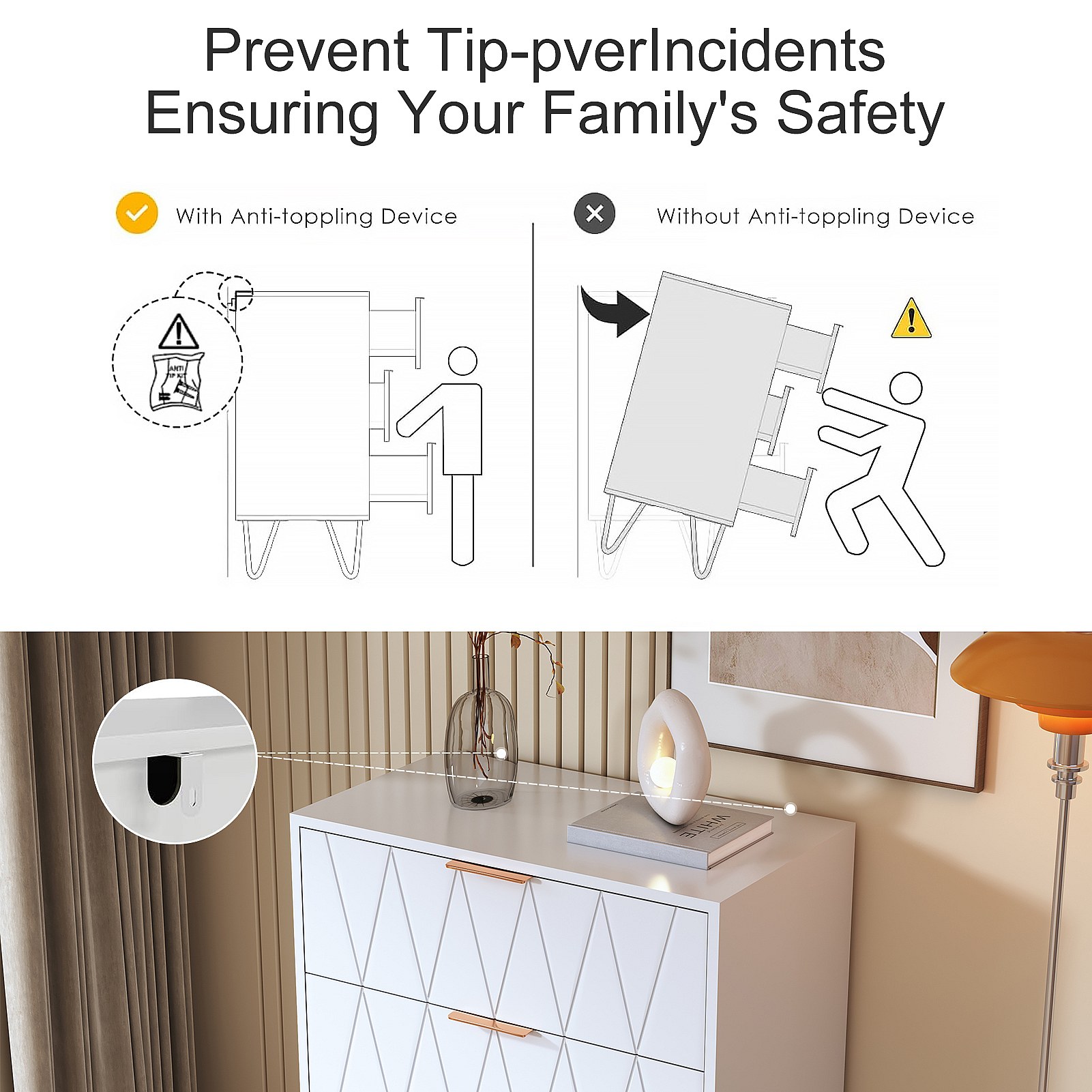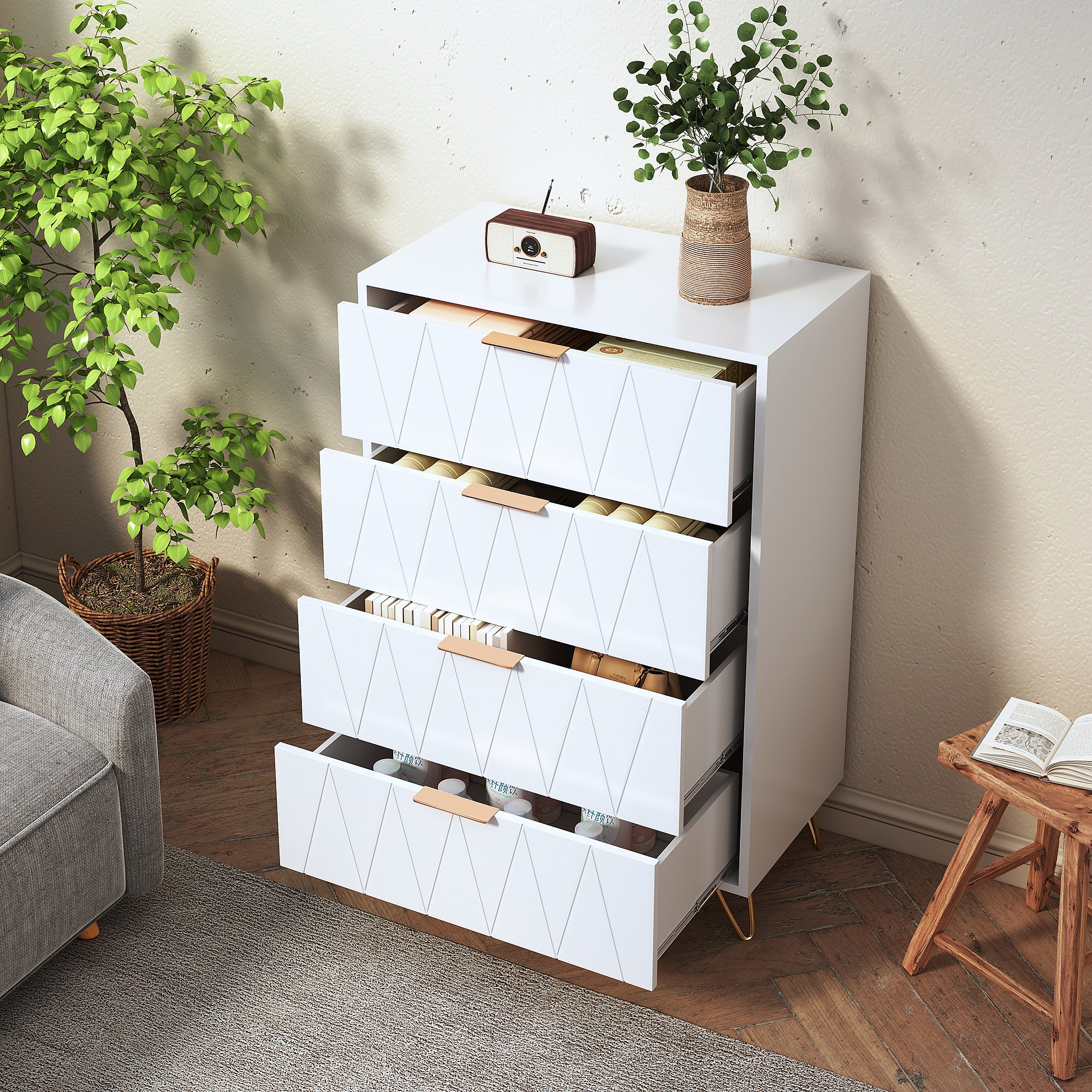 Commode 4 tiroirs blanche avec façades à motif losange en relief, panneaux mélaminés, grande capacité de rangement et robuste