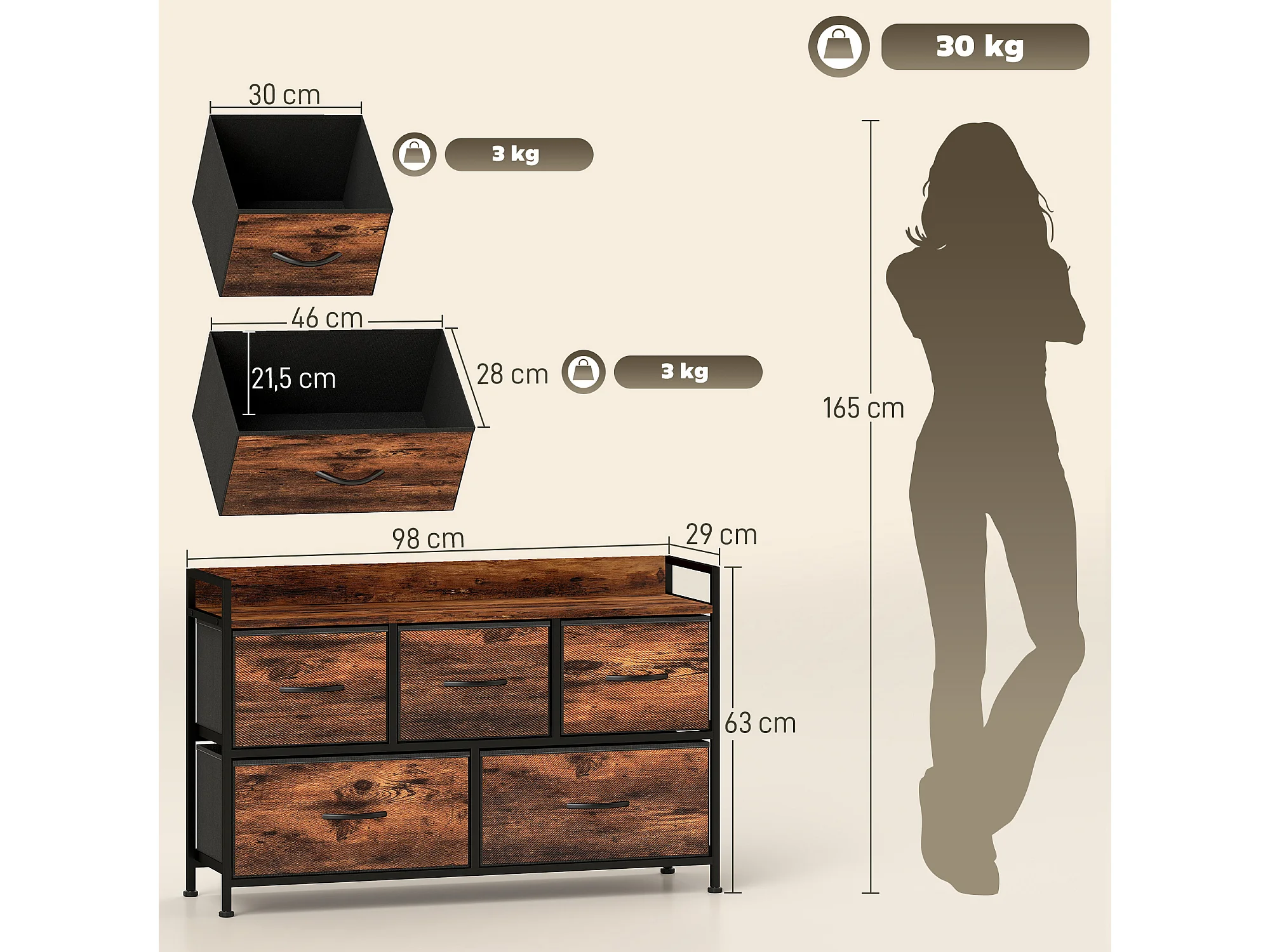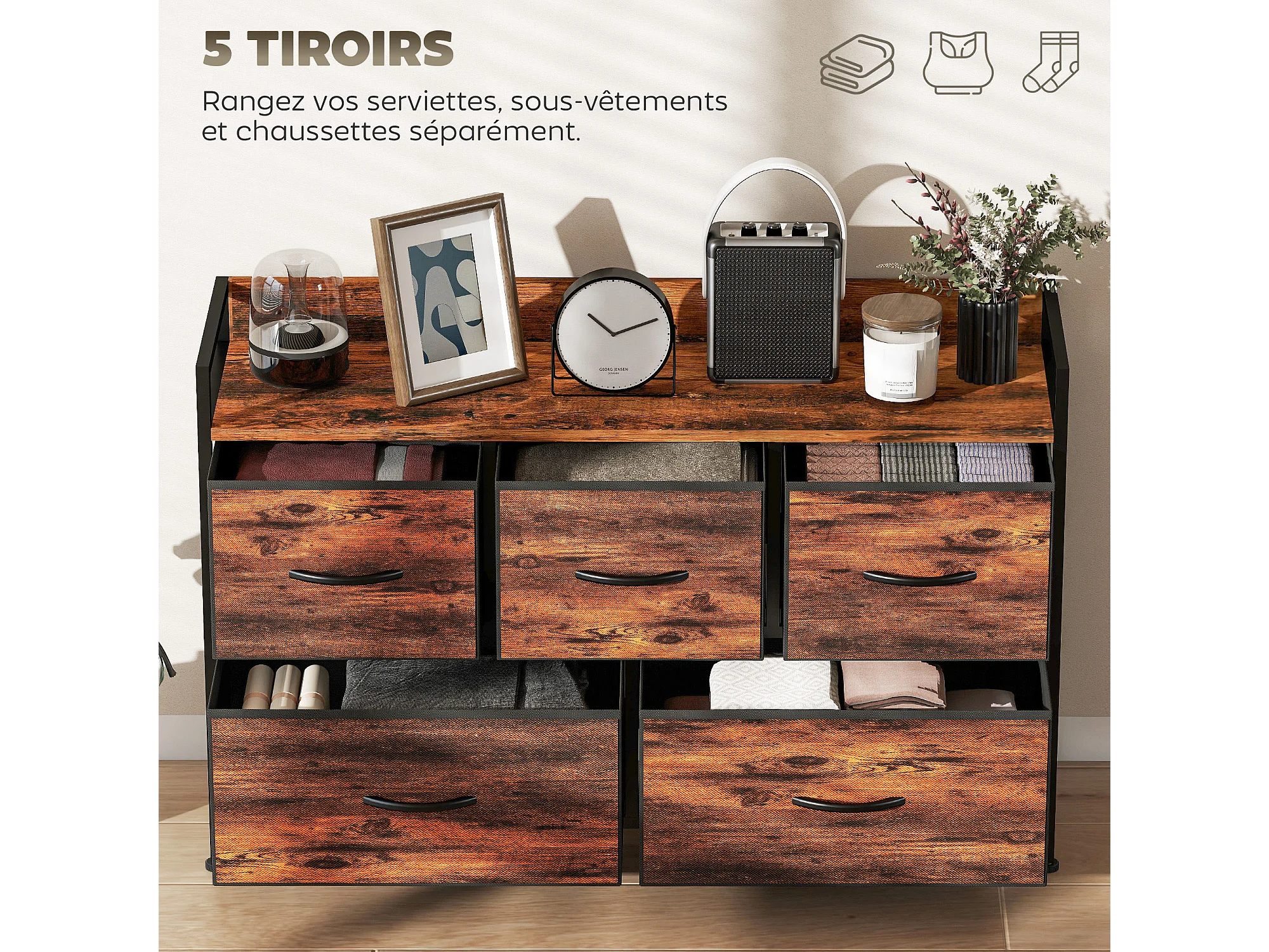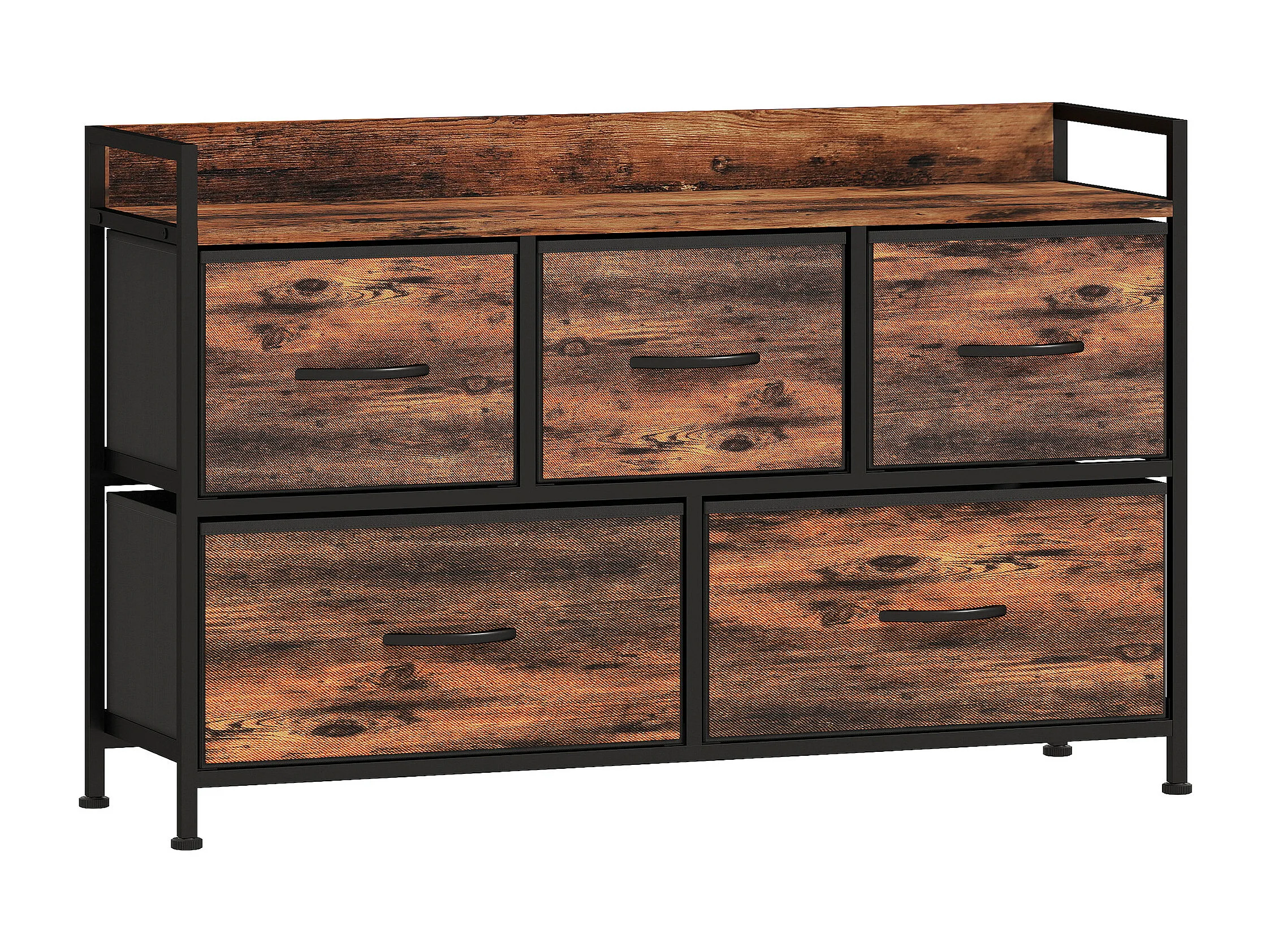 Commode 5 tiroirs et étagère - 98 x 29 x 63 cm - châssis métal noir tiroirs non tissés aspect bois vieilli