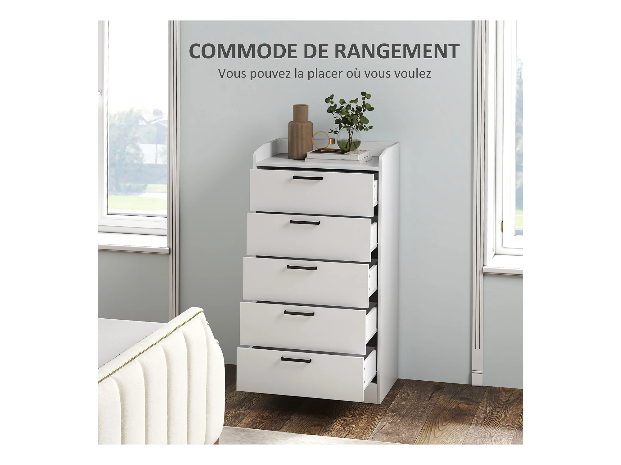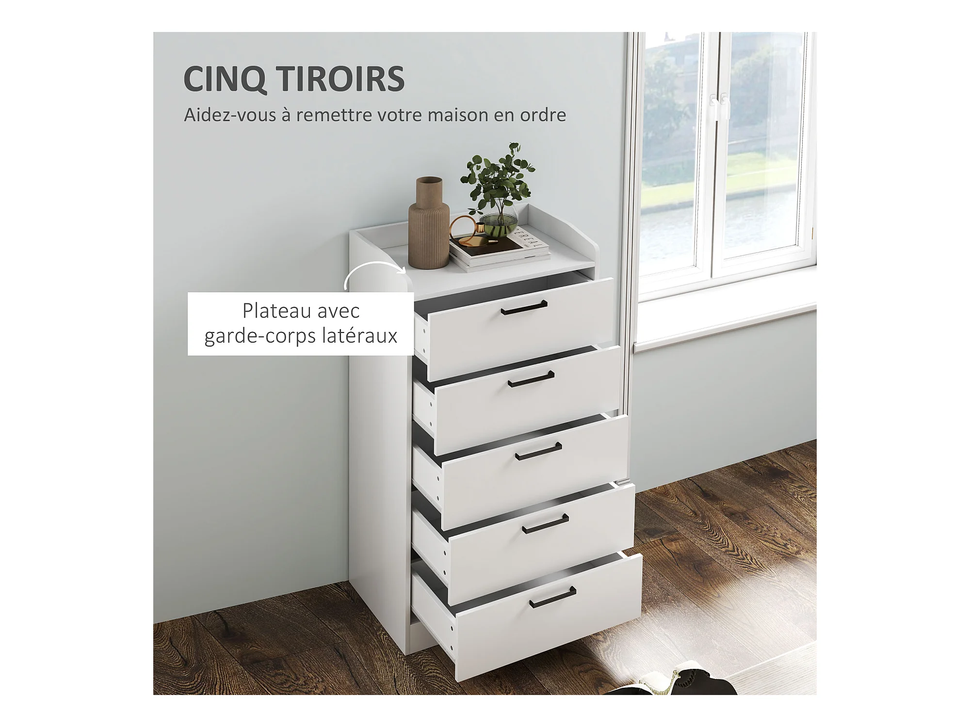 Commode 5 tiroirs et plateau - meuble de rangement bureau - poignées métal noir MDF blanc
