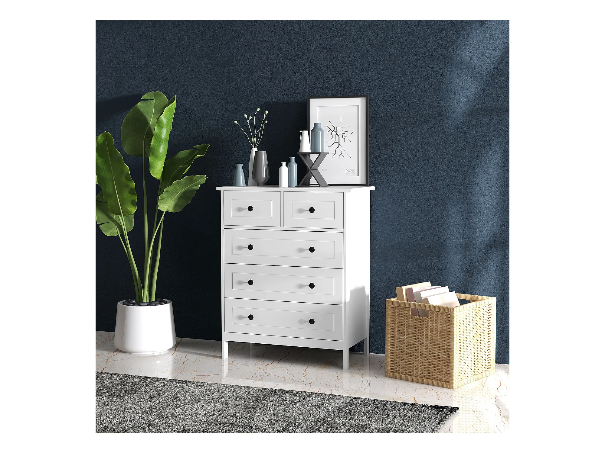 Commode 5 tiroirs style contemporain poignées boutons métal noir MDF panneaux blanc