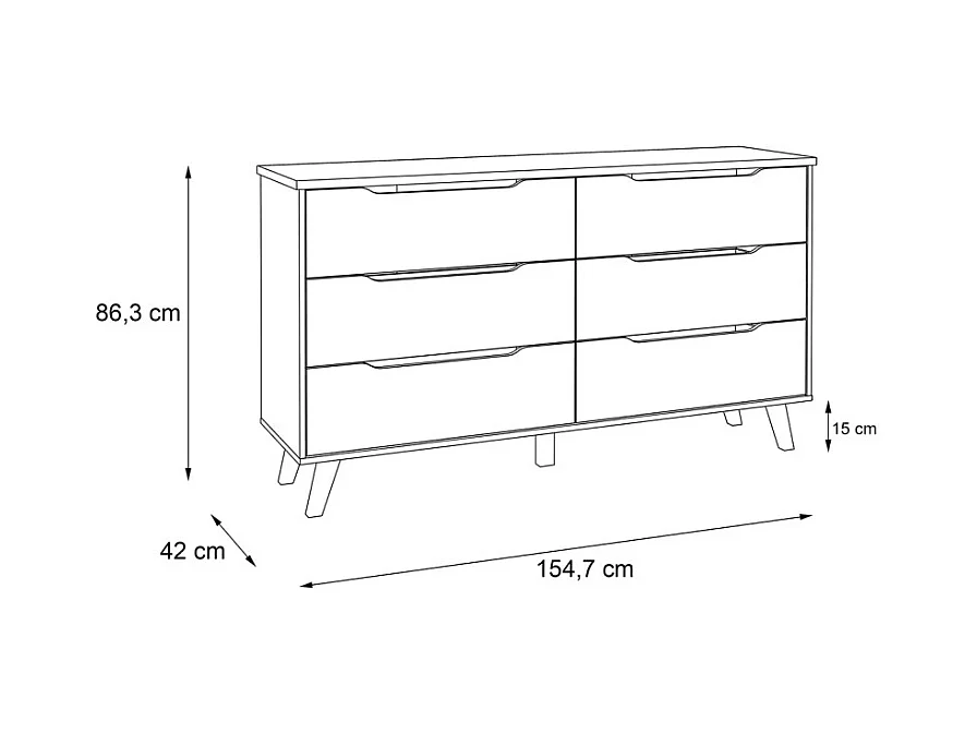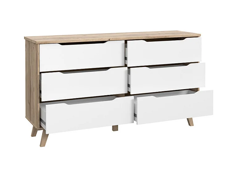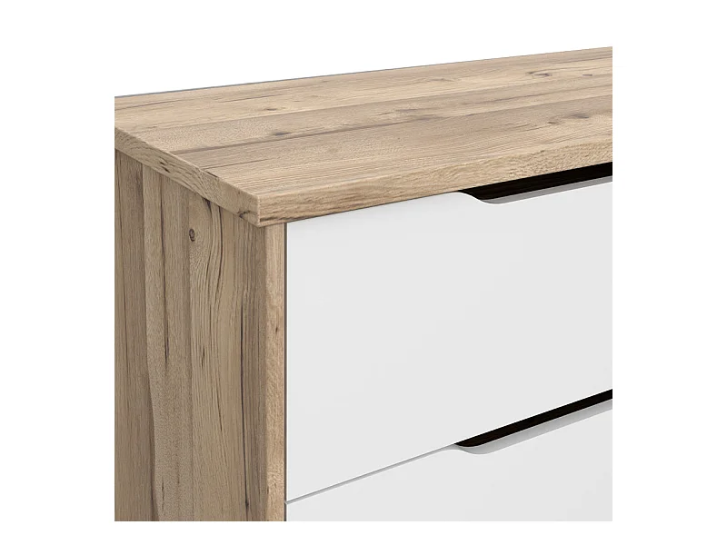 Commode 6 tiroirs décor chêne et blanc pieds bois massif - ALBANE