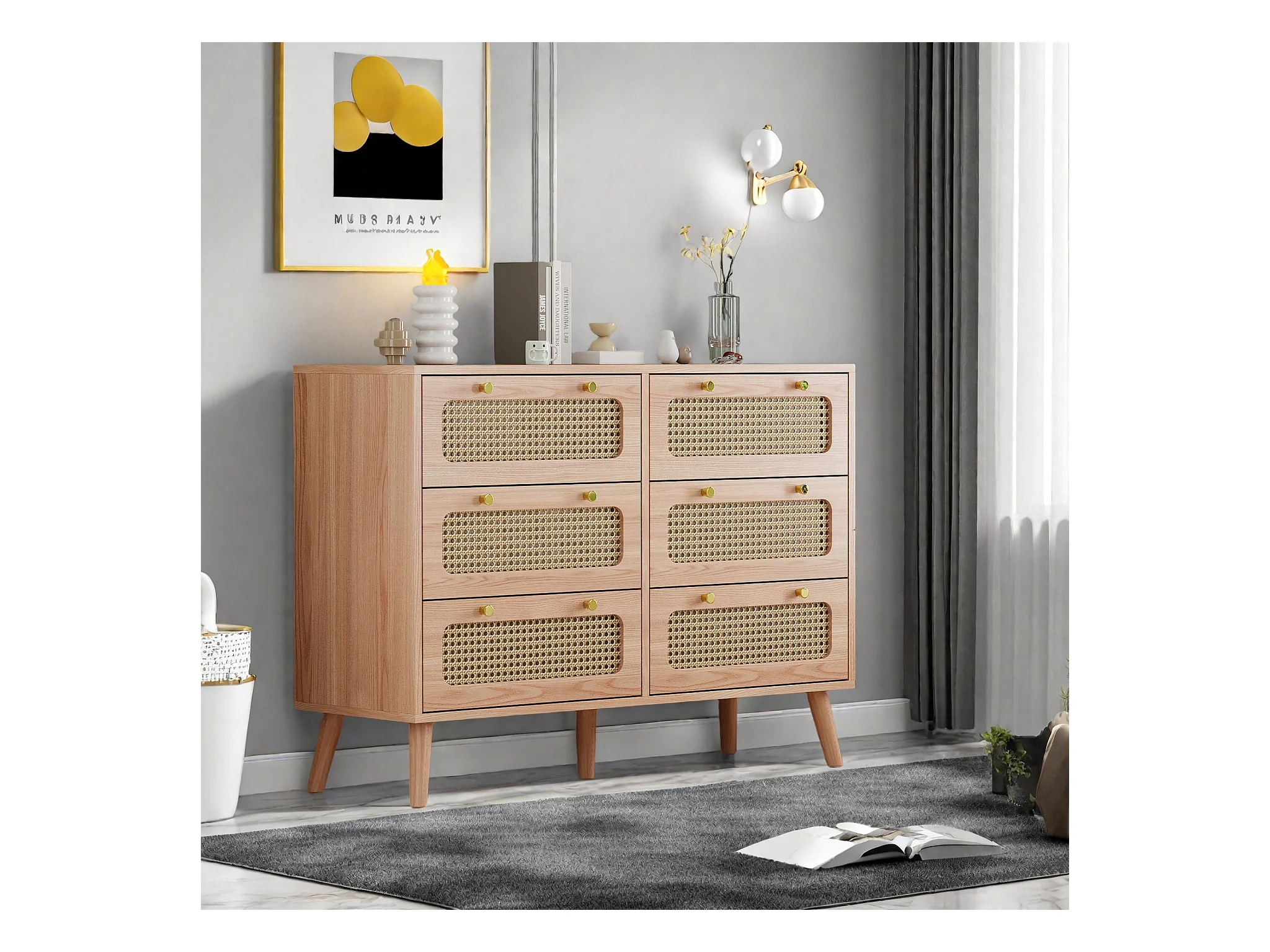 Commode 6 tiroirs en bois naturel avec façades en rotin tressé, cadre en bois massif