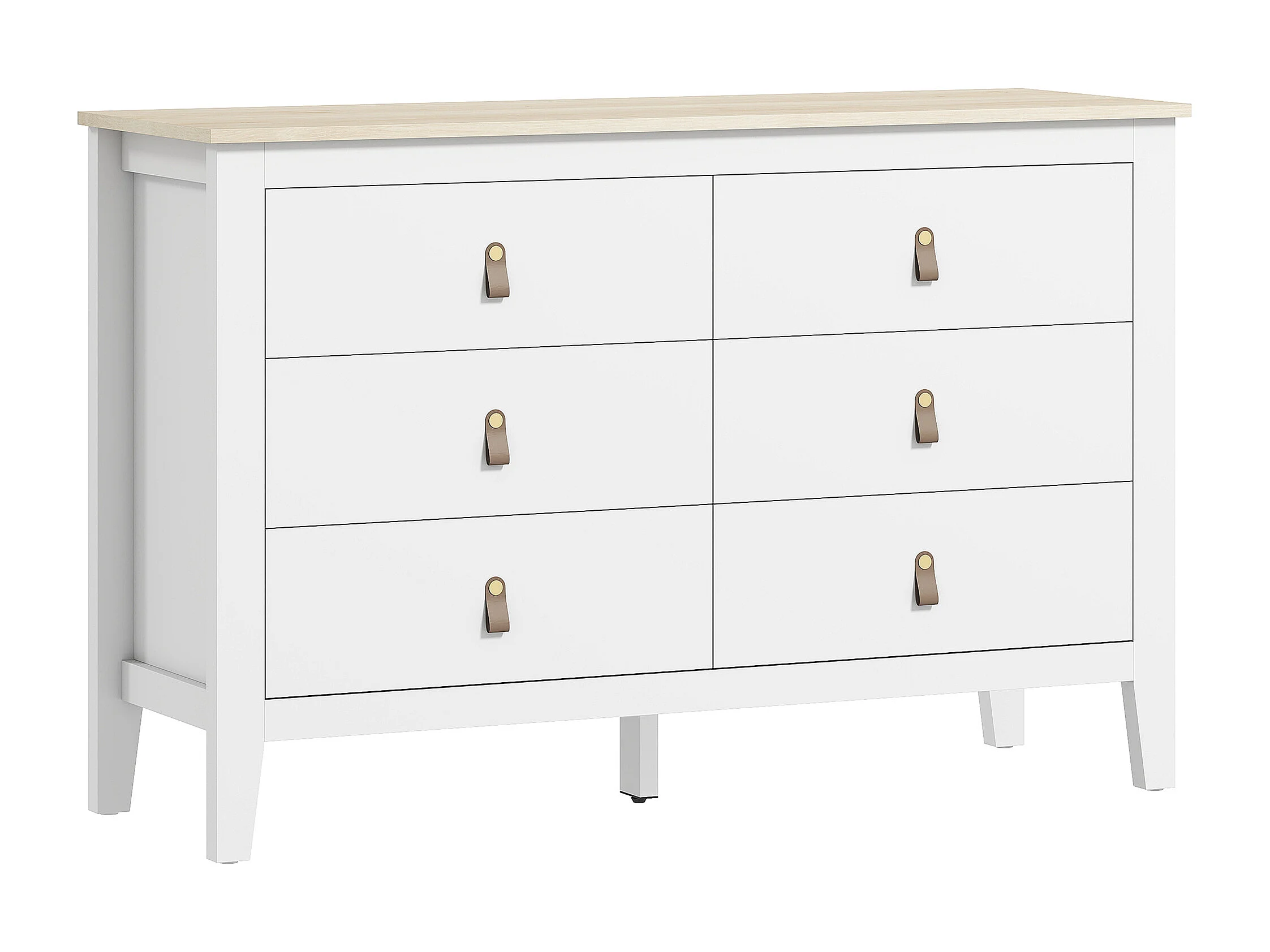Commode 6 tiroirs sur pieds dim. 120 x 40 x 78 cm poignées PU métal doré blanc effet bois clair