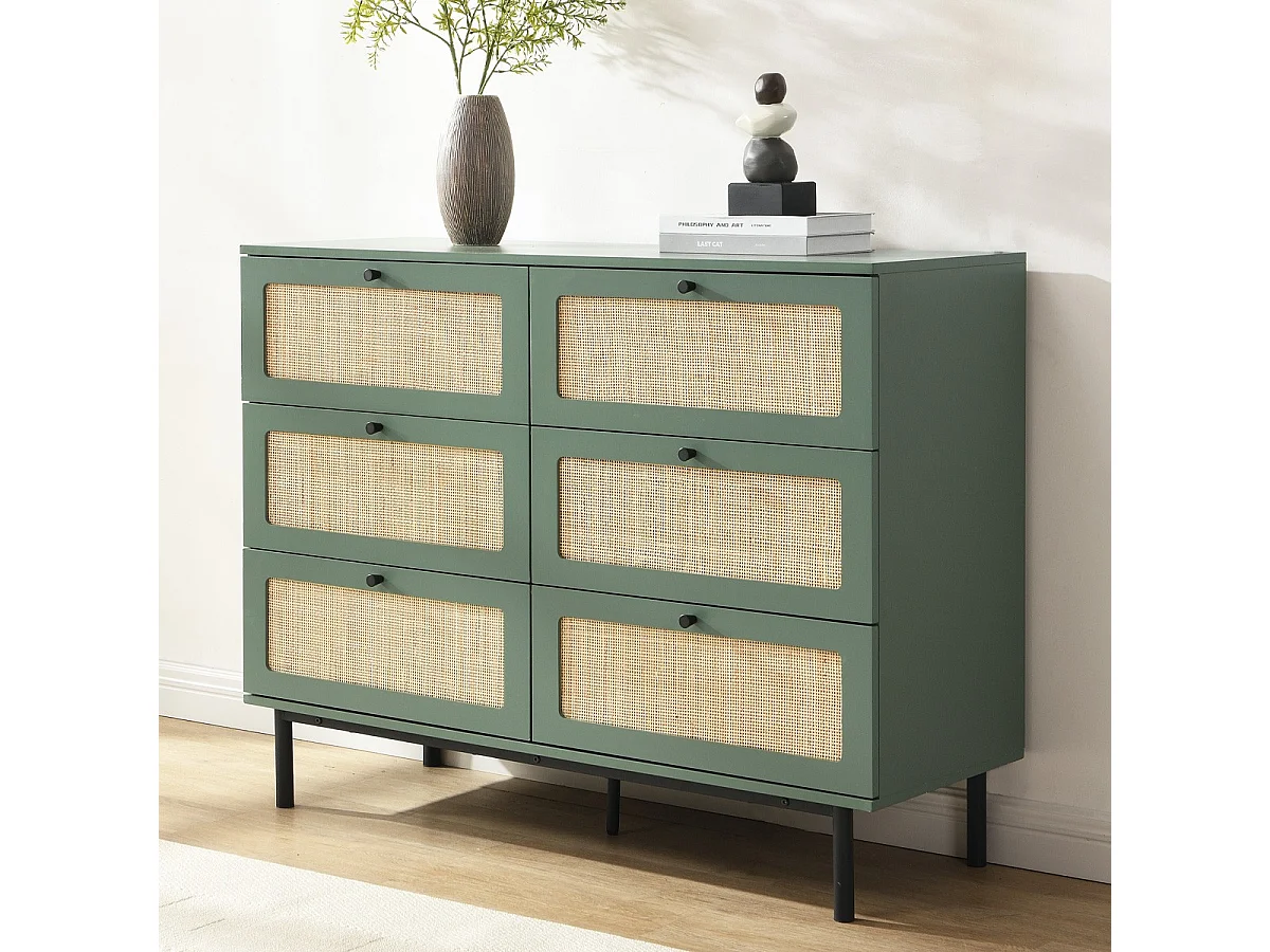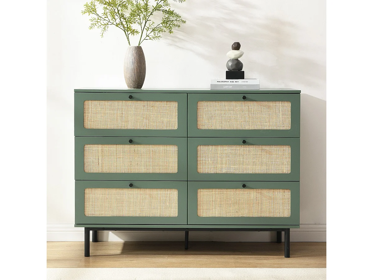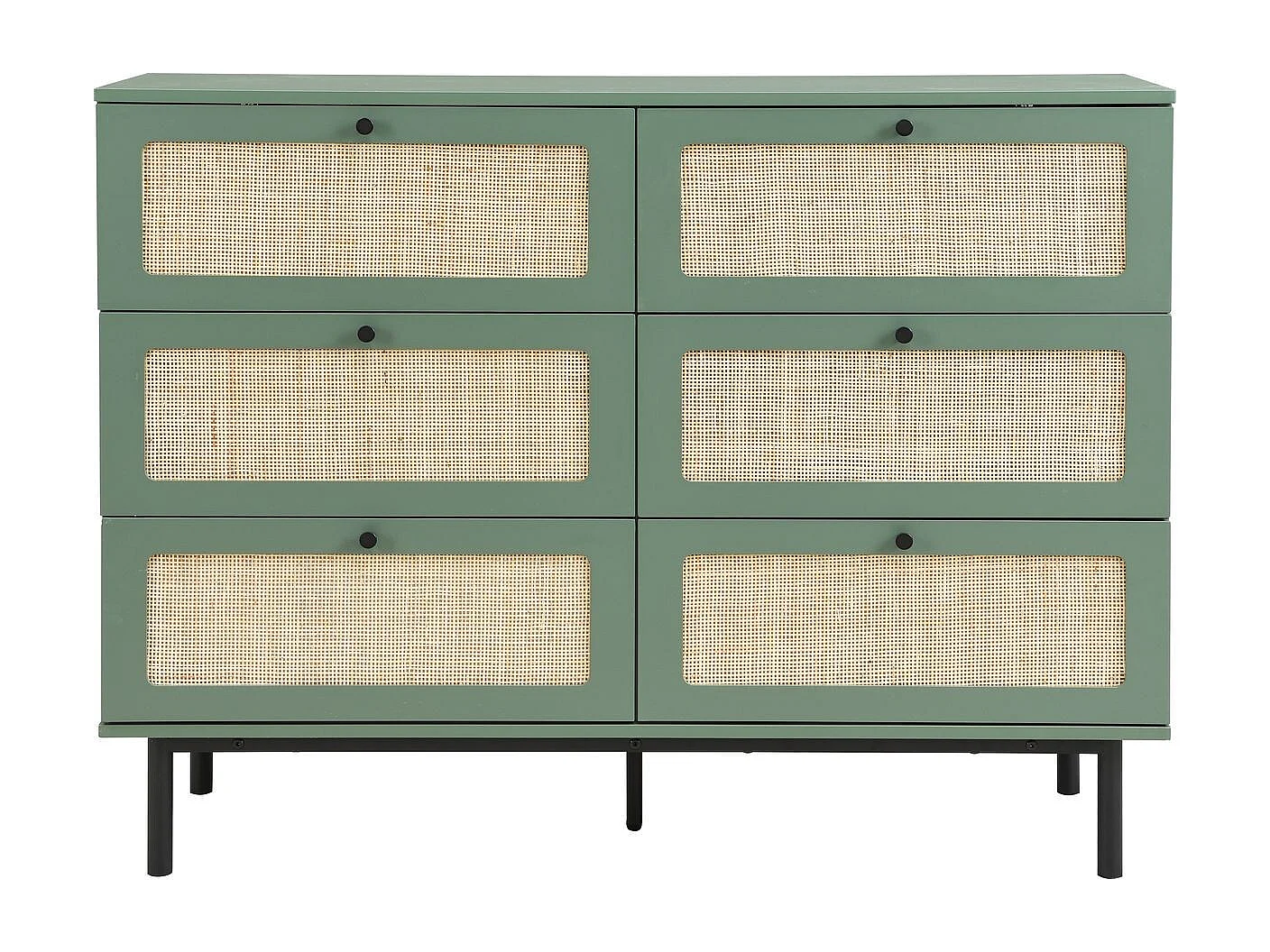 Commode 6 tiroirs vert et cannage 120 cm - Luma