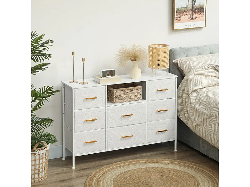 Commode 8 tiroirs en tissu beige 4 poches 2 crochets acier blanc effet bois