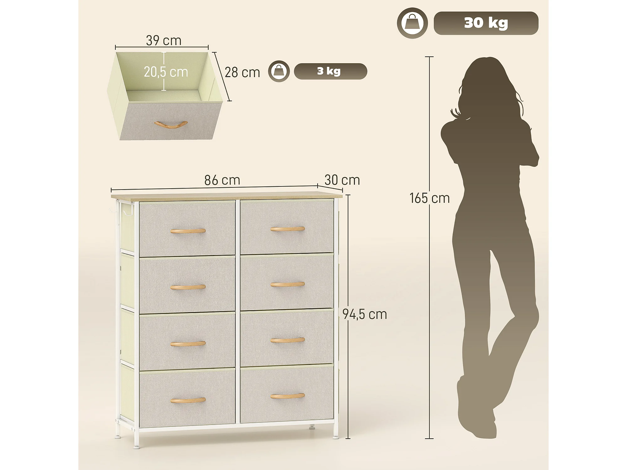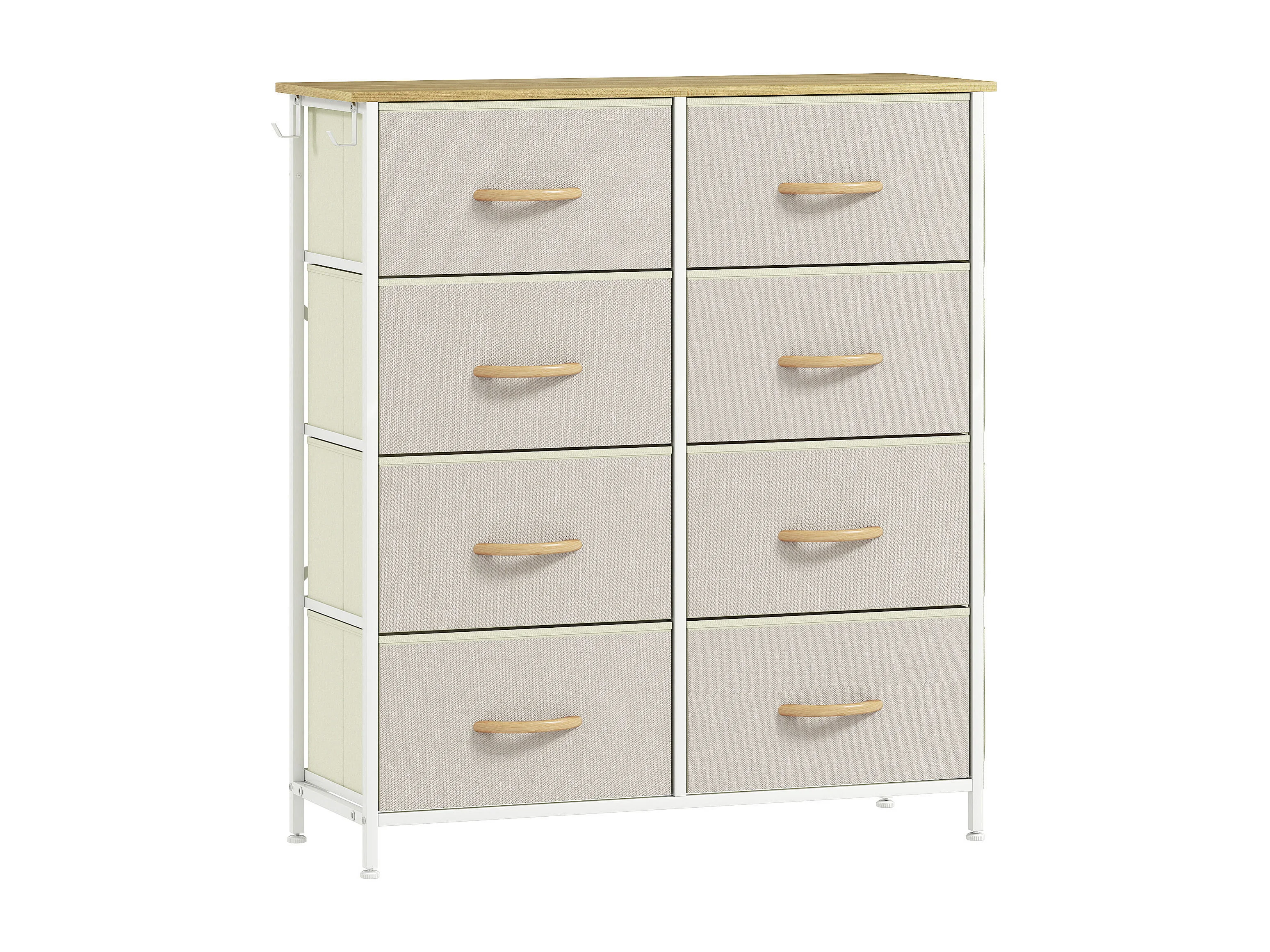 Commode 8 tiroirs en tissu beige 4 poches 2 crochets acier blanc effet bois