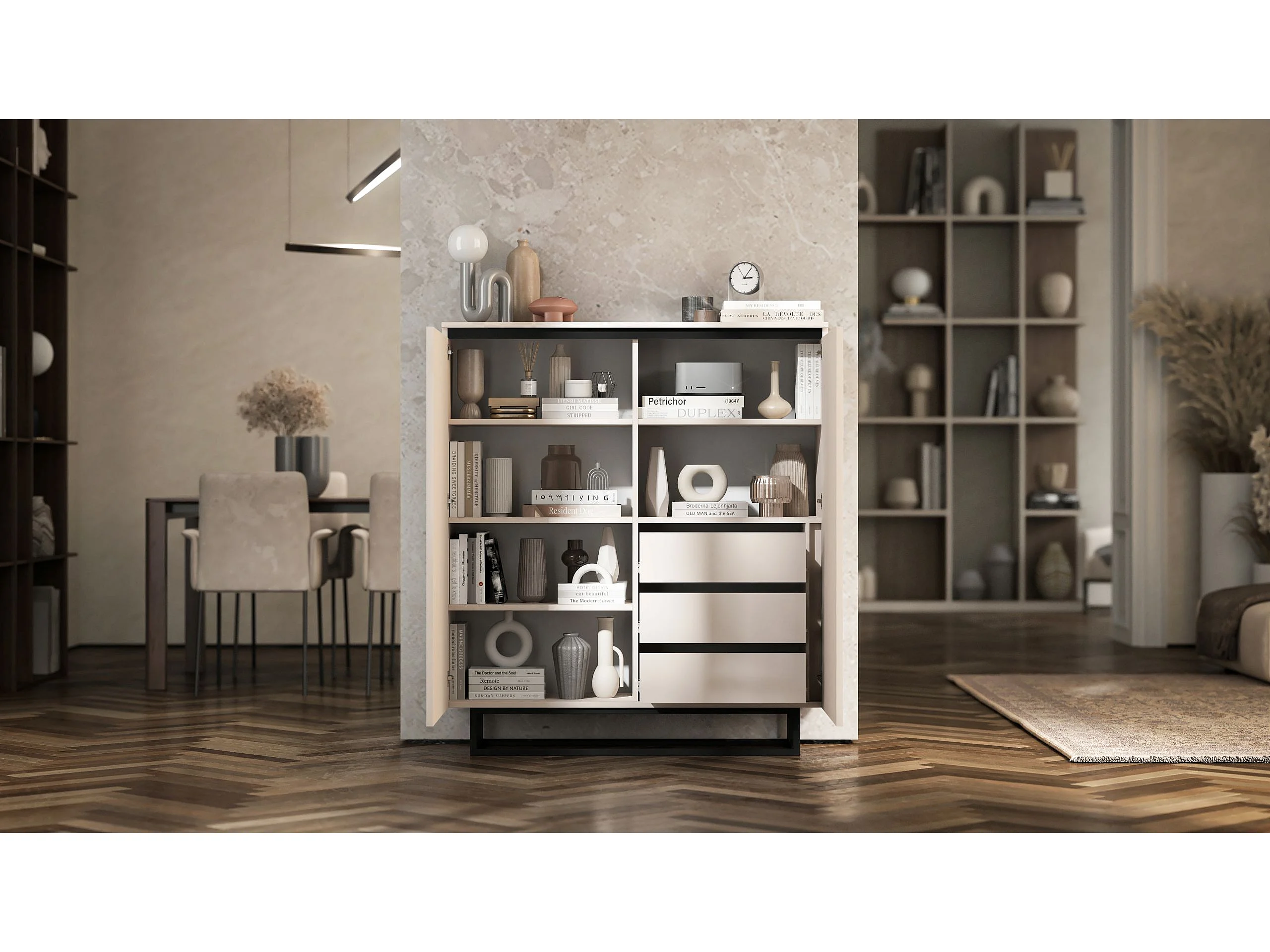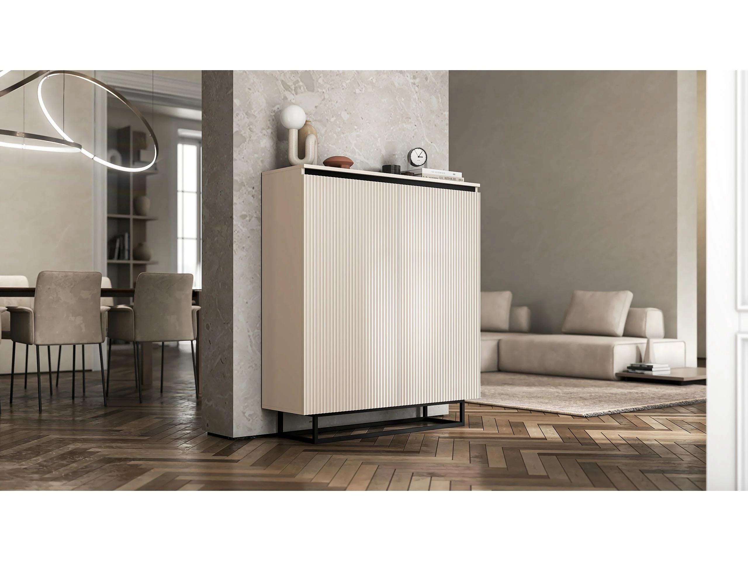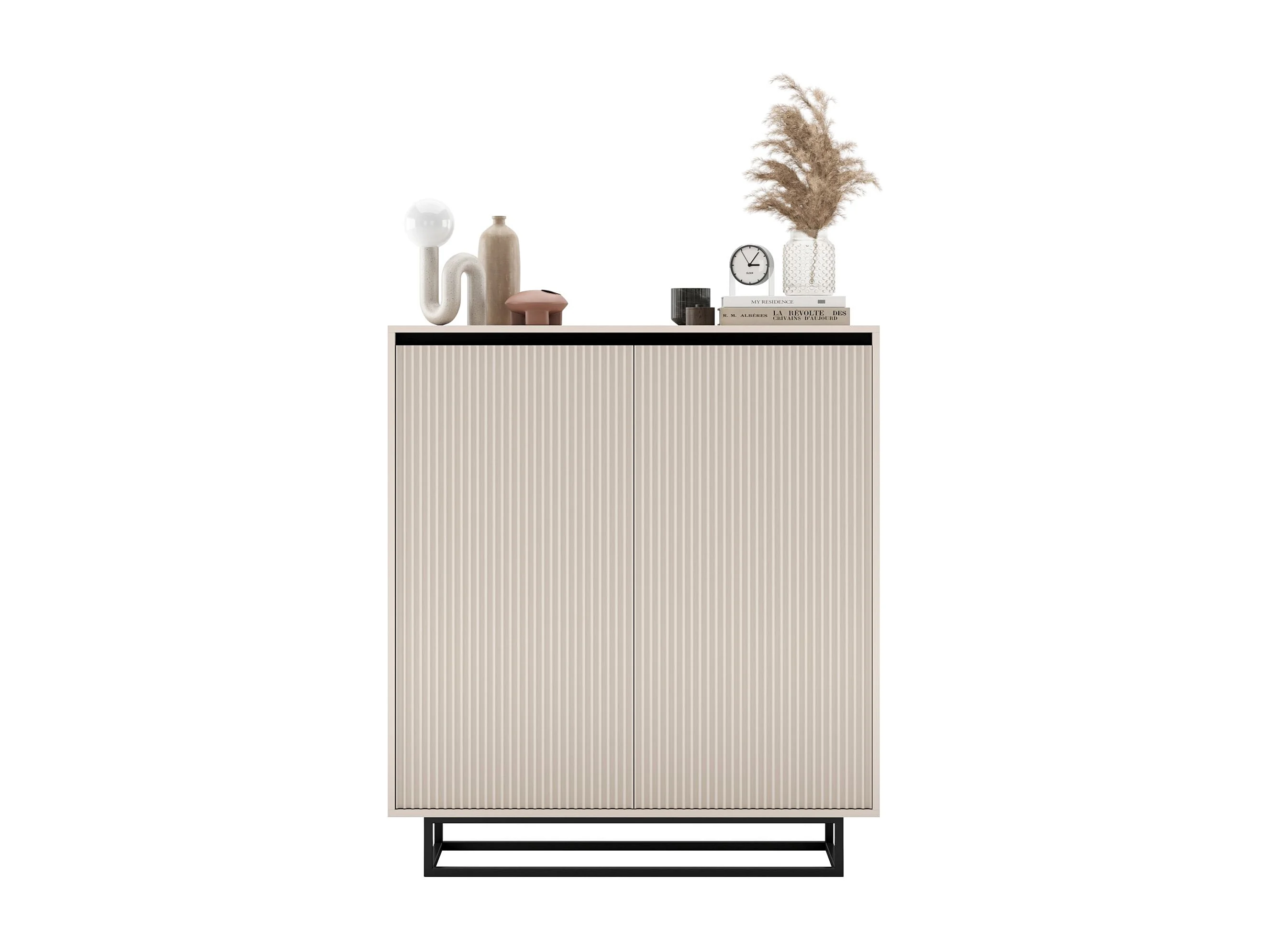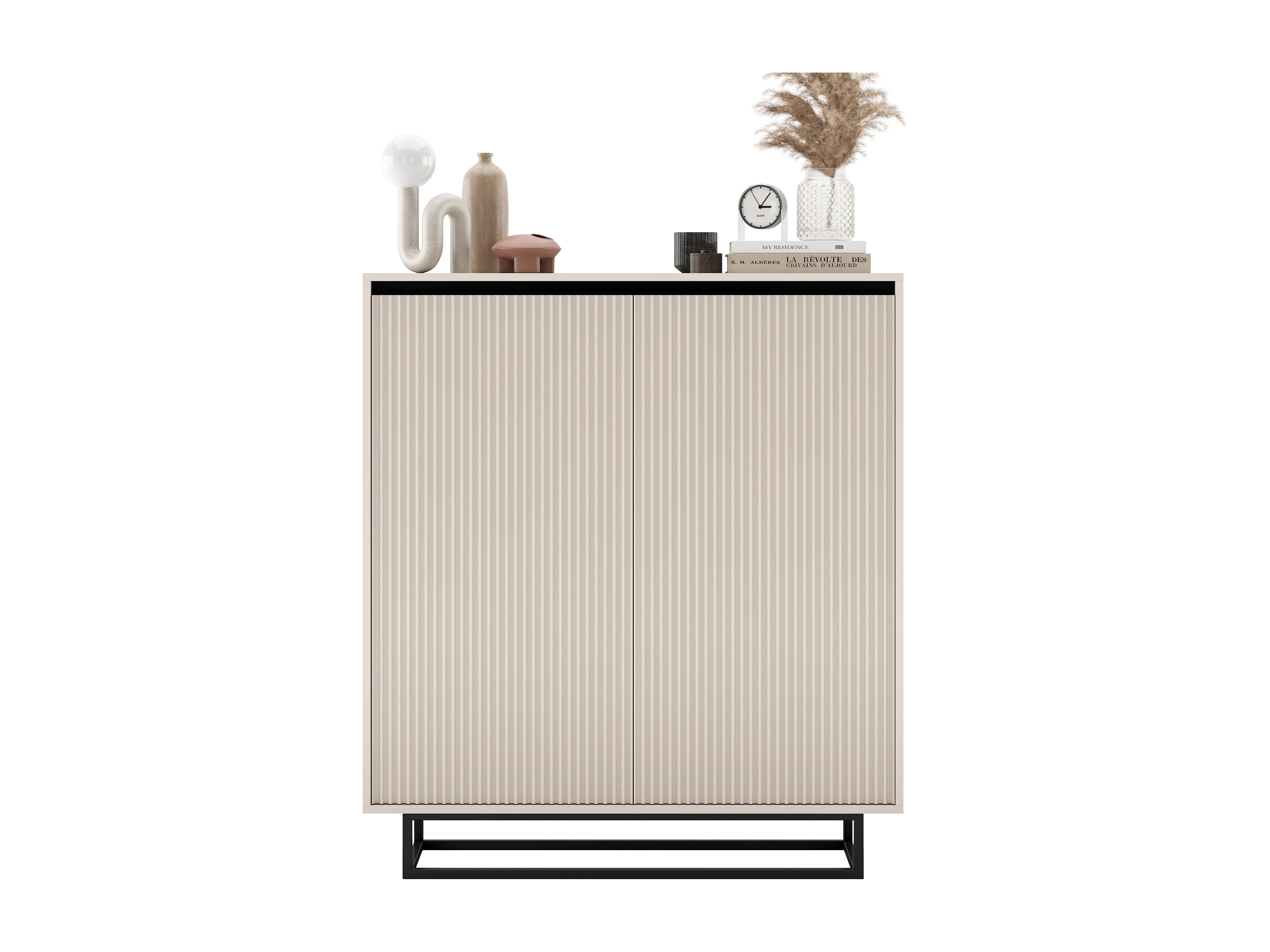 Commode à 2 portes – corps cachemire mat, façades rainurées cachemire mat – 110,8 cm, Cadre en métal noir