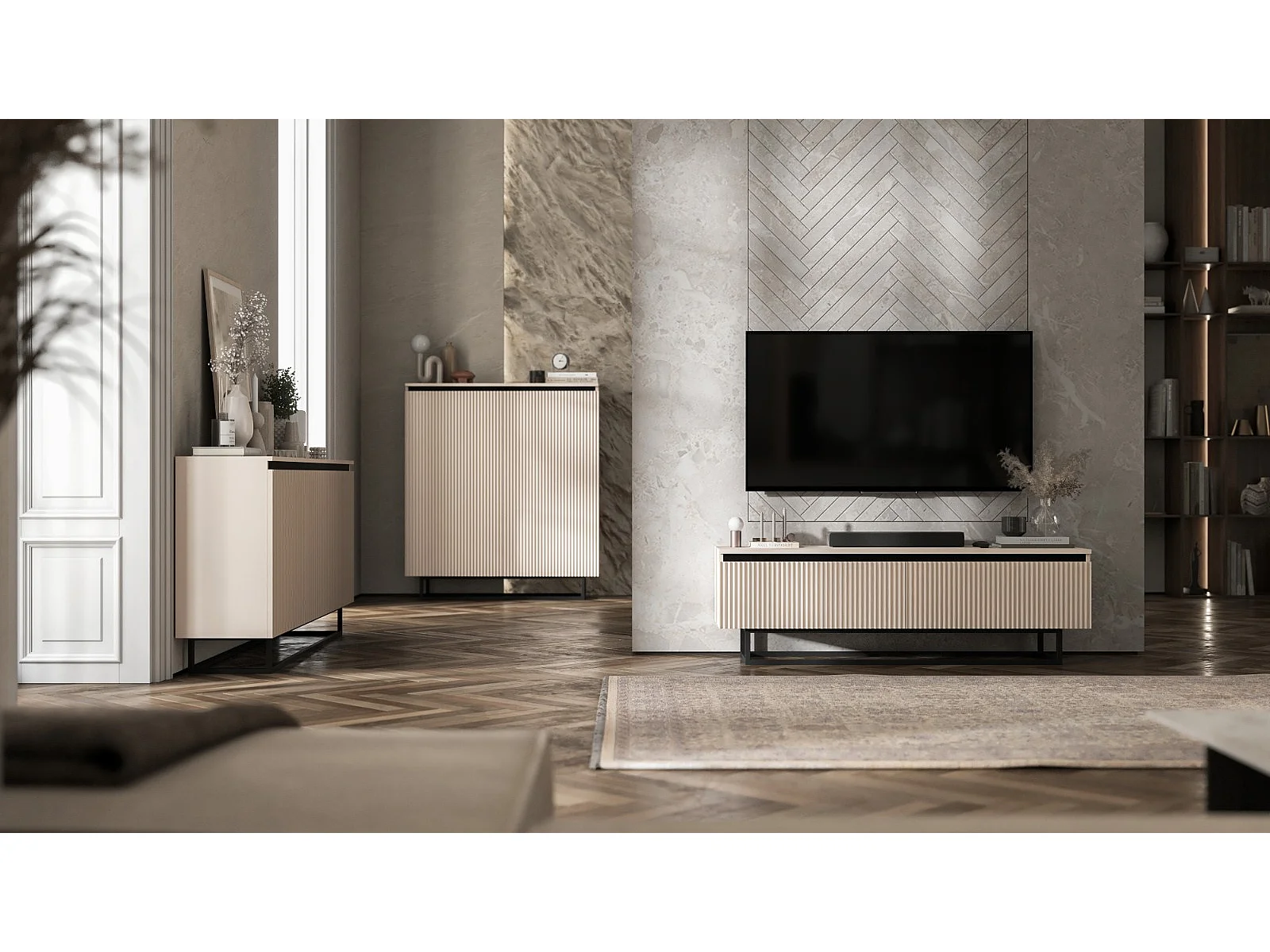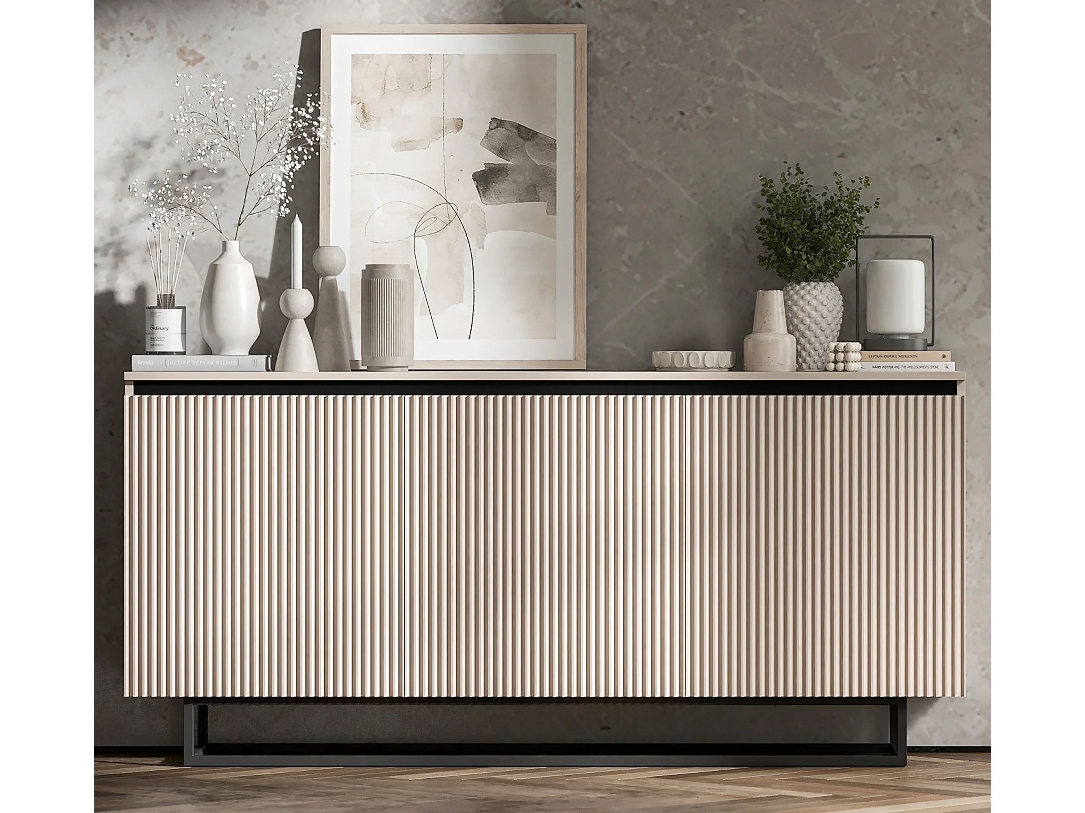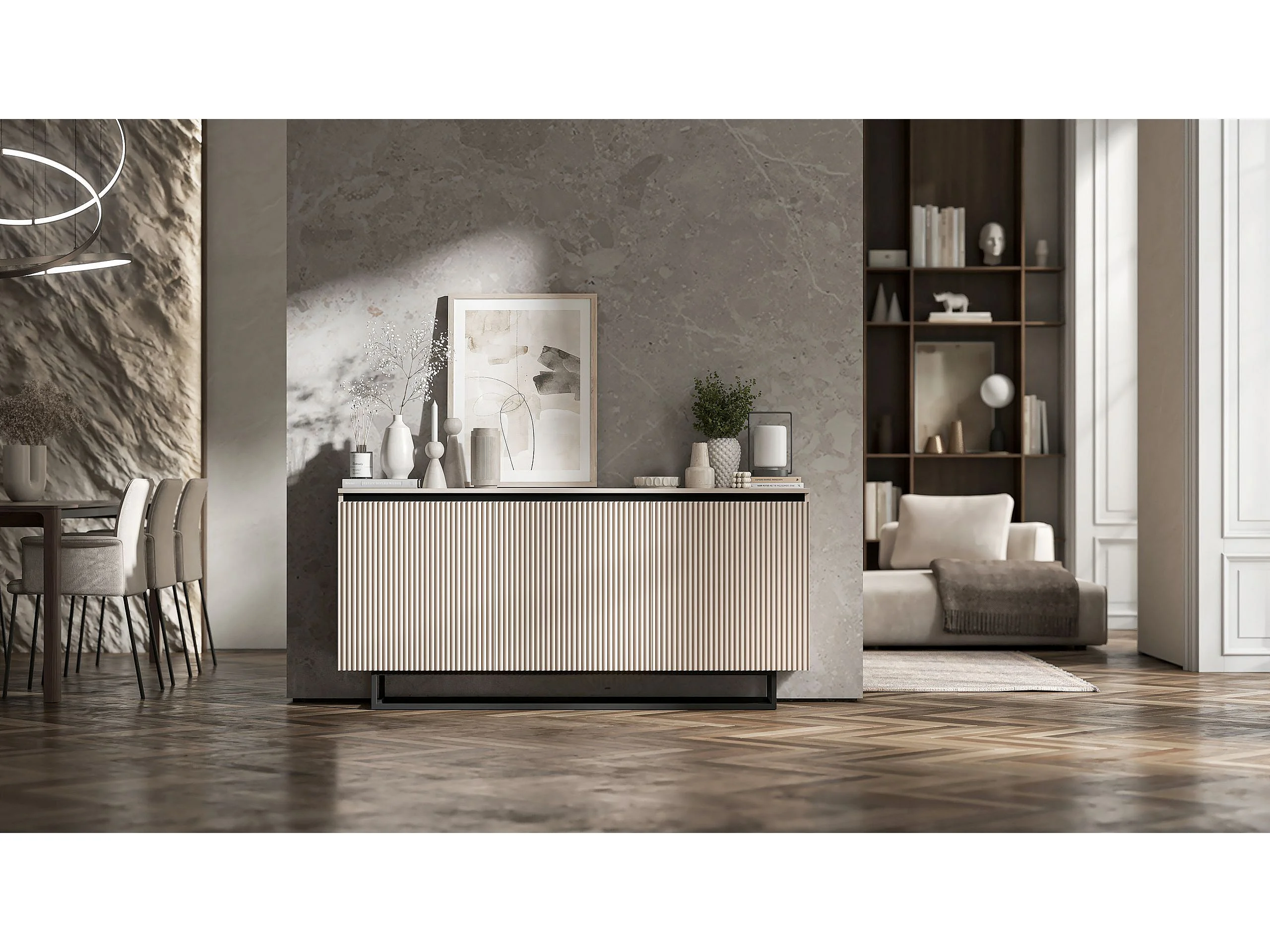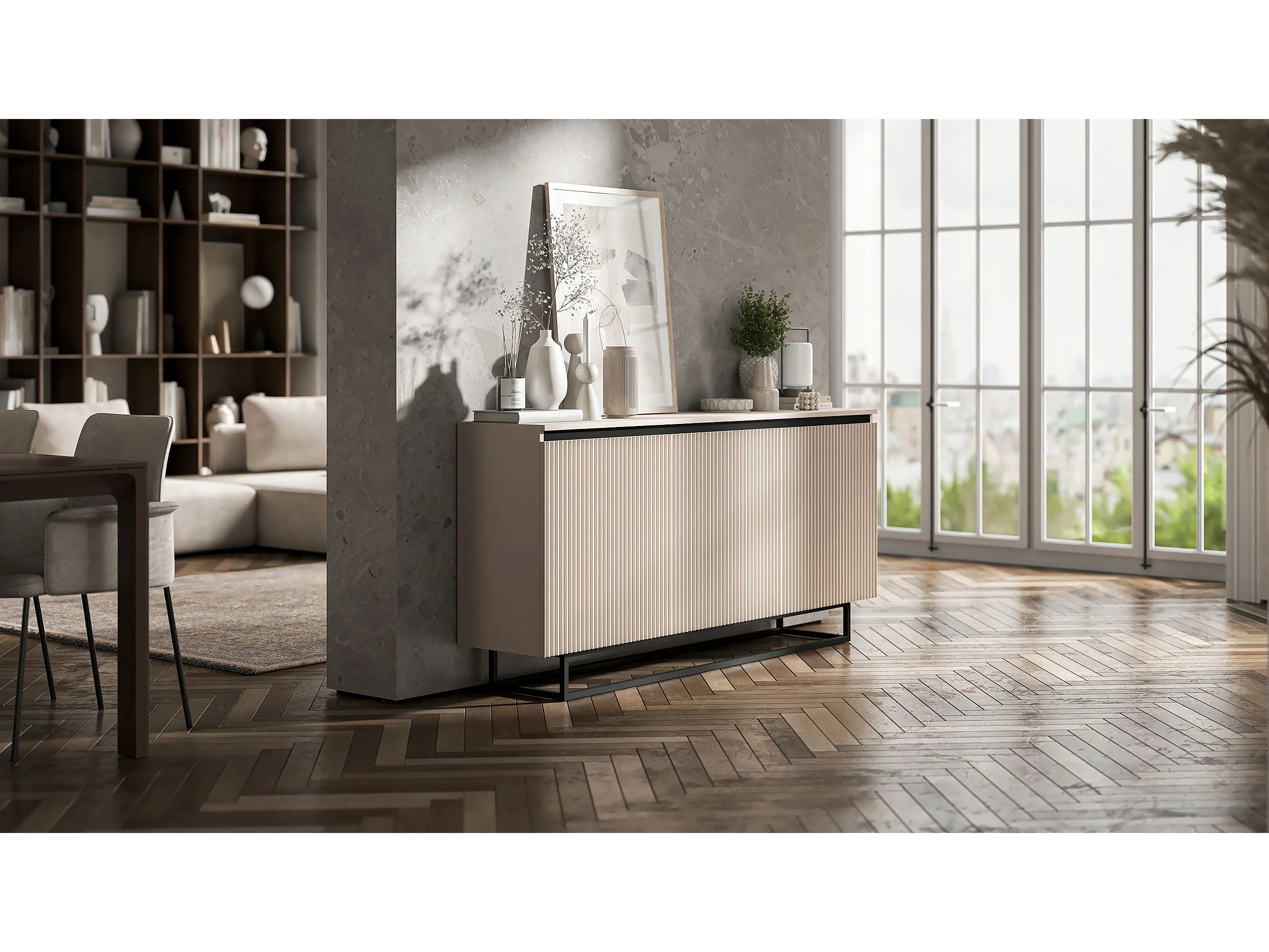 Commode à 3 portes – corps cachemire mat, façades rainurées cachemire mat – 166.8 cm, Cadre en métal noir