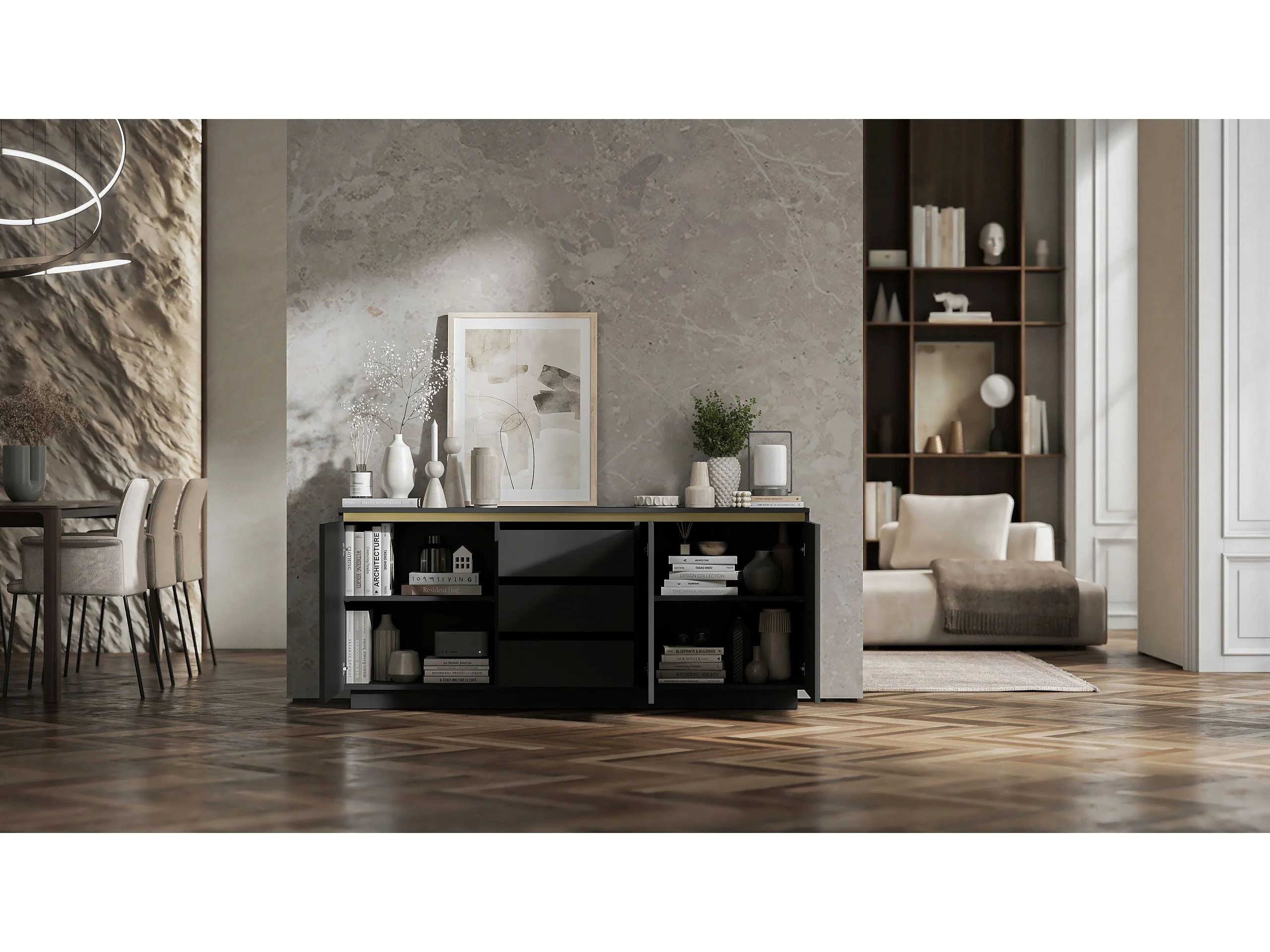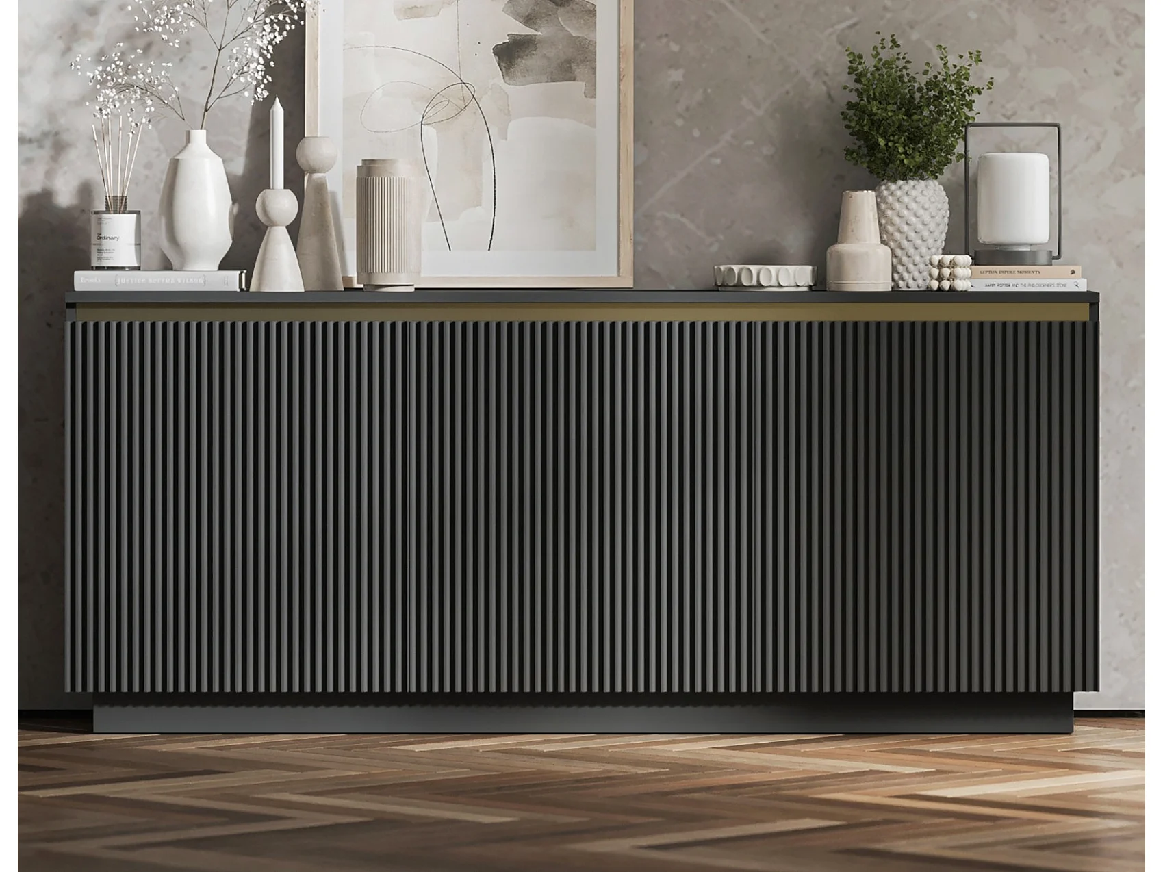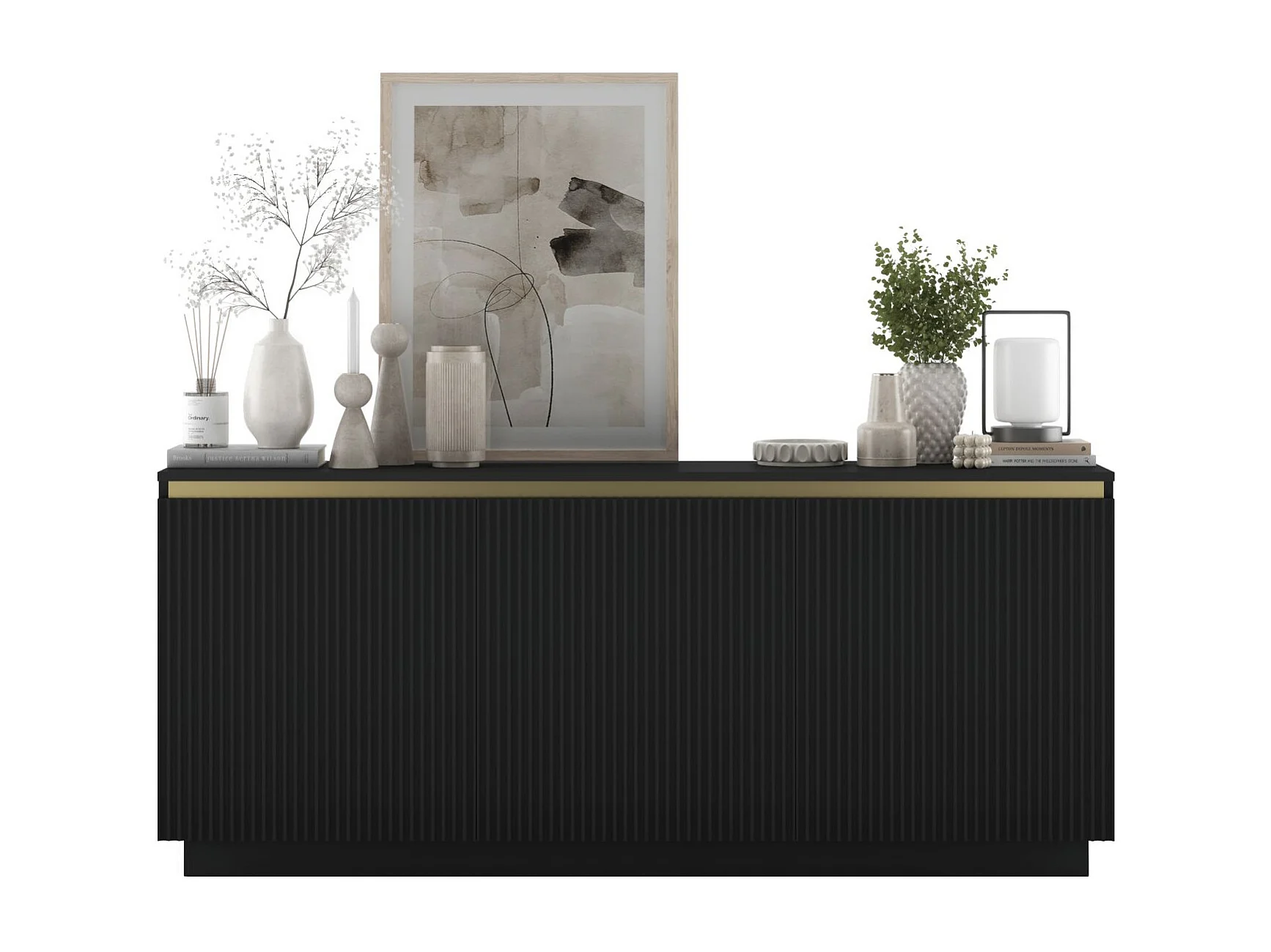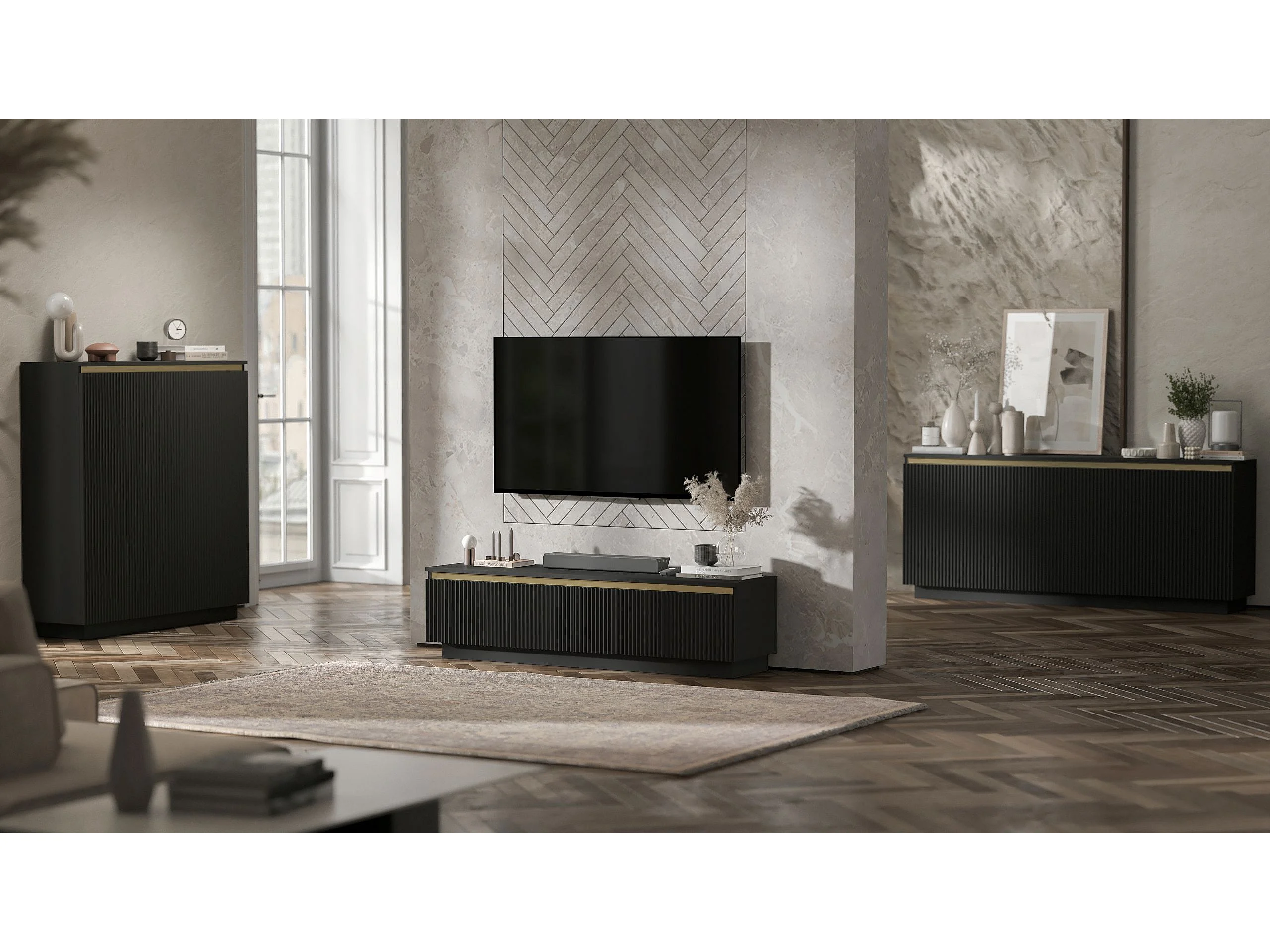 Commode à 3 portes – corps noir mat, façades rainurées noir mat – 166.8 cm, sur socle