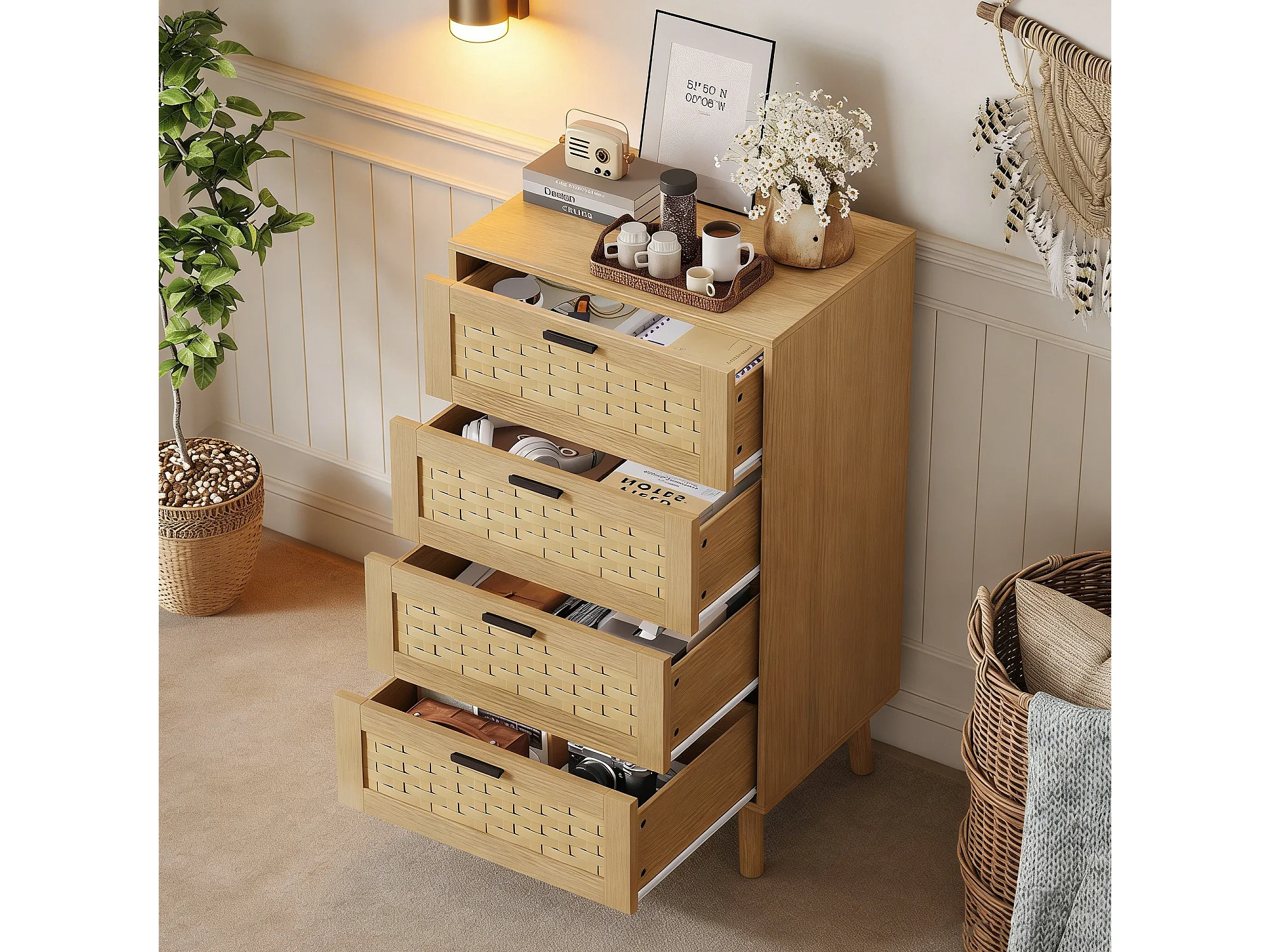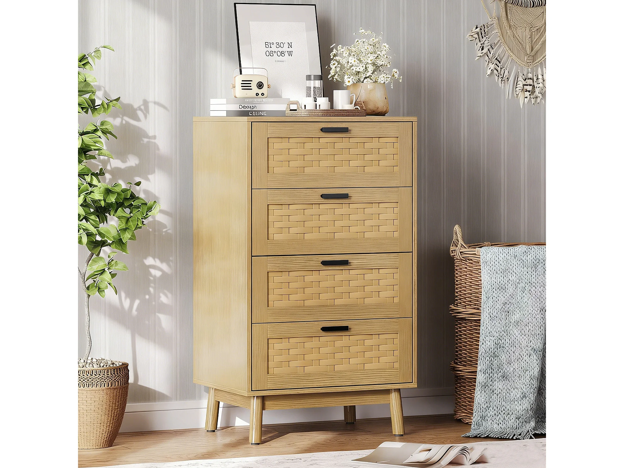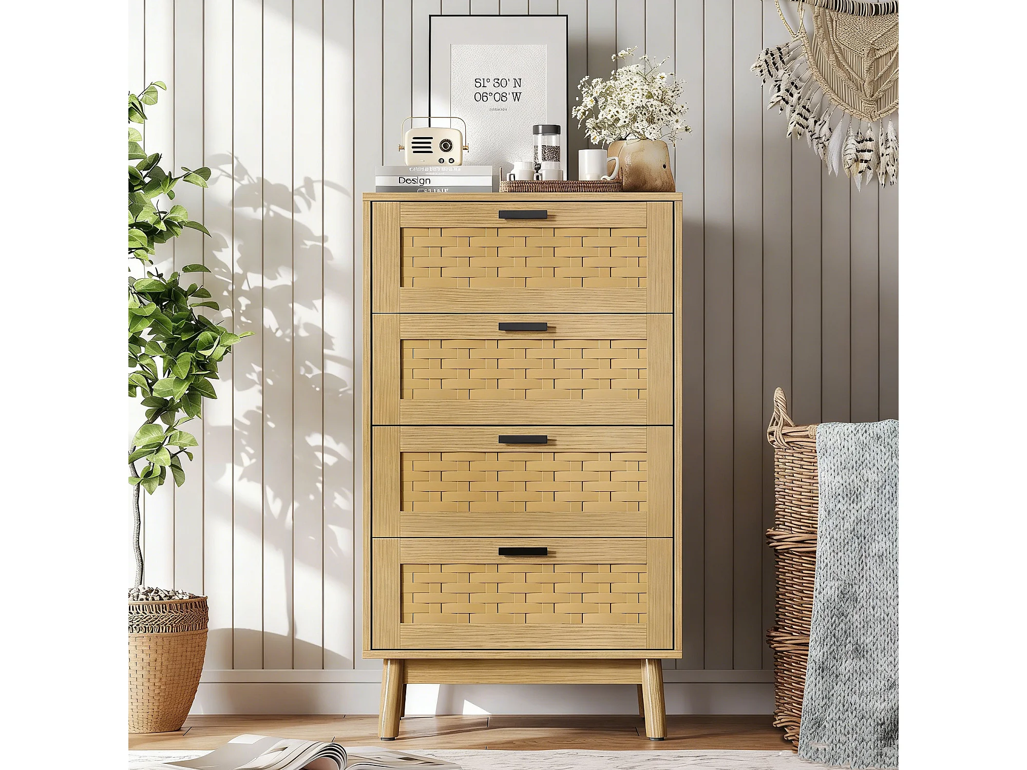 Commode à 4 tiroirs, conception en osier, 55 x 39 x 95 cm, avec poignées et pieds, marron