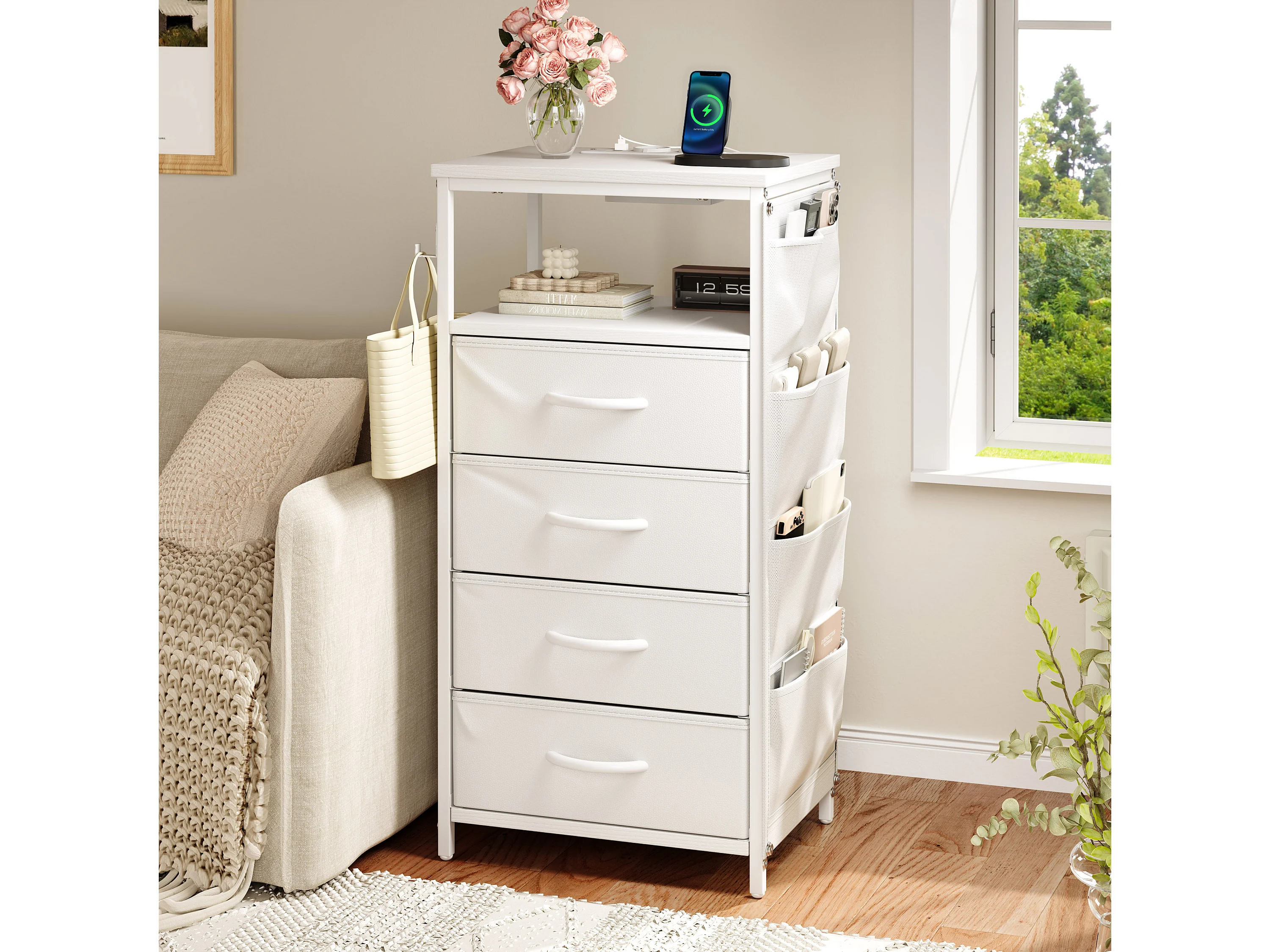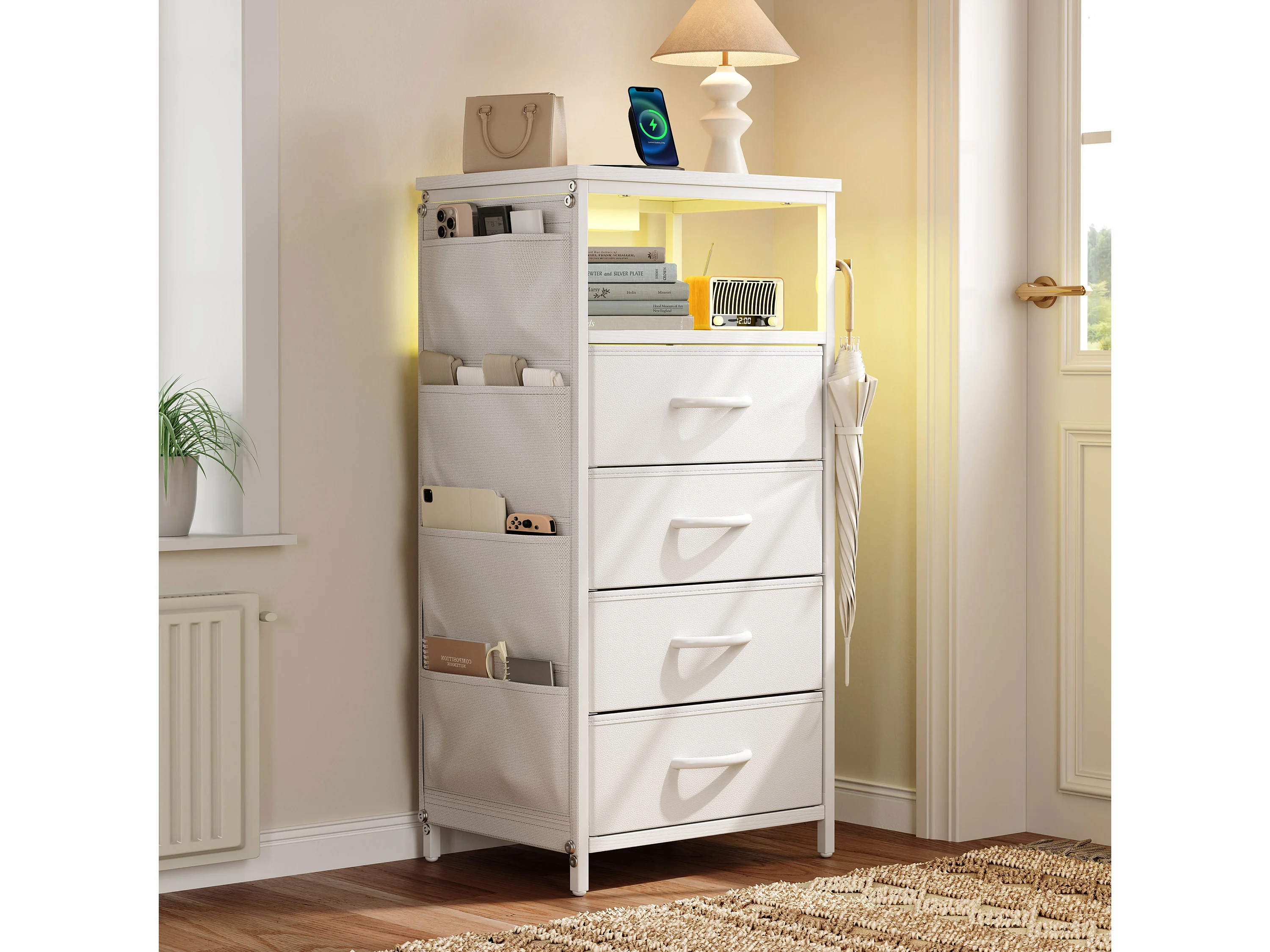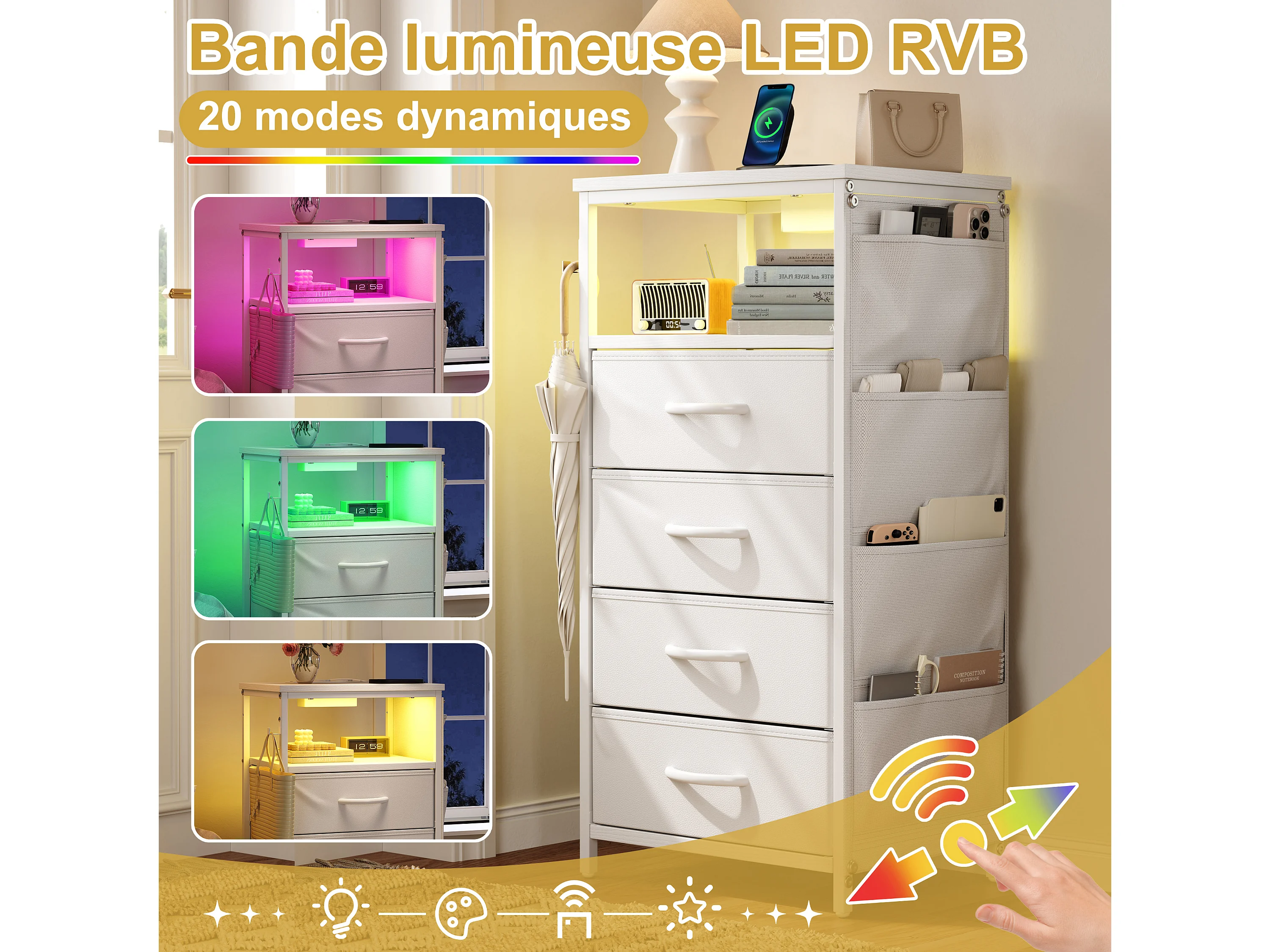 Commode à 4 tiroirs en tissu et 4 poches latérales - table de chevet avec port USB et éclairage LED - meuble à tiroirs avec 2 crochets - blanc