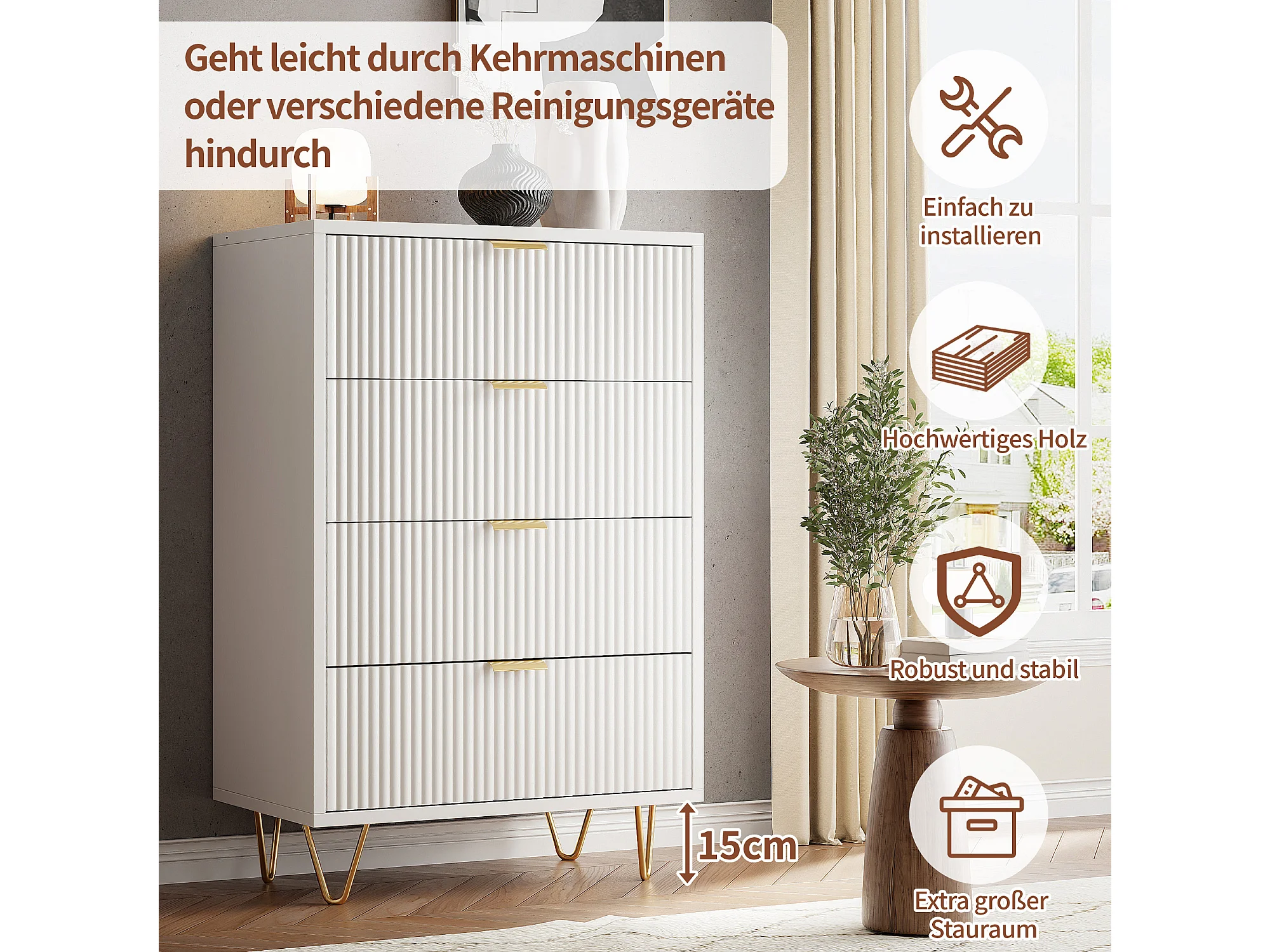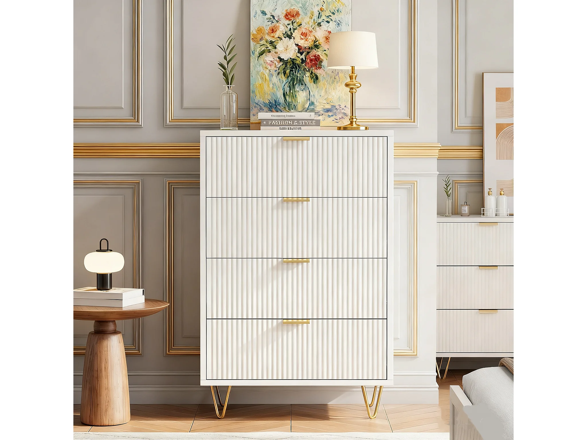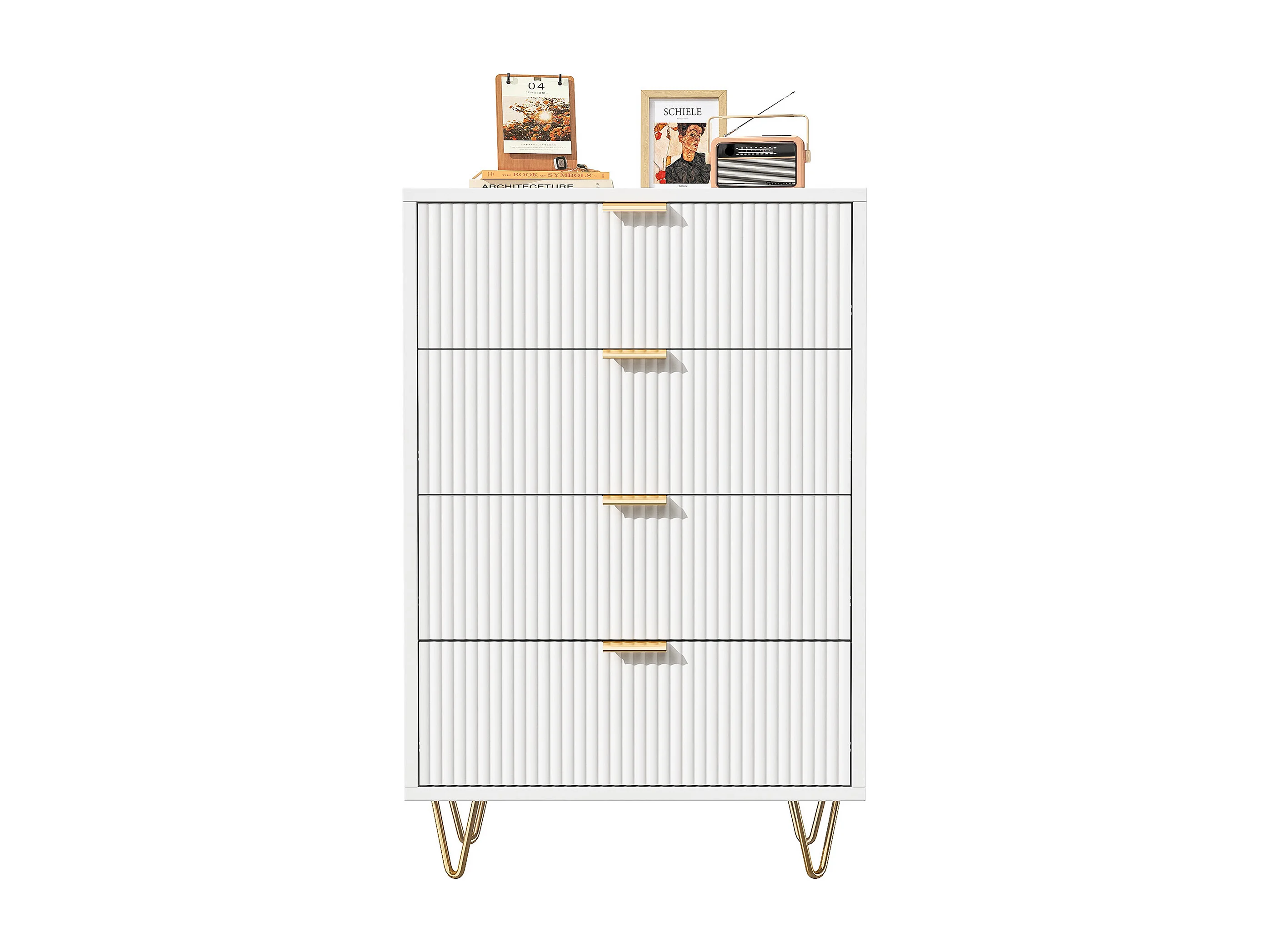 Commode 4 tiroirs - Meuble de Rangement avec Pieds et Poignées en Métal Doré - Moderne - pour couloir - cuisine - Blanc