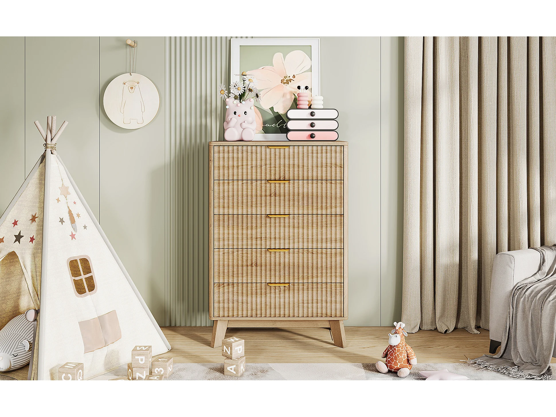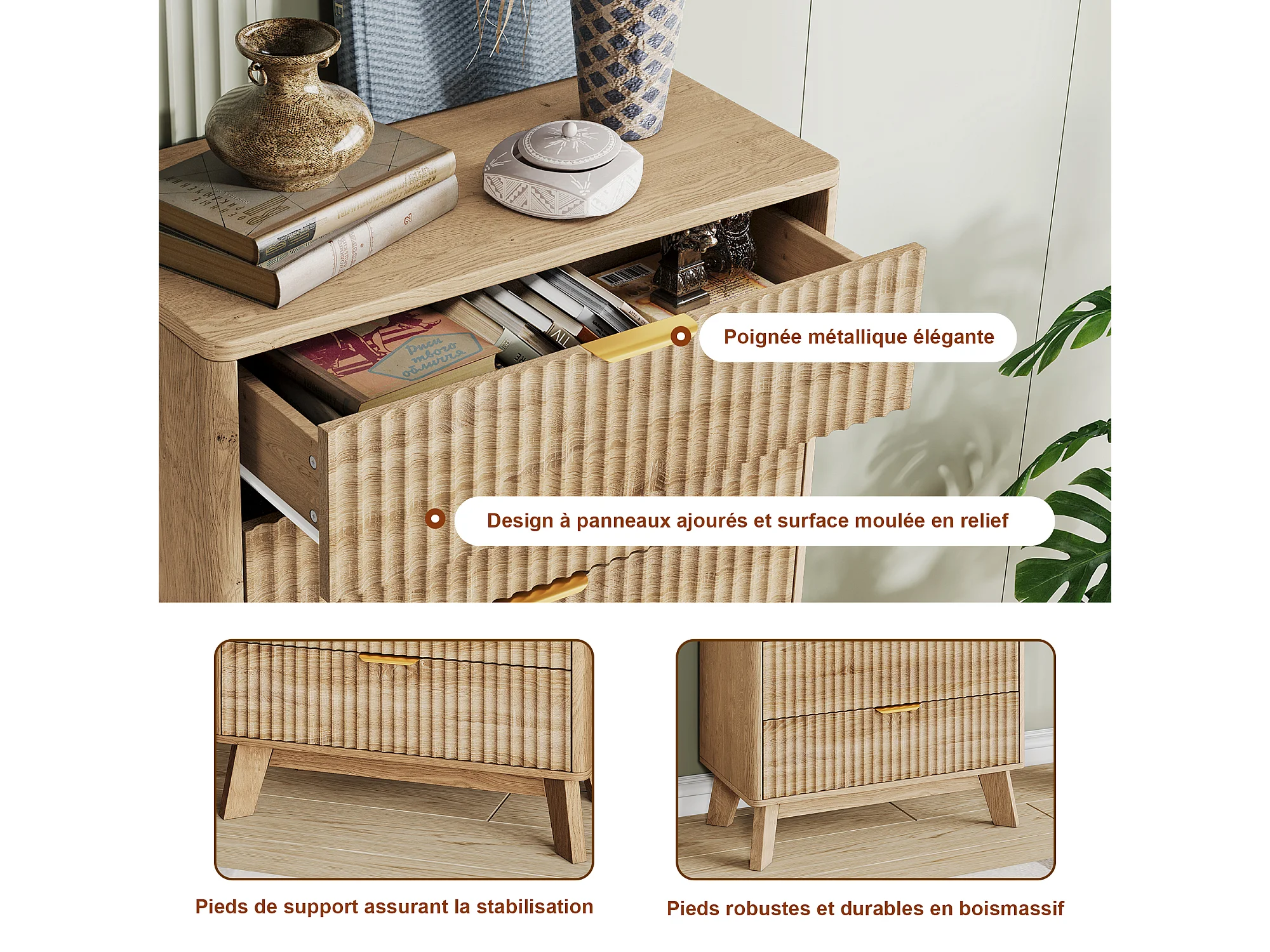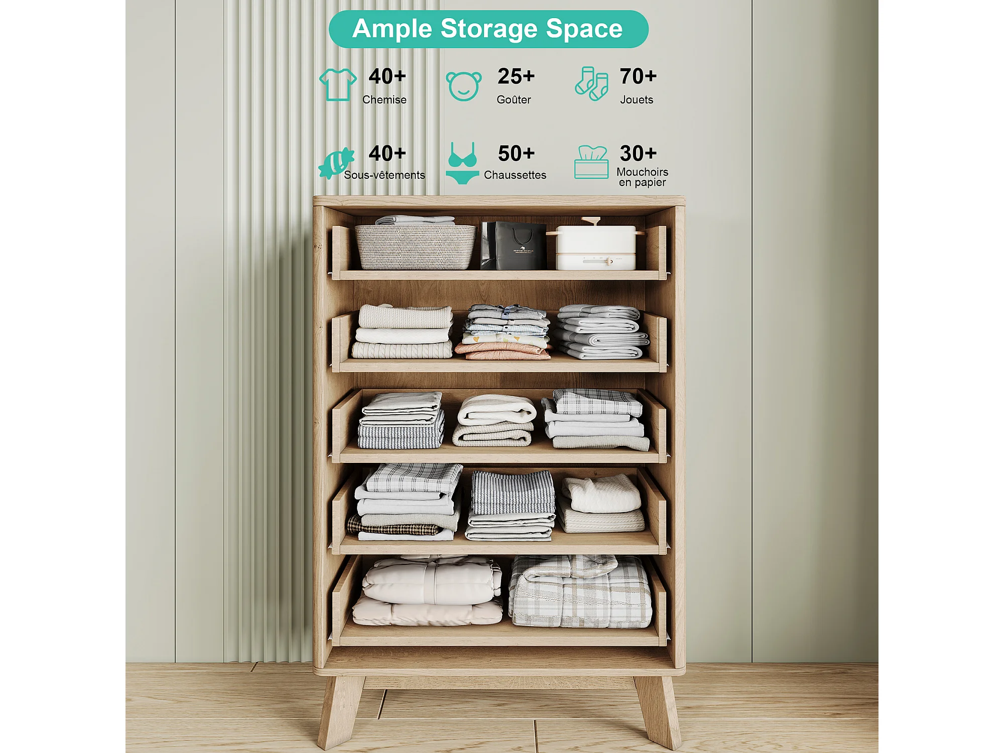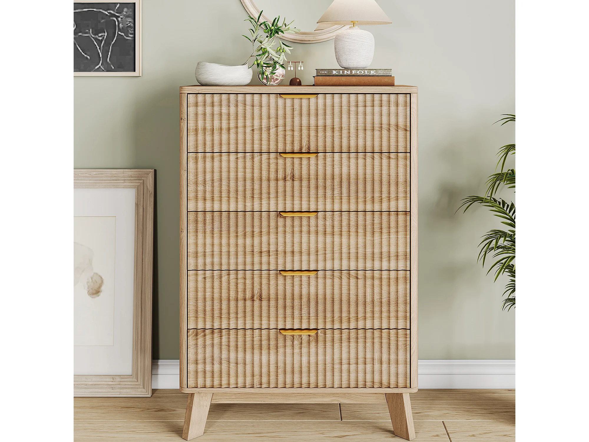 Commode à 5 tiroirs avec poignées dorées - buffet en bois - 73 x 40 x 108 cm