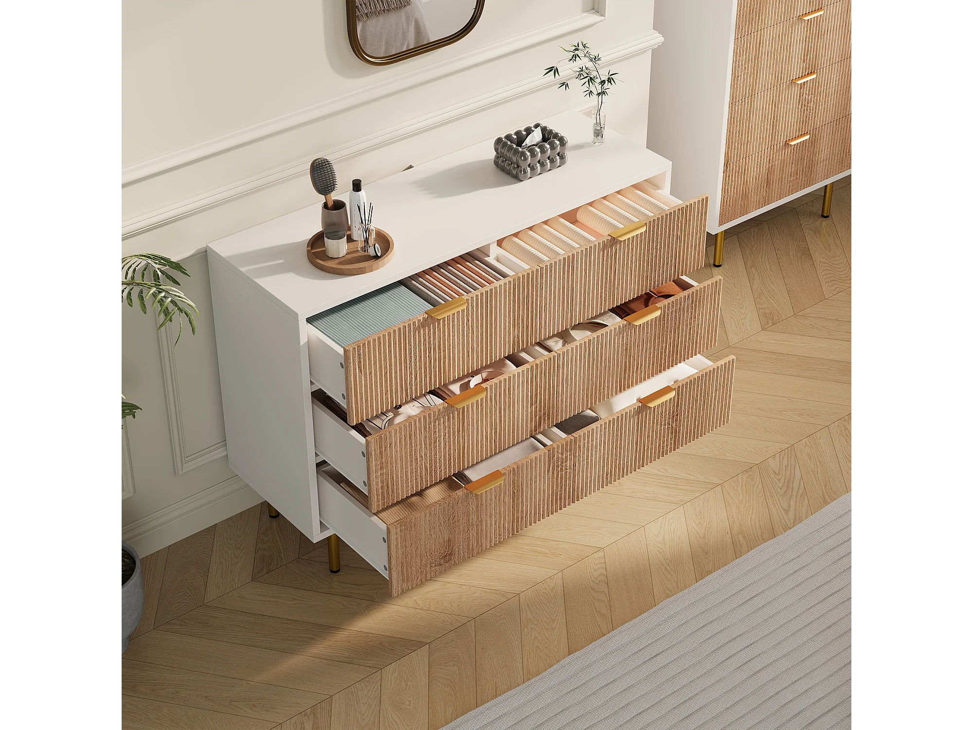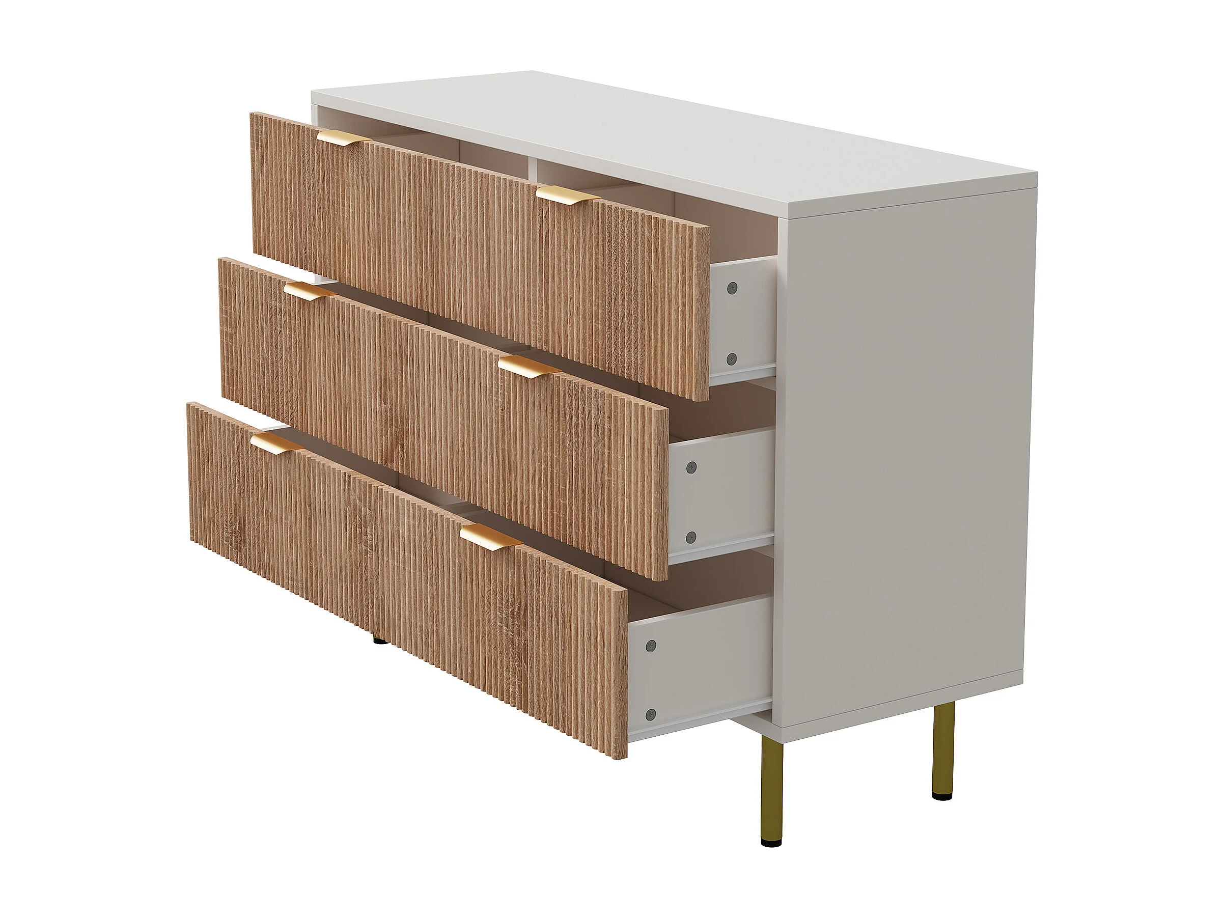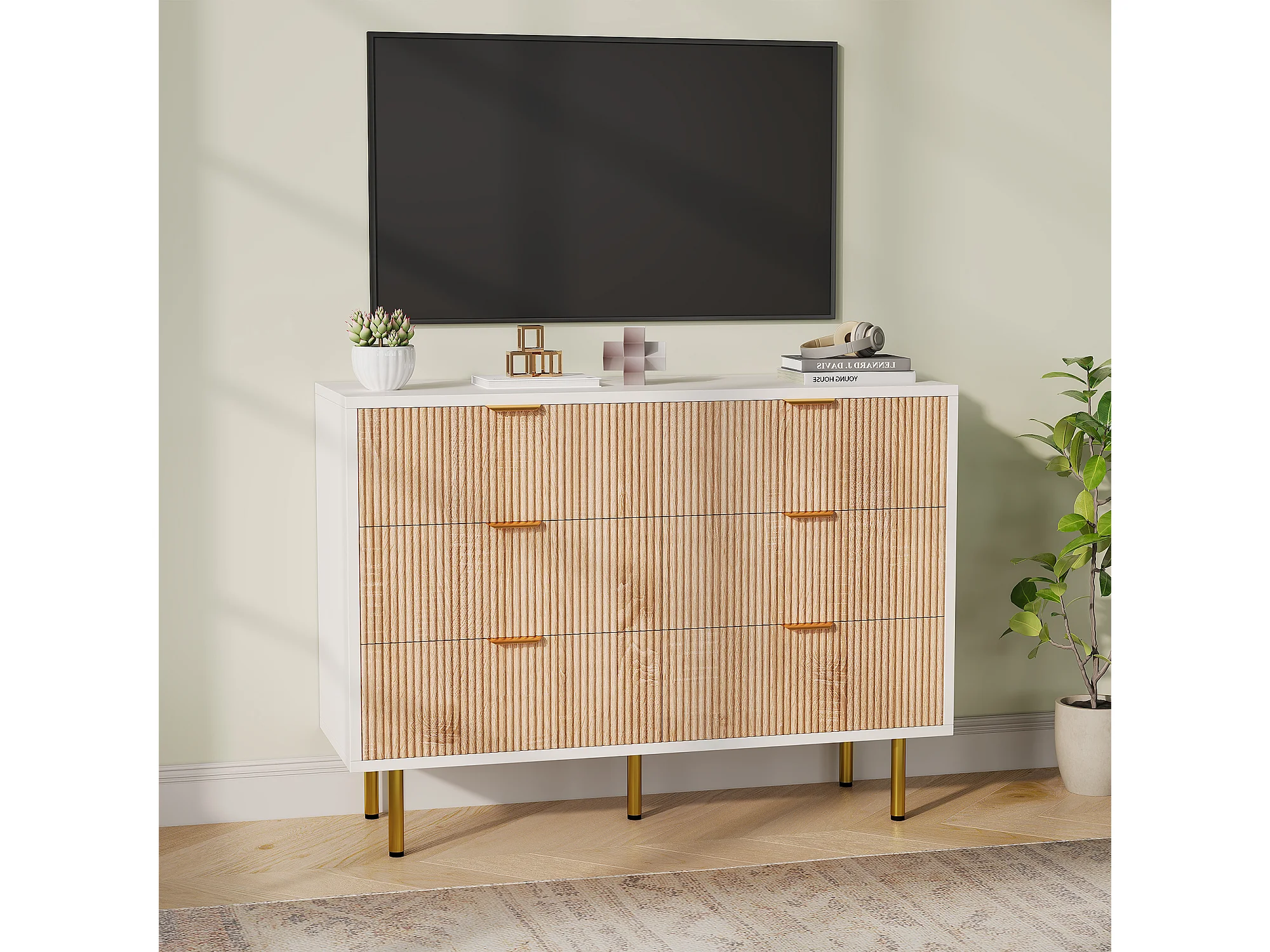 Commode à 6 tiroirs - à panneaux cannelés et pieds dorés - 100 x 34 x 7 cm