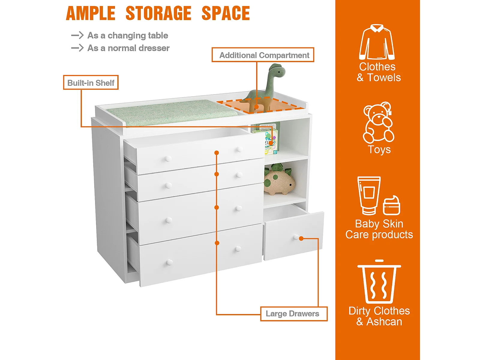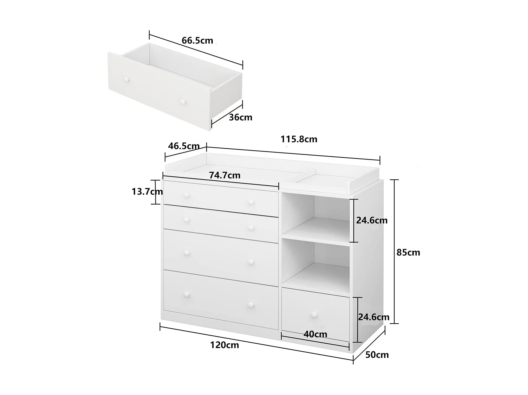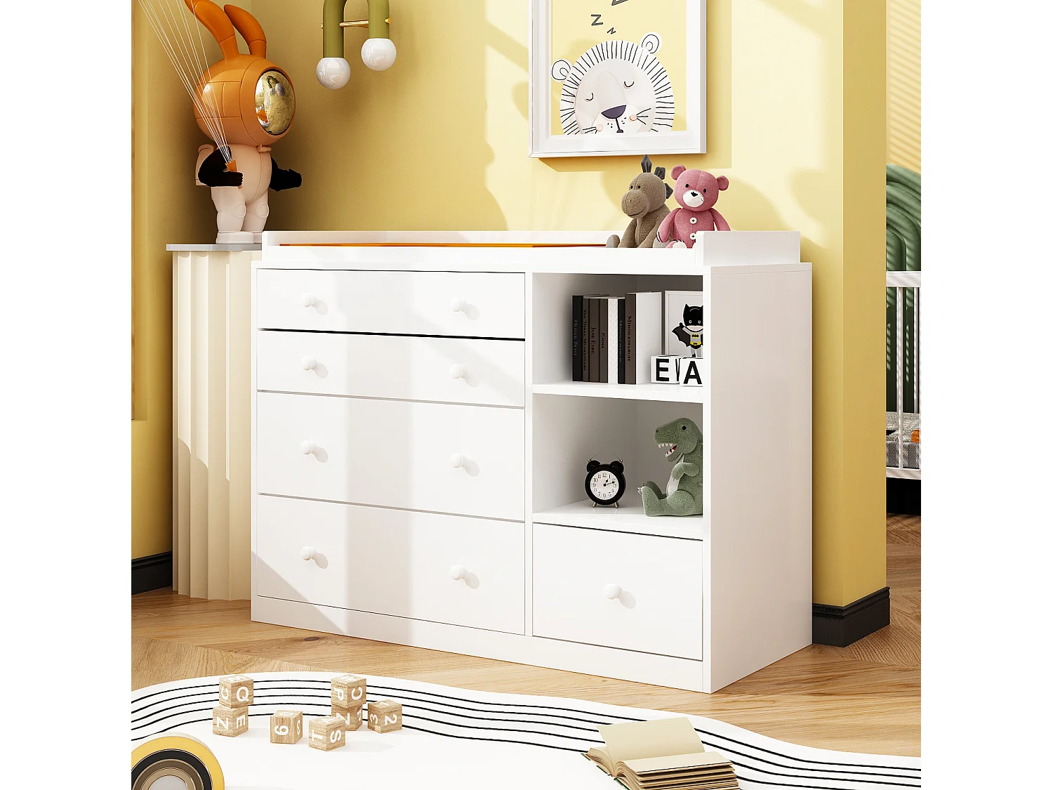 Commode à Langer chambre bébé avec 5 tiroirs et compartiment 120x50x91.5cm Blanche