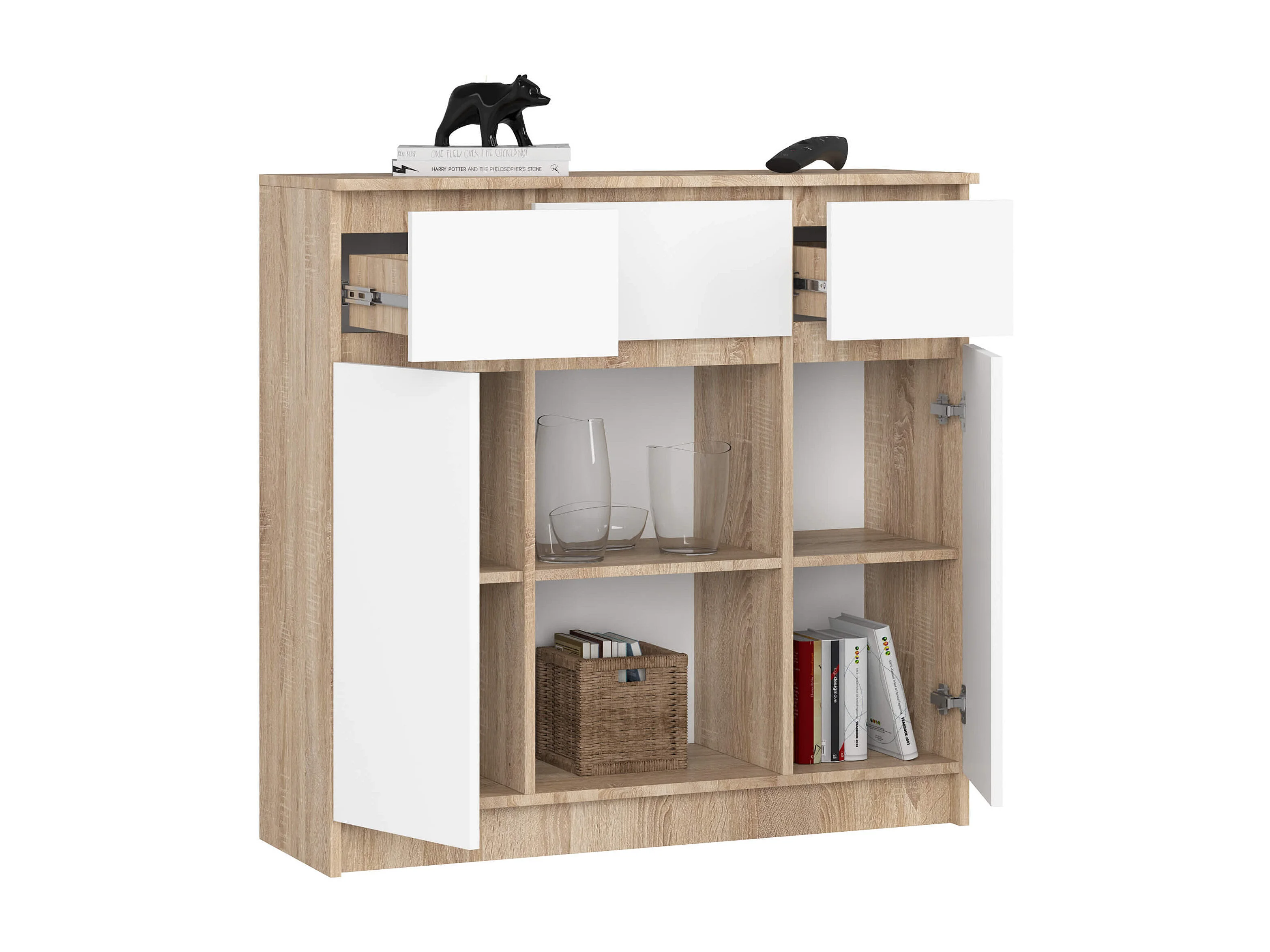 Commode AKORD K100 Chêne Sonoma 101 cm 2 portes 3 tiroirs façade Blanche 6 étagères 101x35x98 cm