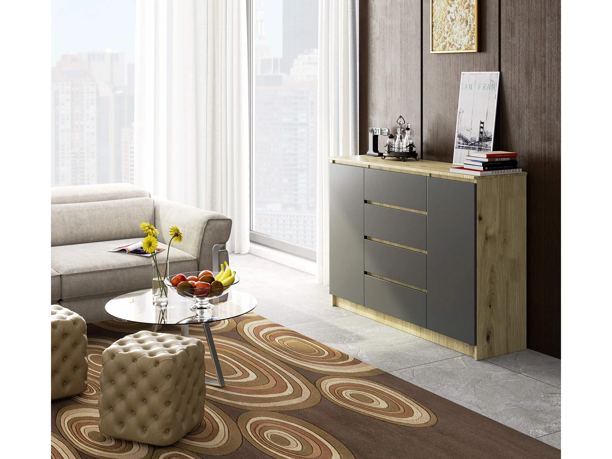 Commode AKORD K140 Chêne Artisan 138 cm 2 portes 4 tiroirs façade Gris Graphite 4 étagères 138x40x99 cm