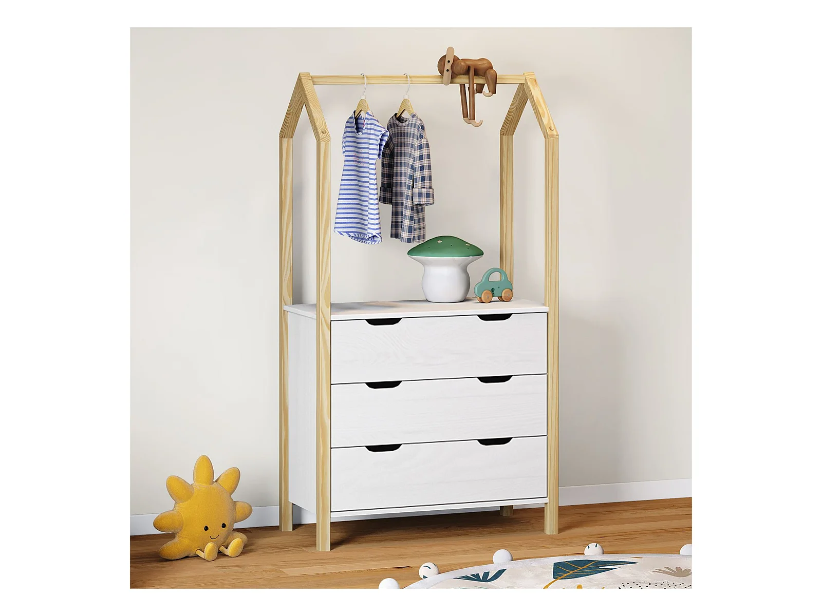 Commode enfant AMIRA H 152 cm en bois massif coloris naturel et blanc type Montessori avec 3 tiroirs et 1 tringle