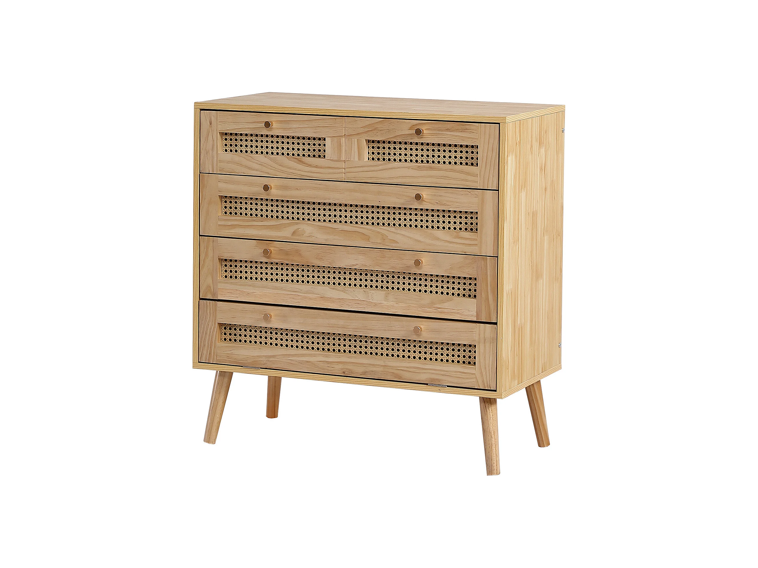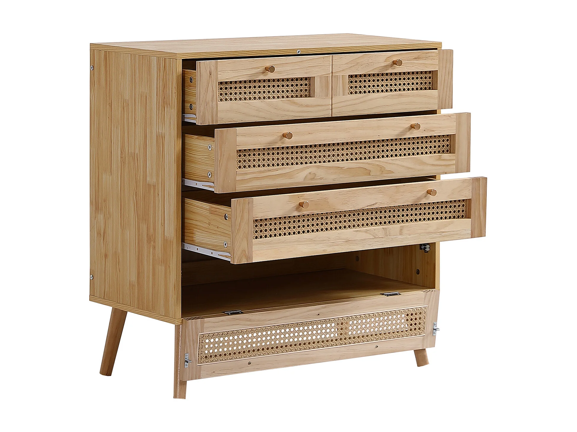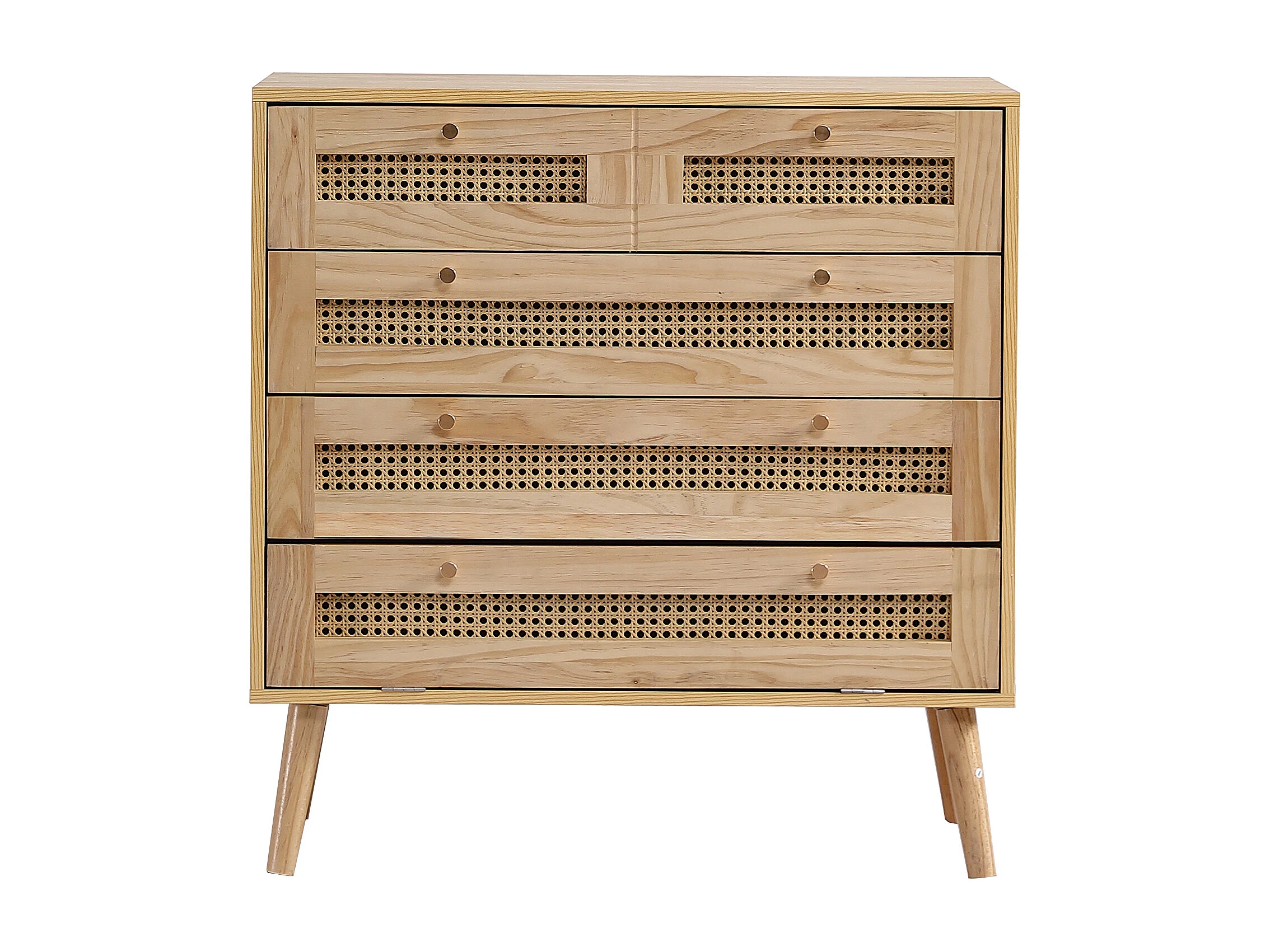 Commode avec 3 tiroirs en rotin et 1 porte - Poignée en métal doré - Couleur bois