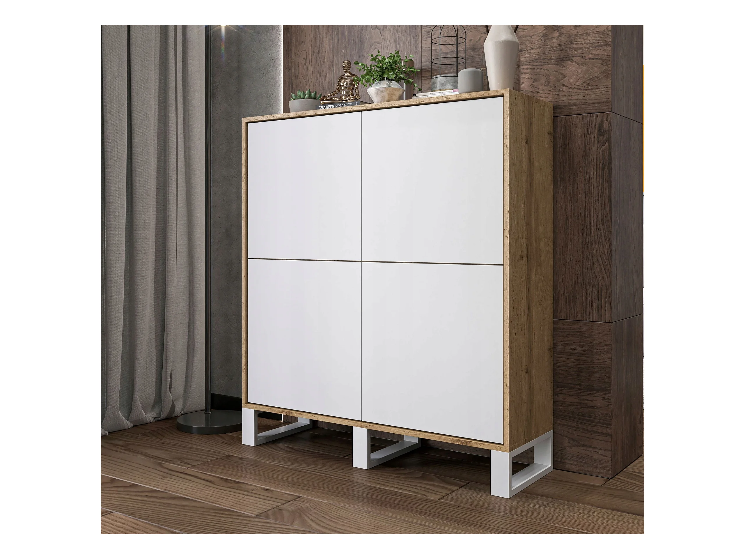 Commode avec 4 portes - carcasse chêne wotan façades blanc mat - 113 cm, pieds en métal