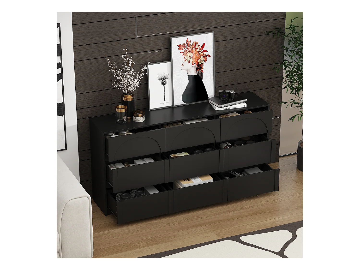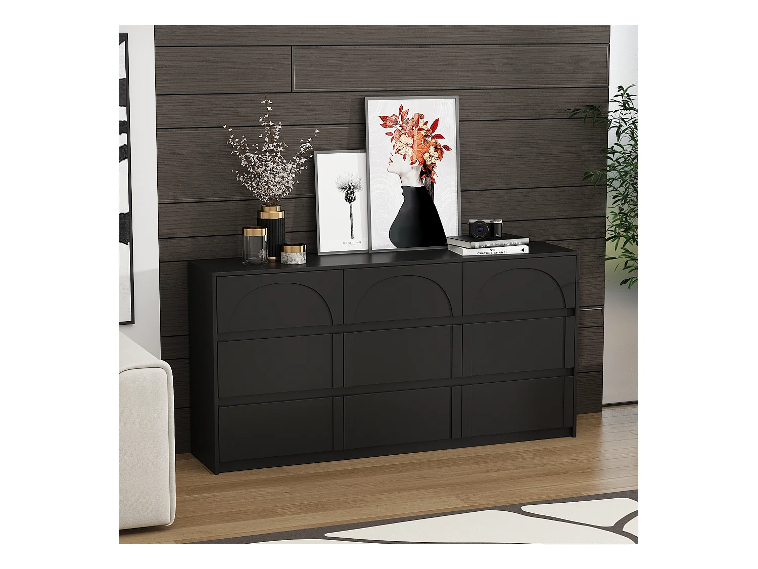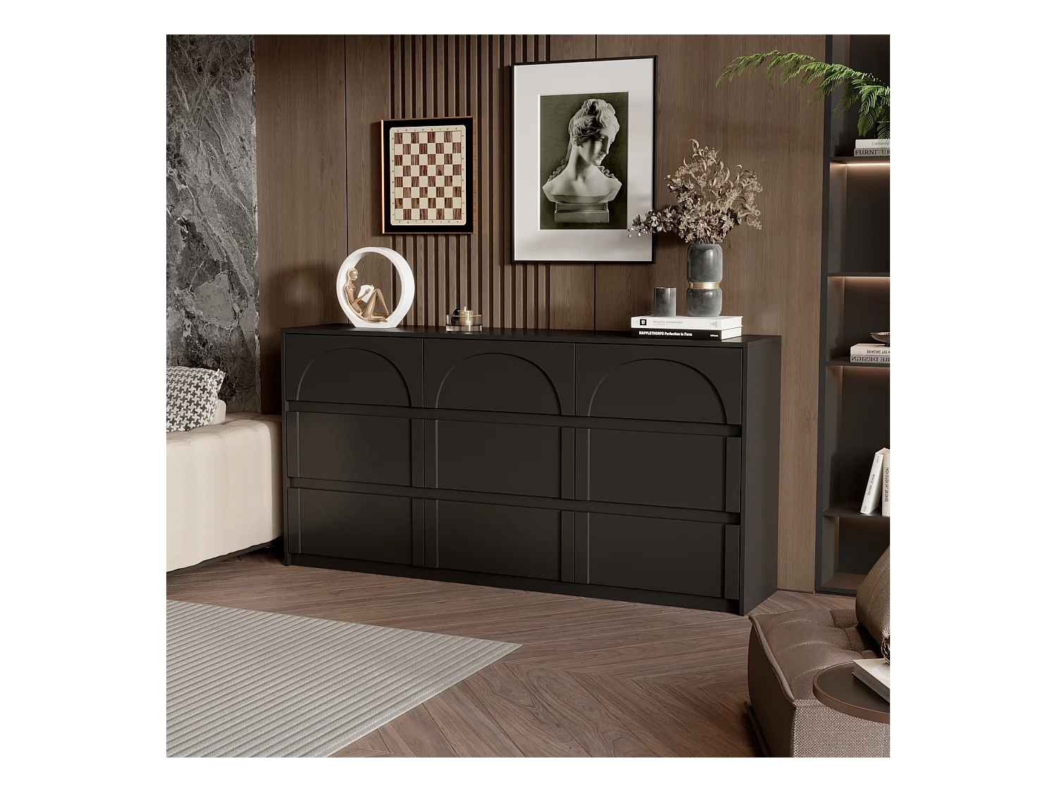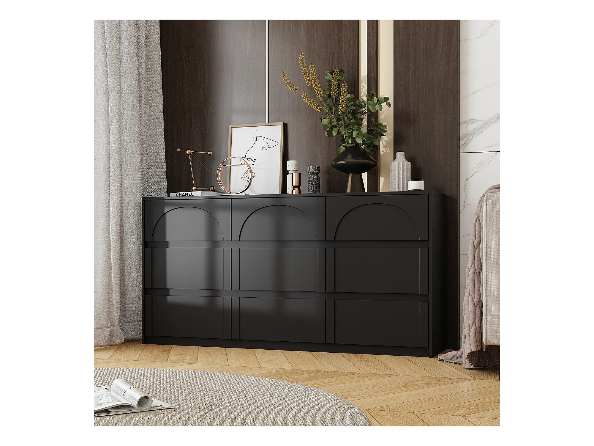 Commode avec 9 Tiroirs sans Poignée, Meuble de Chambre avec Aspect sculpté en Arc, 120 x 35 x 80 CM, Noir