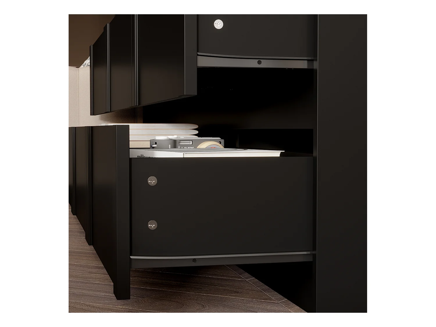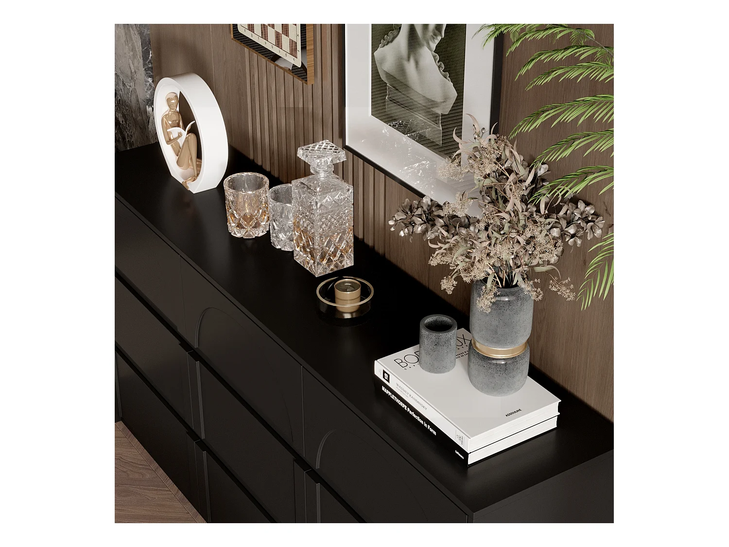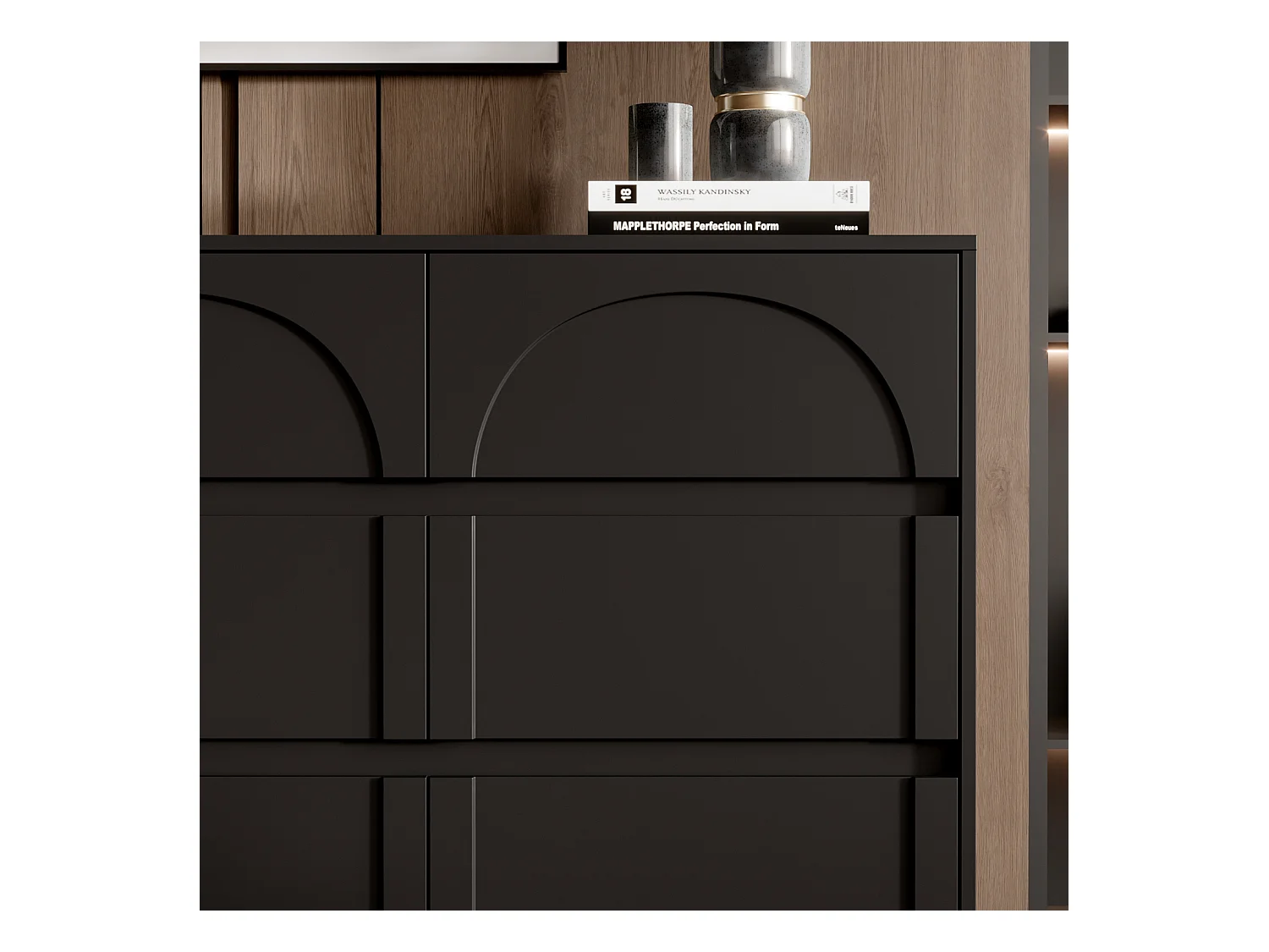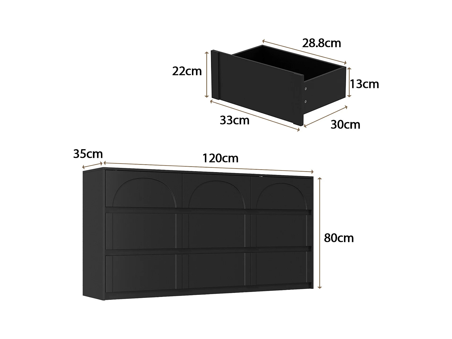 Commode avec 9 Tiroirs sans Poignée, Meuble de Chambre avec Aspect sculpté en Arc, 120 x 35 x 80 CM, Noir