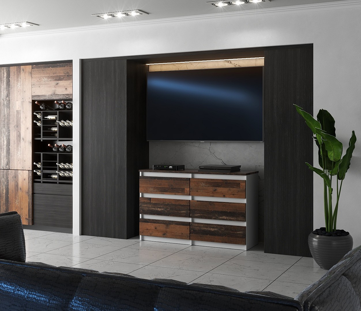 Commode Noire + Chêne Wotan 100 cm – 6 tiroirs – Meuble TV spacieux style loft / salon
