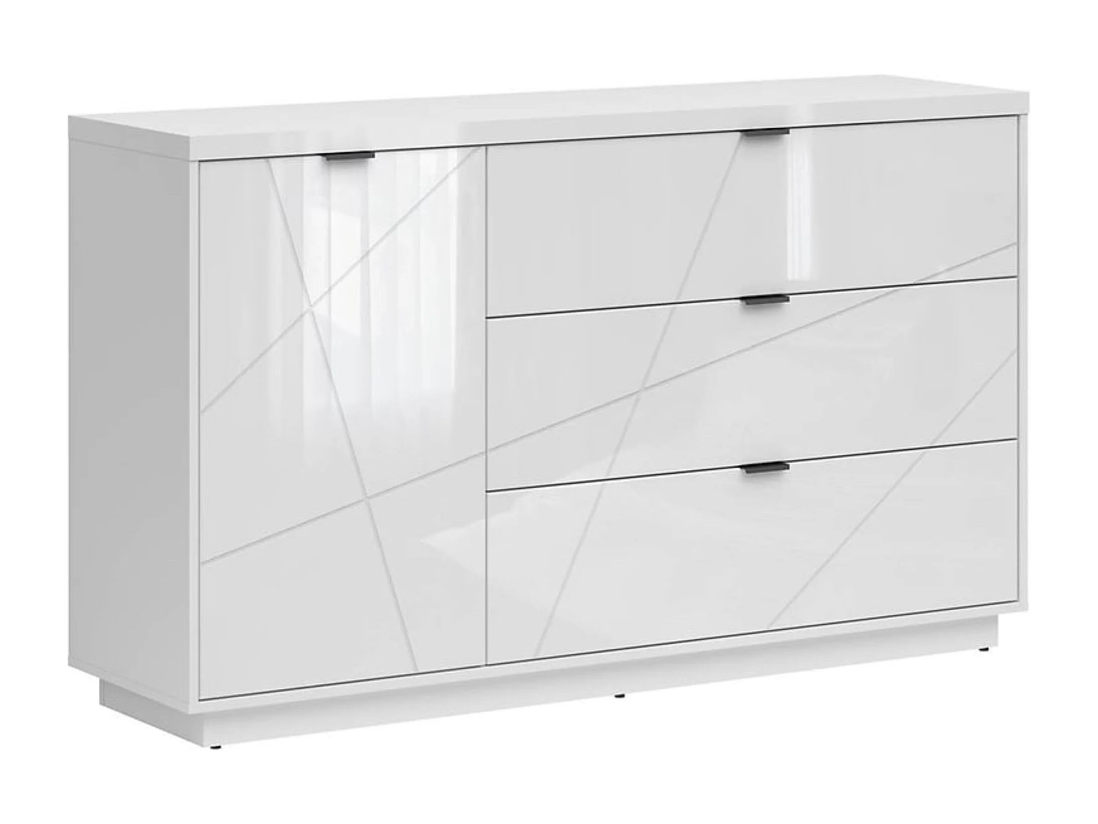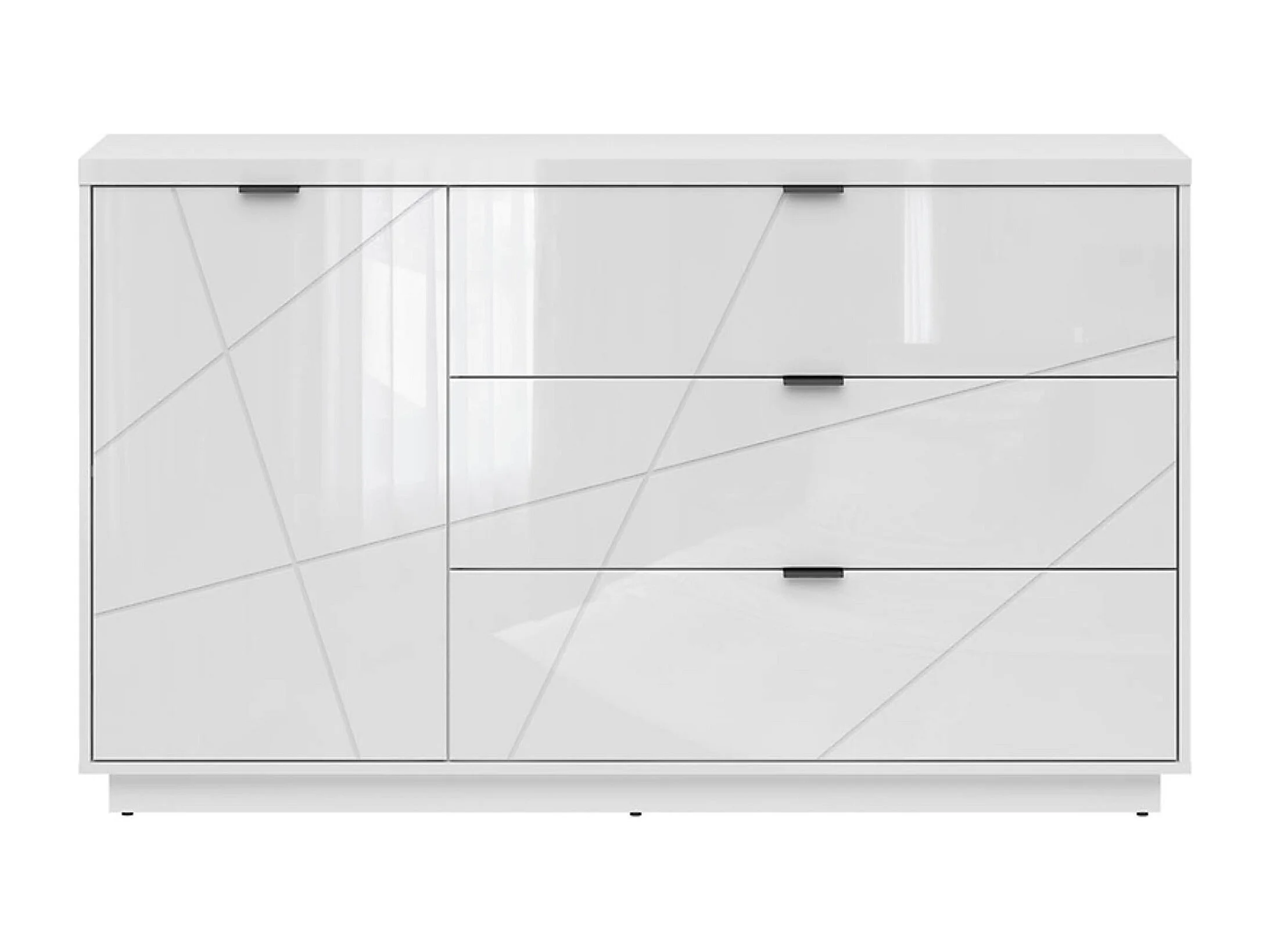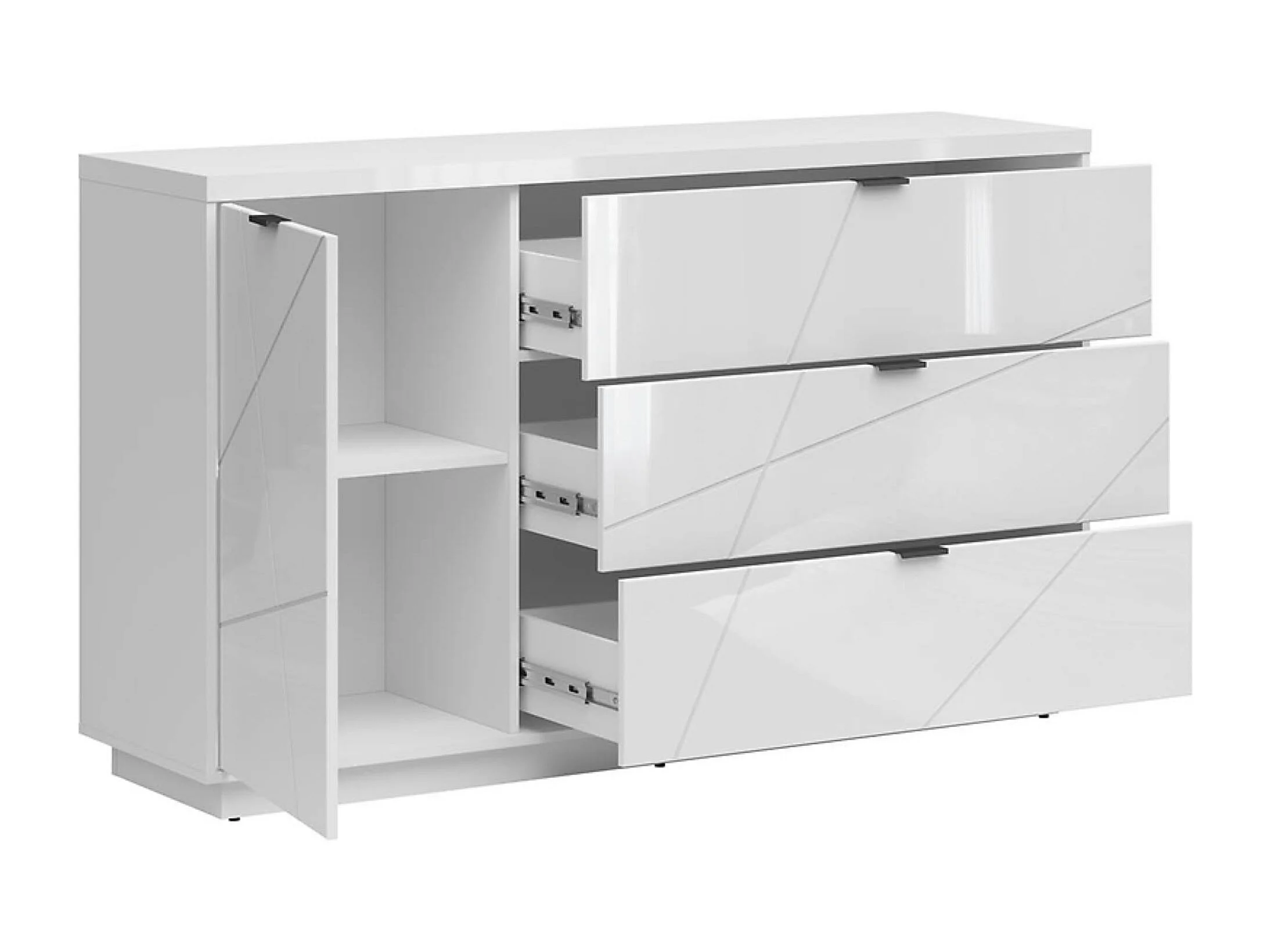 Commode Buffet avec 1 porte et 3 tiroirs, coloris Blanc brillant/Blanc haute brillance - Longueur 156 x Profondeur 42,5 x Hauteur 93 cm