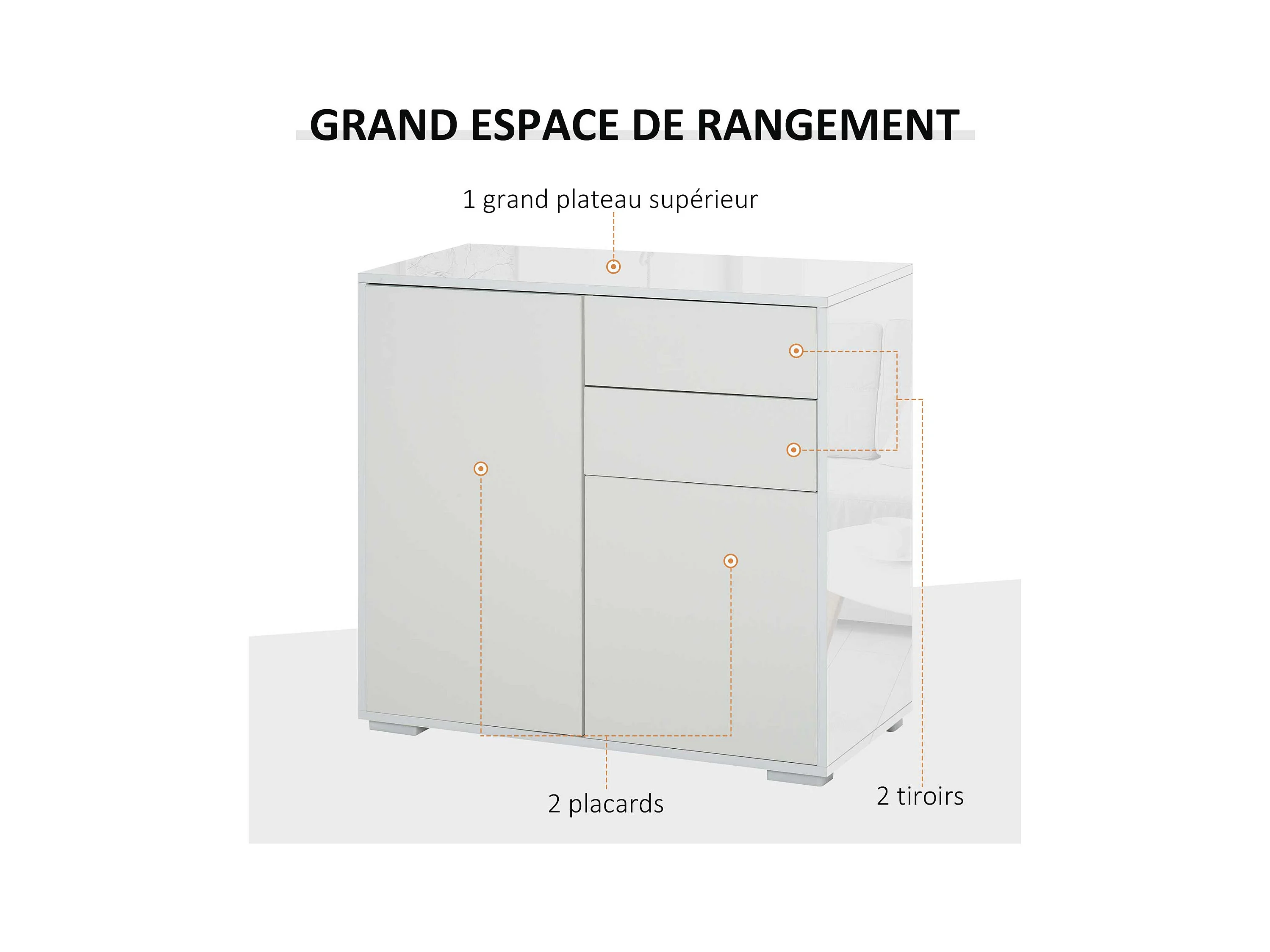 Buffet style classique chic multi-rangement 2 portes 2 étagères réglables 2 tiroirs coulissants placard 2 portes MDF blanc plateau aspect bois clair