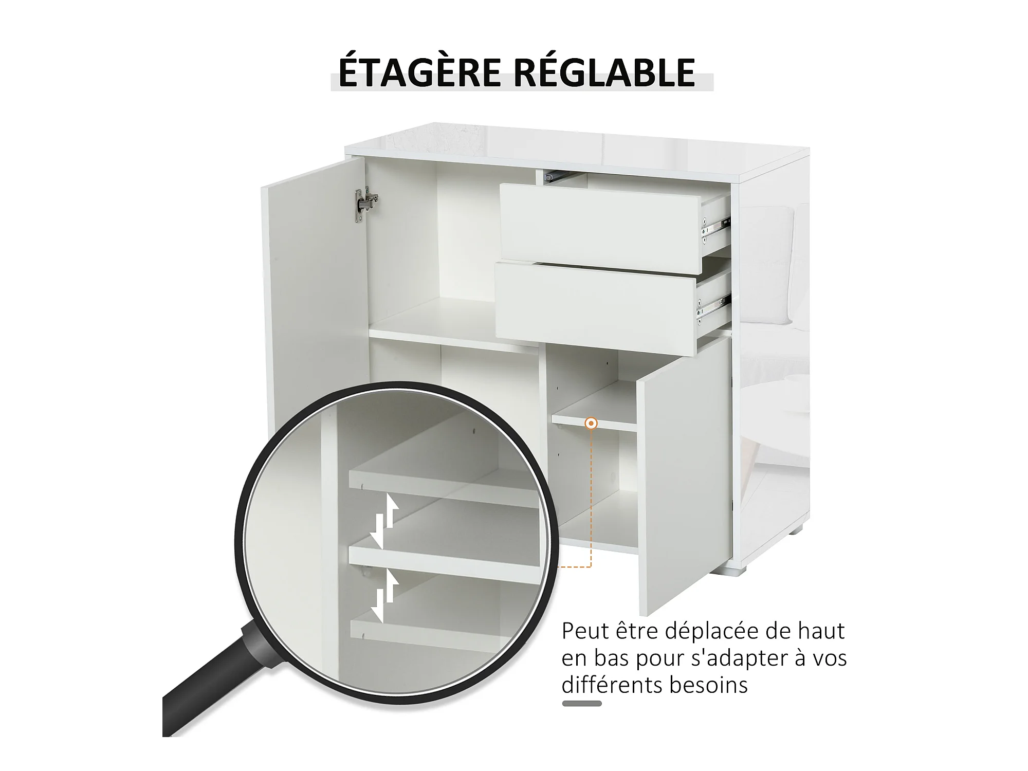Buffet multi-rangement 2 portes avec étagère 2 tiroirs coulissants panneaux particules blanc aspect bois clair