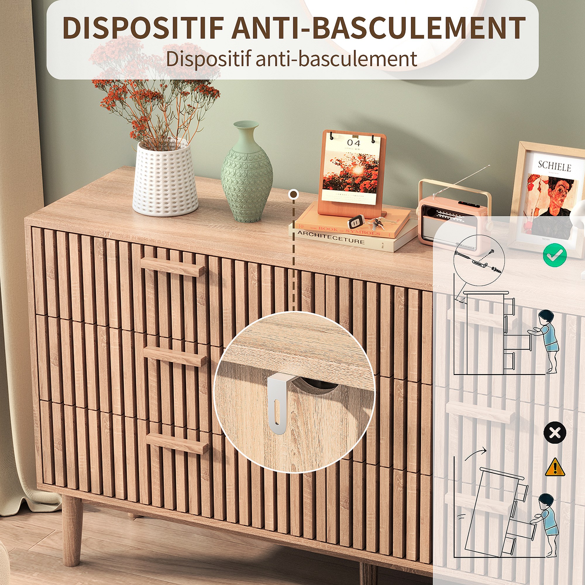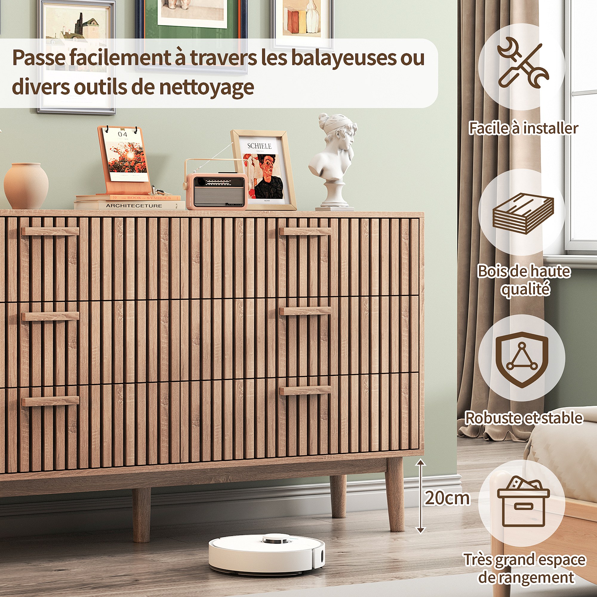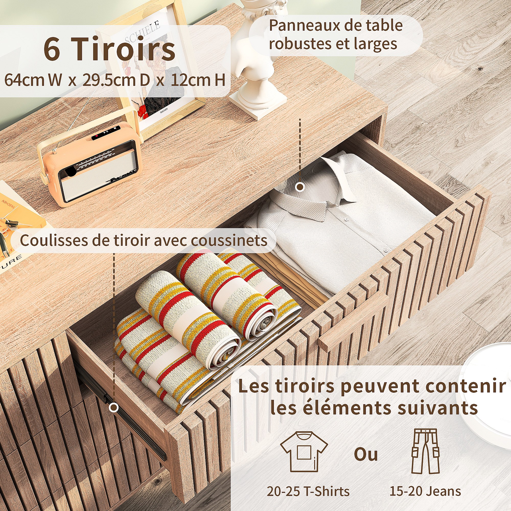 Commode Chambre, Commode en Bois et Rotin 6 Tiroirs, Meuble de Rangement Multifonction, Natural Wood Cabinet with Drawers