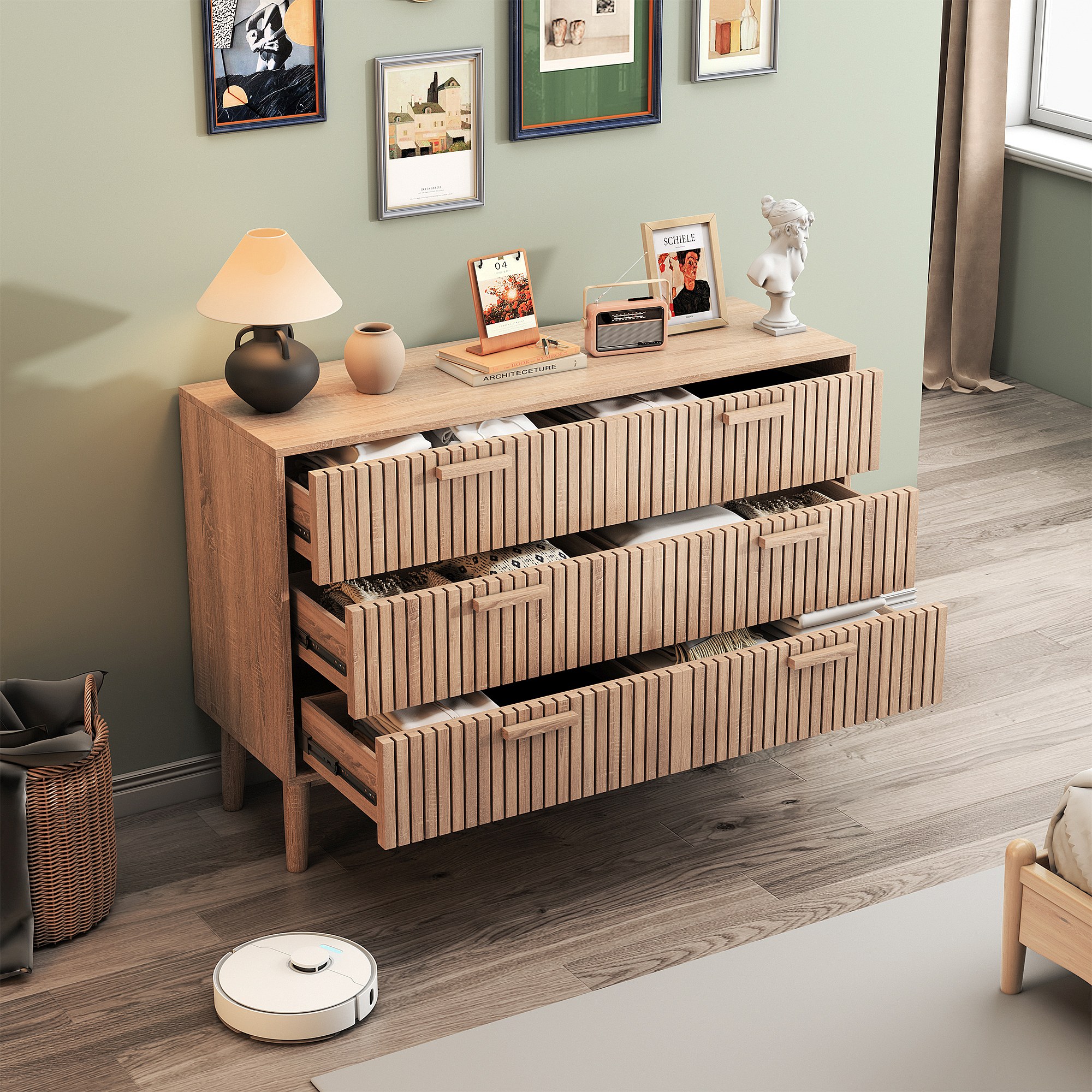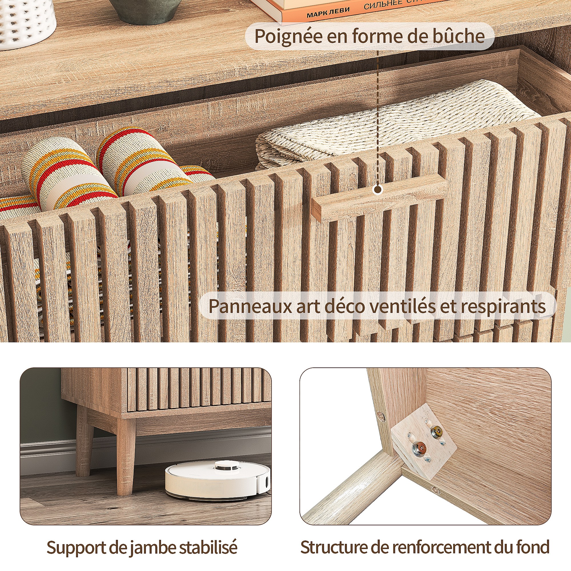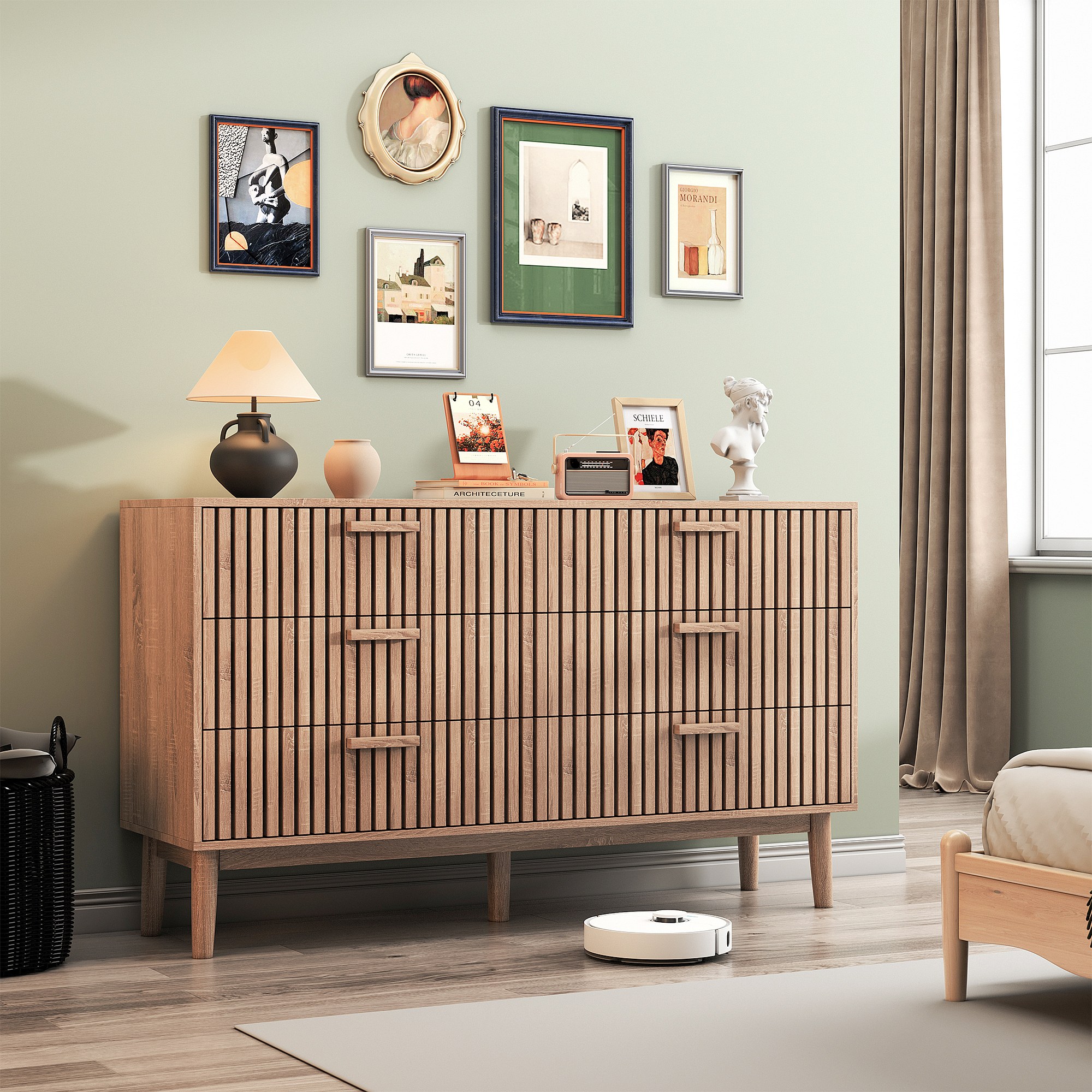 Commode Chambre, Commode en Bois et Rotin 6 Tiroirs, Meuble de Rangement Multifonction, Natural Wood Cabinet with Drawers