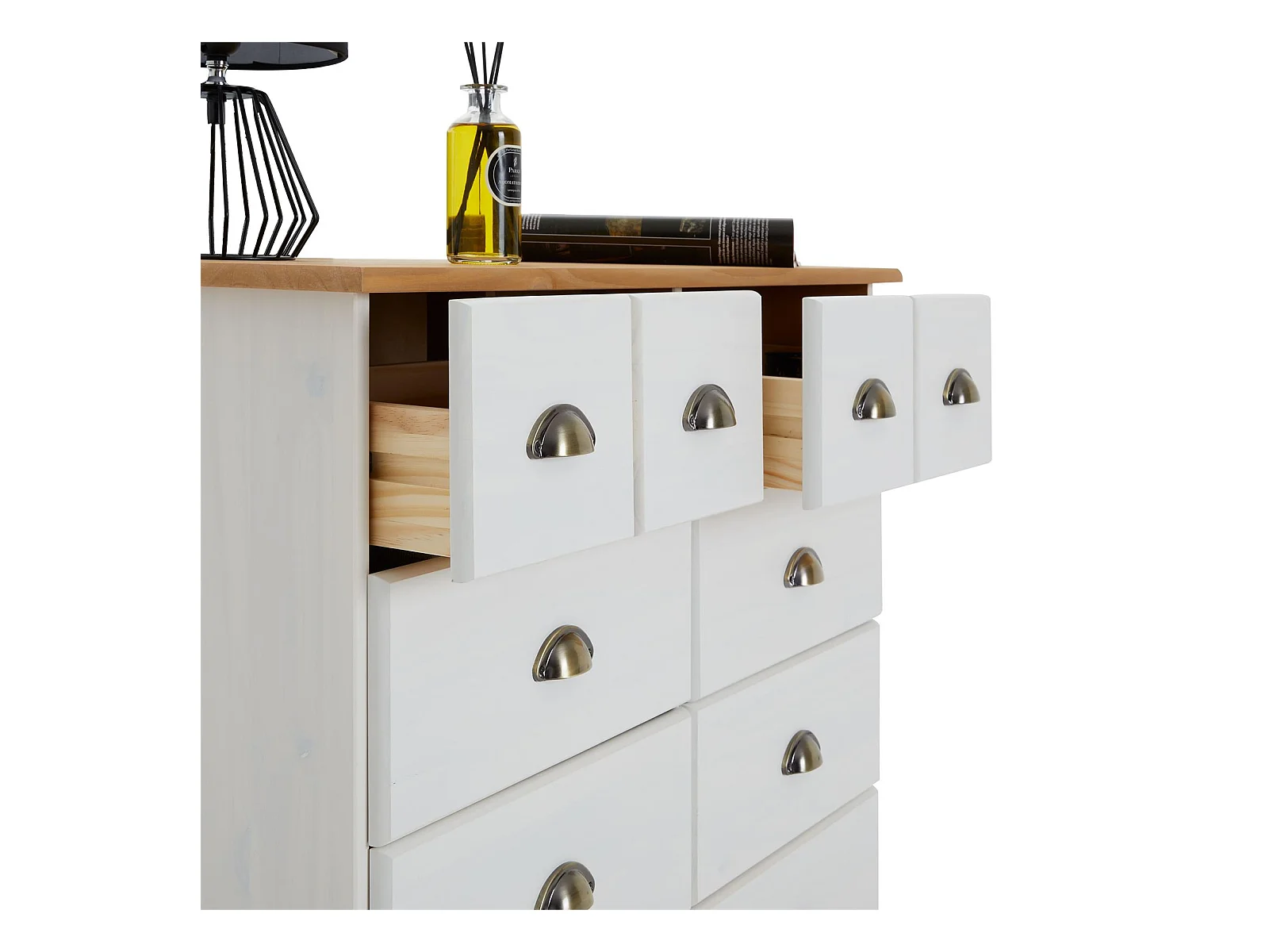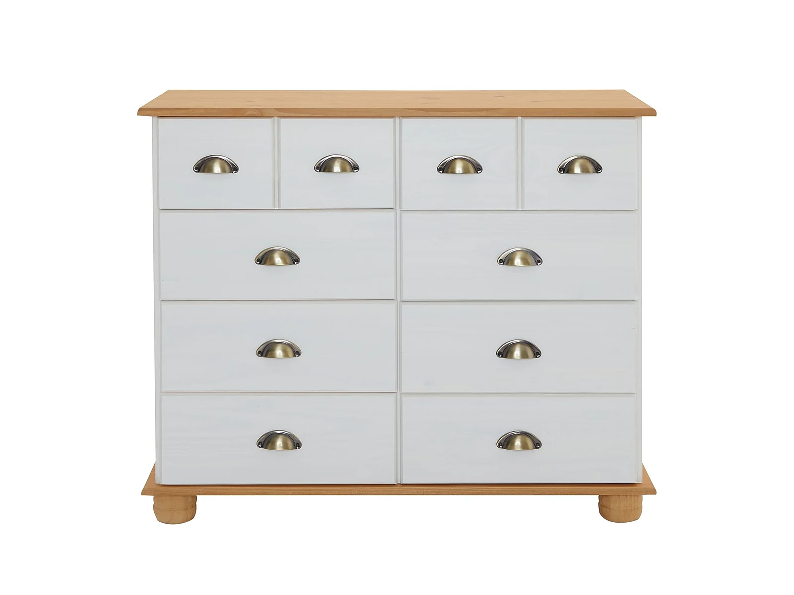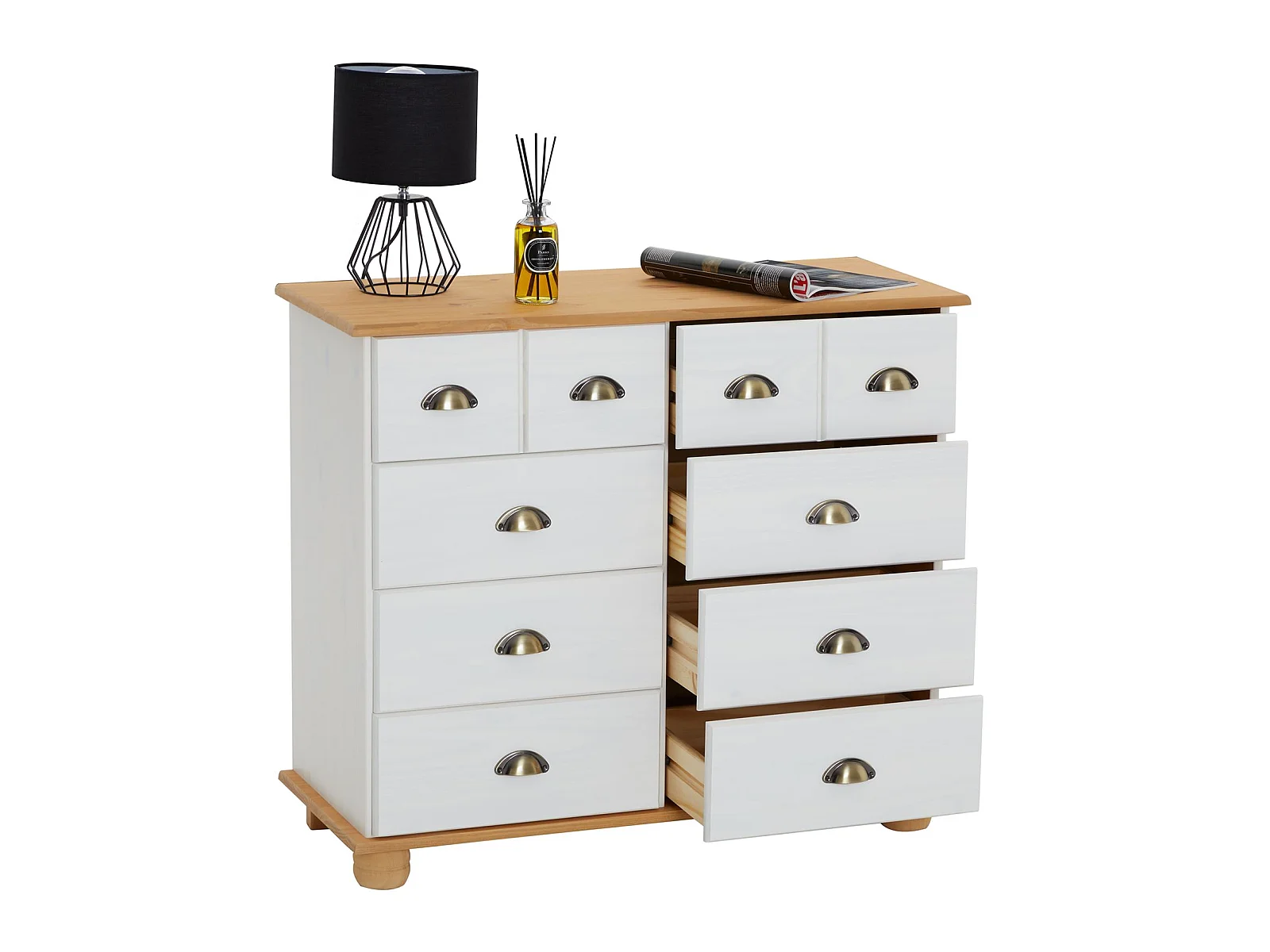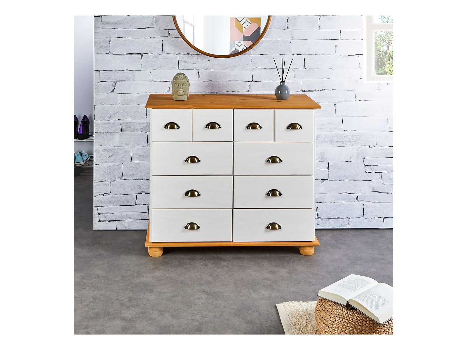Buffet salle à manger COLMAR en bois L 92 cm blanc et brun avec 8 tiroirs spacieux, poignées coquille, finition élégante