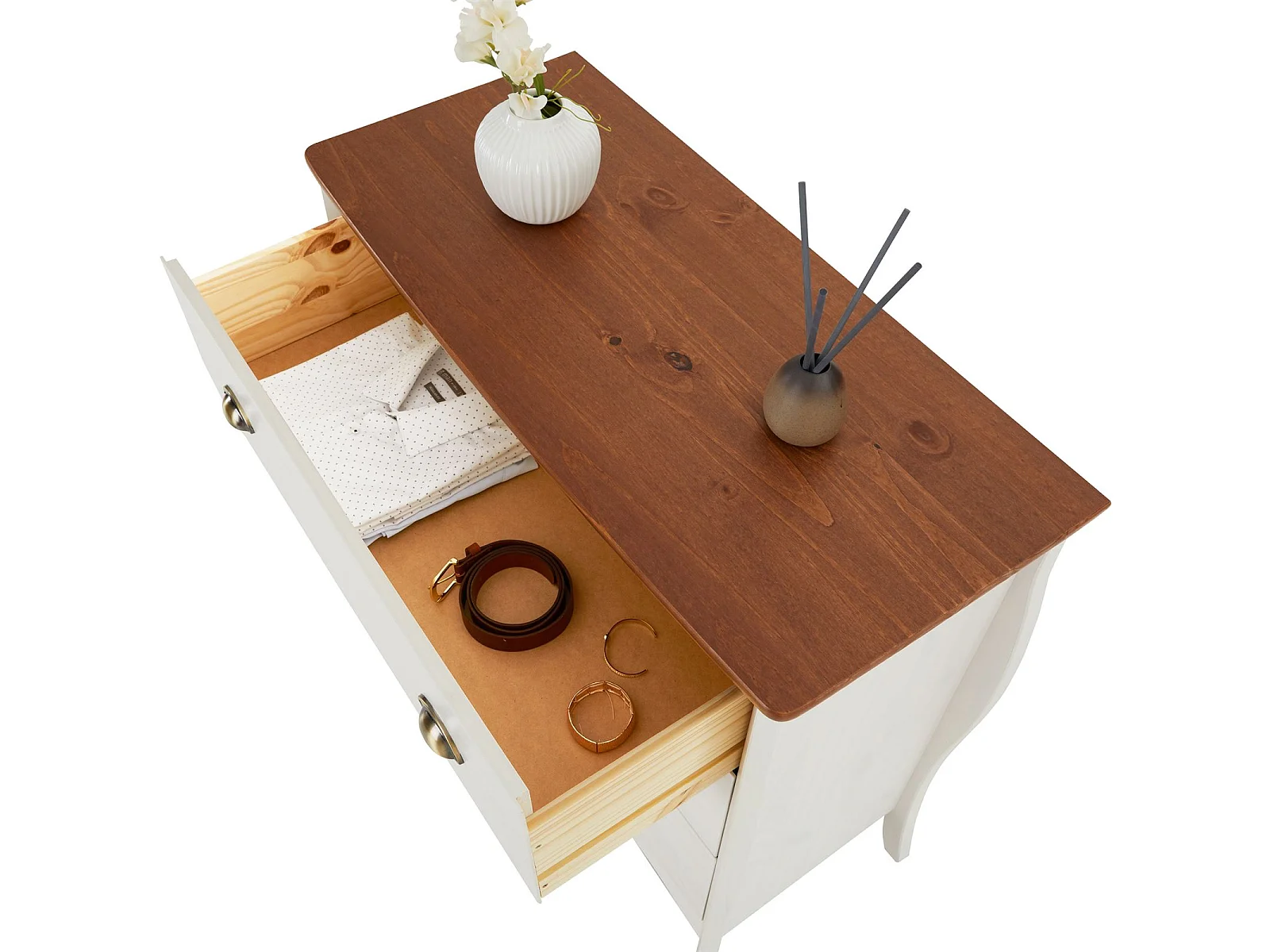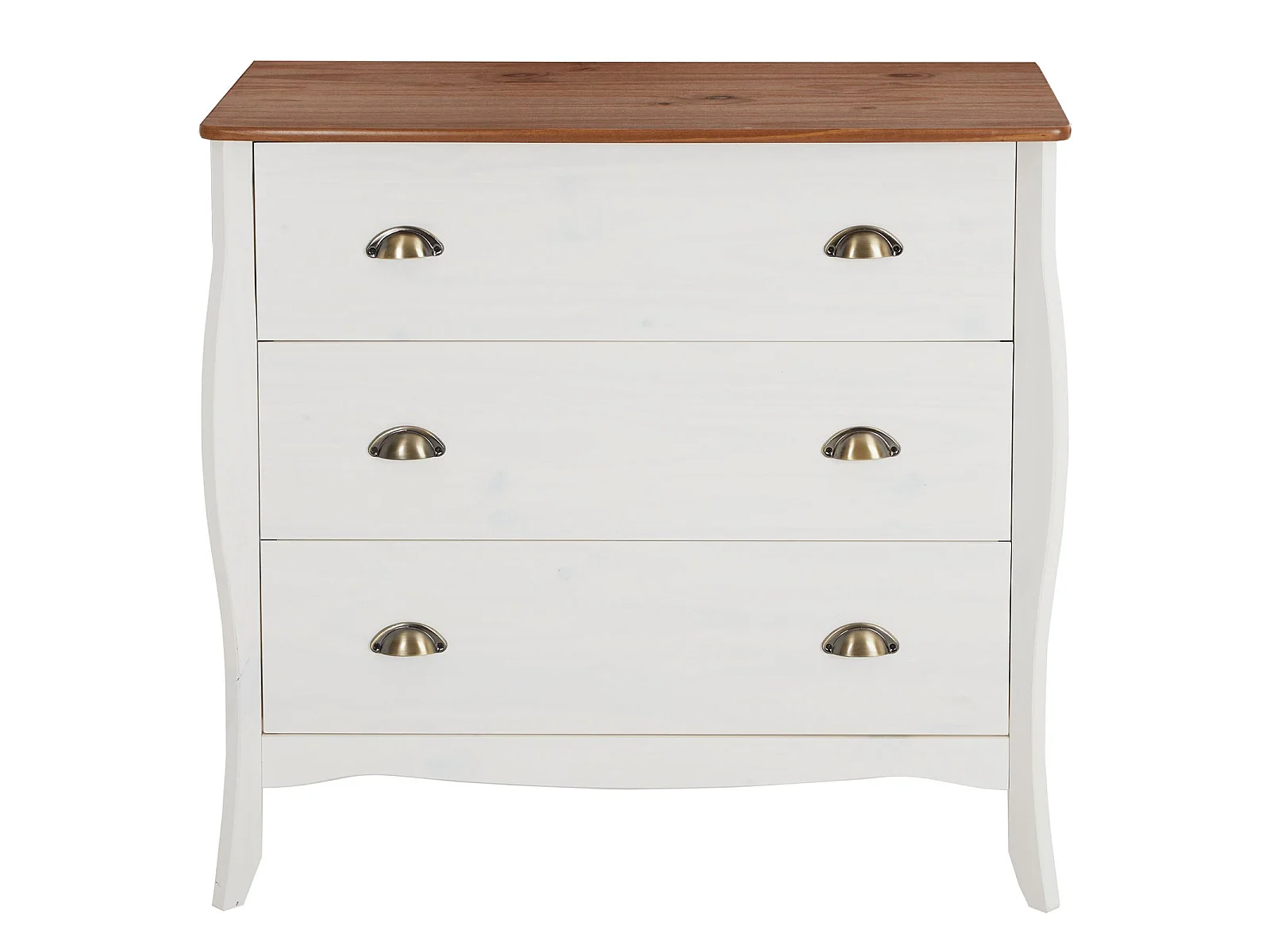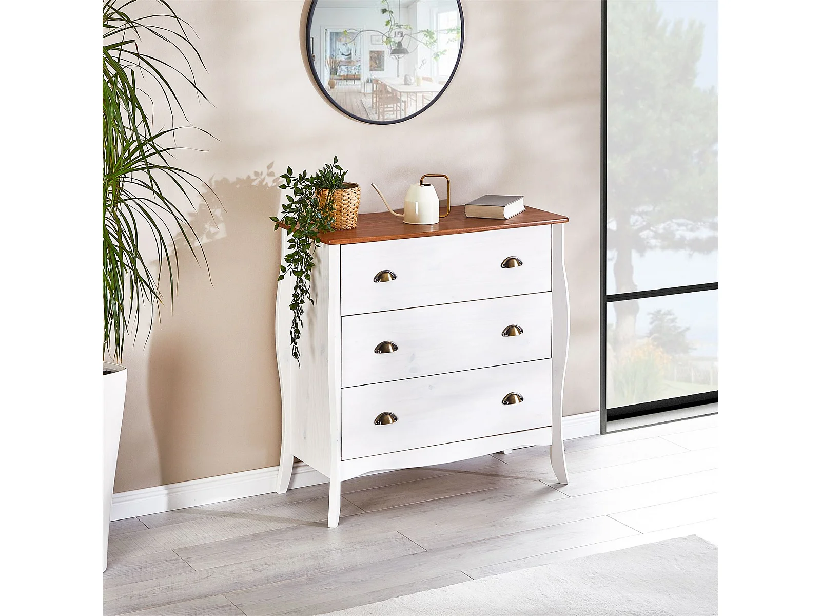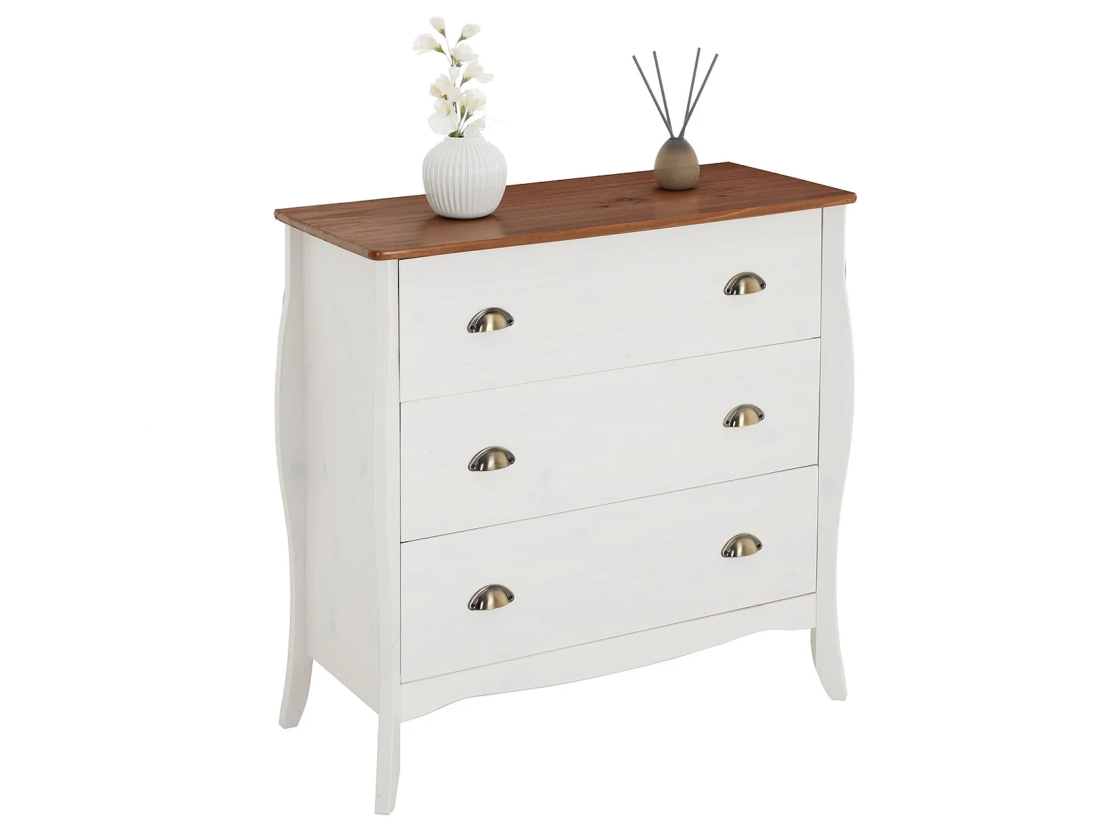 Commode de chambre ANTOINETTE style baroque rococo design moderne, rangement avec 3 tiroirs, pin massif lasuré blanc et brun foncé