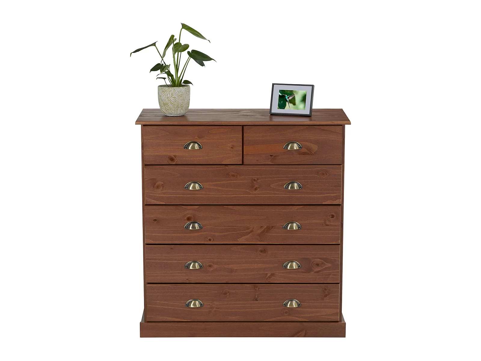 Commode chambre PARIS L 91 cm en bois massif lasuré brun foncé avec 6 tiroirs avec poignées coquille en métal