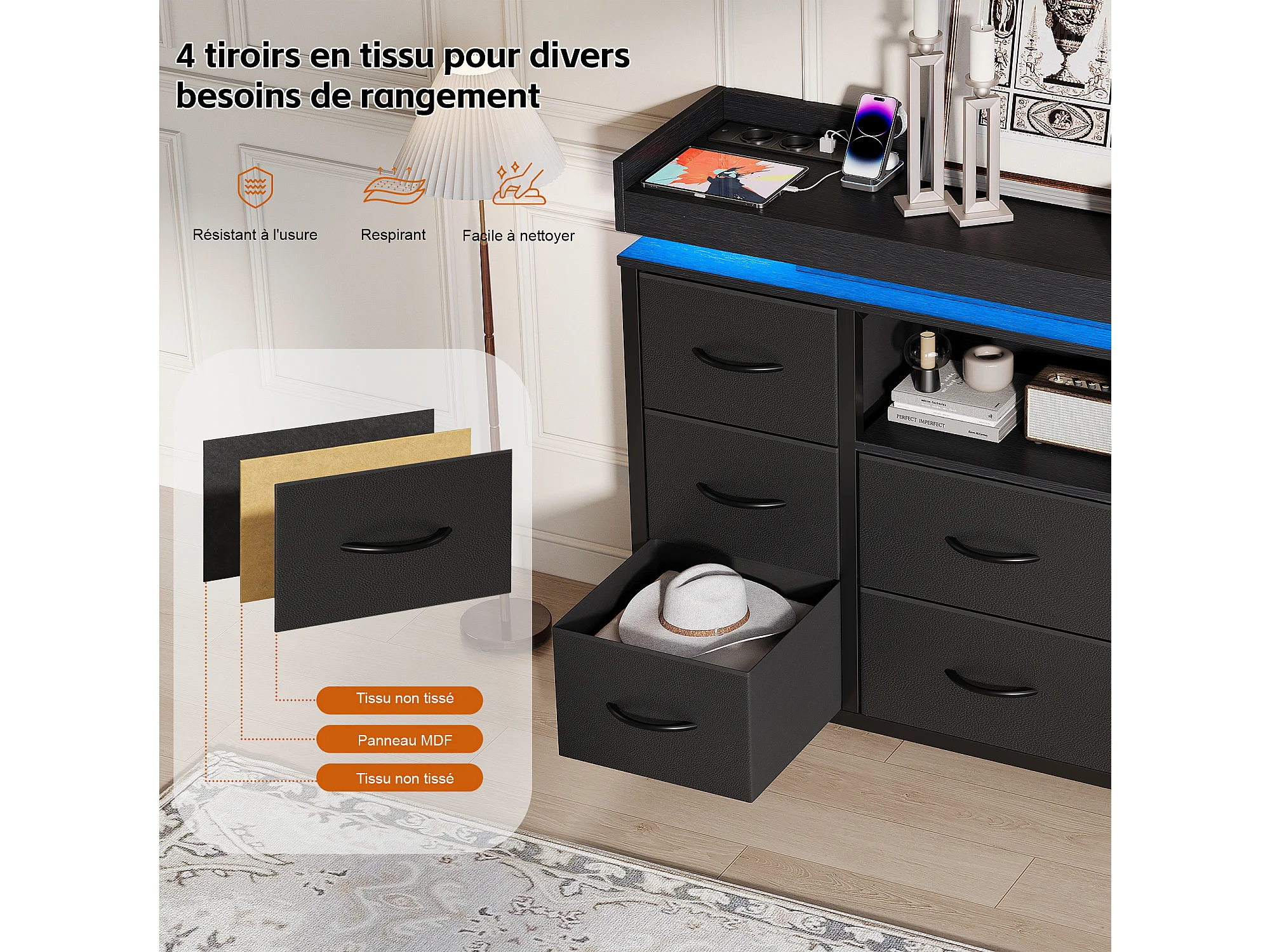 commode de tiroirs - - 108 x 30 x 82 cm - 8 tiroirs avec lumière LED RVB - avec prise de charge - noir