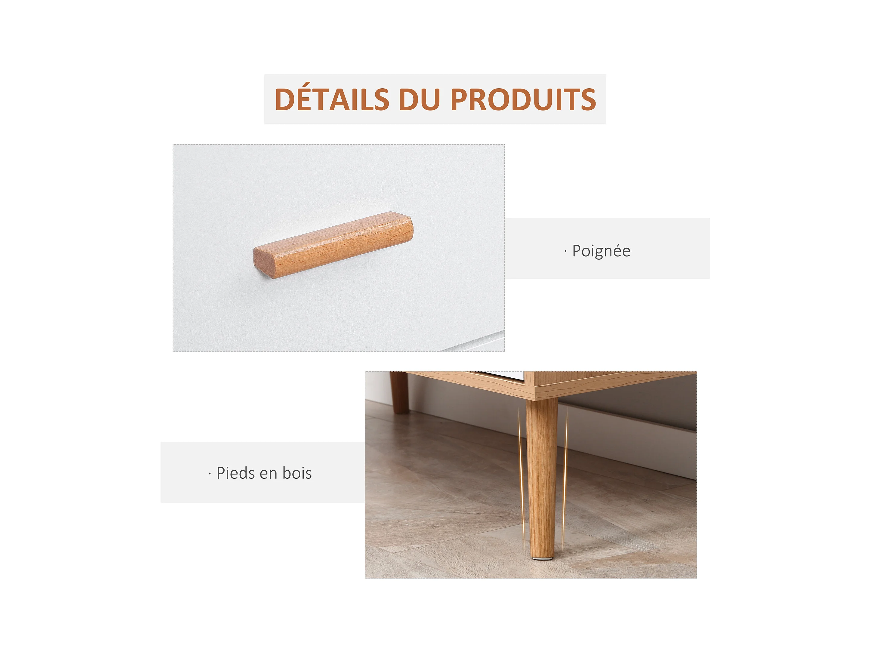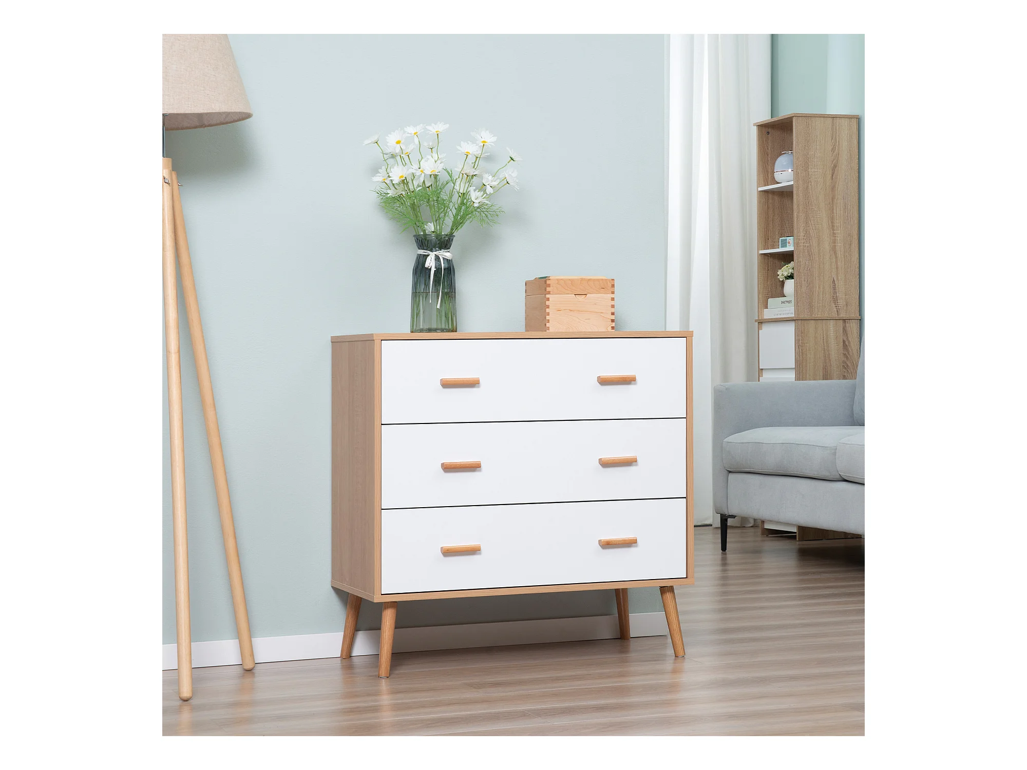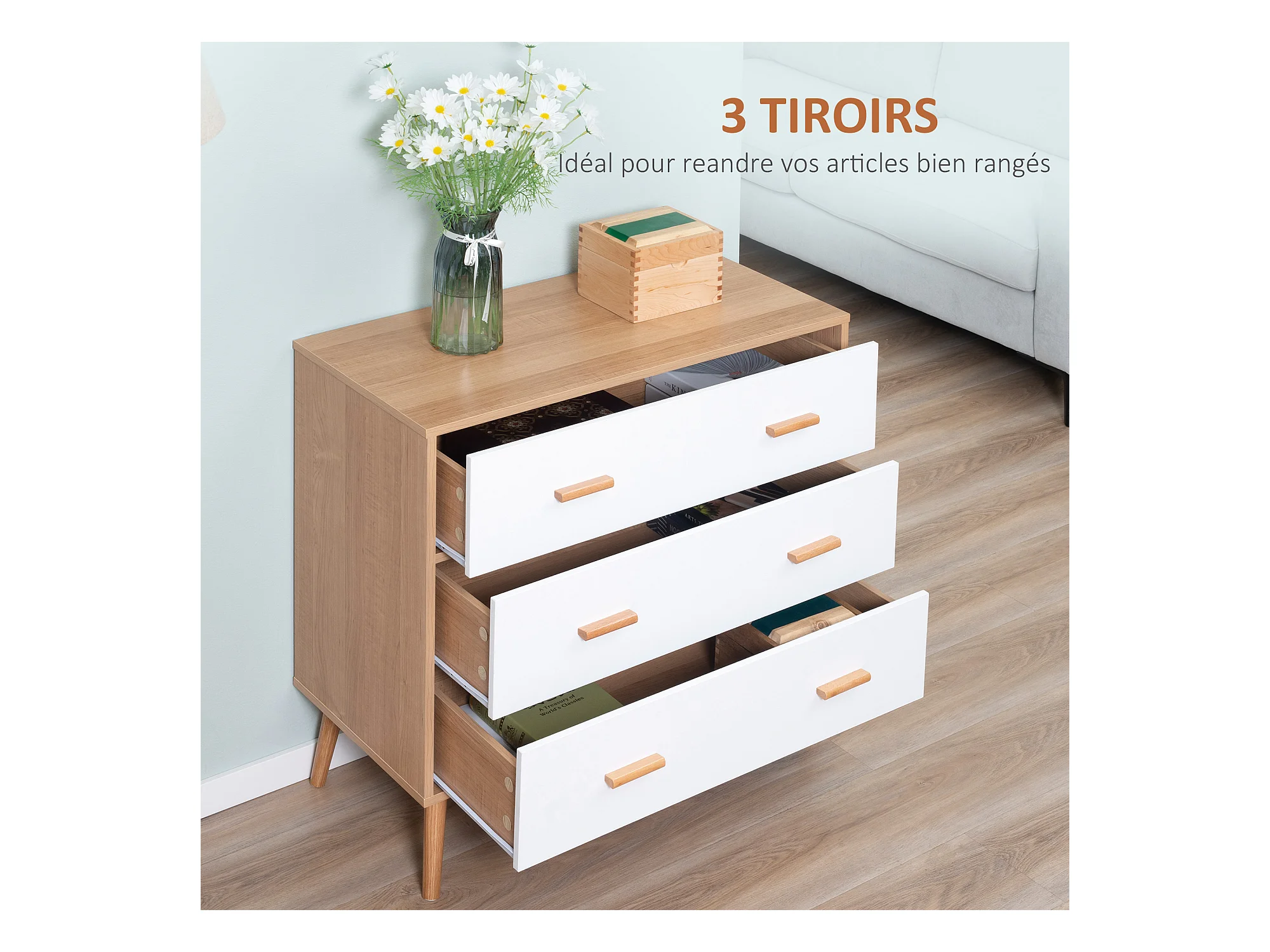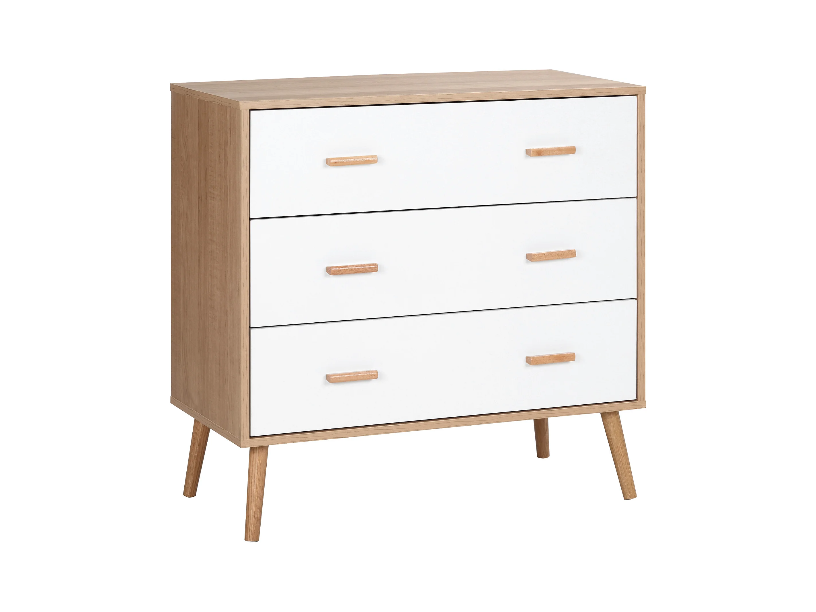 Commode design scandinave 3 tiroirs piètement effilé panneaux MDF blanc aspect bois clair