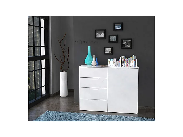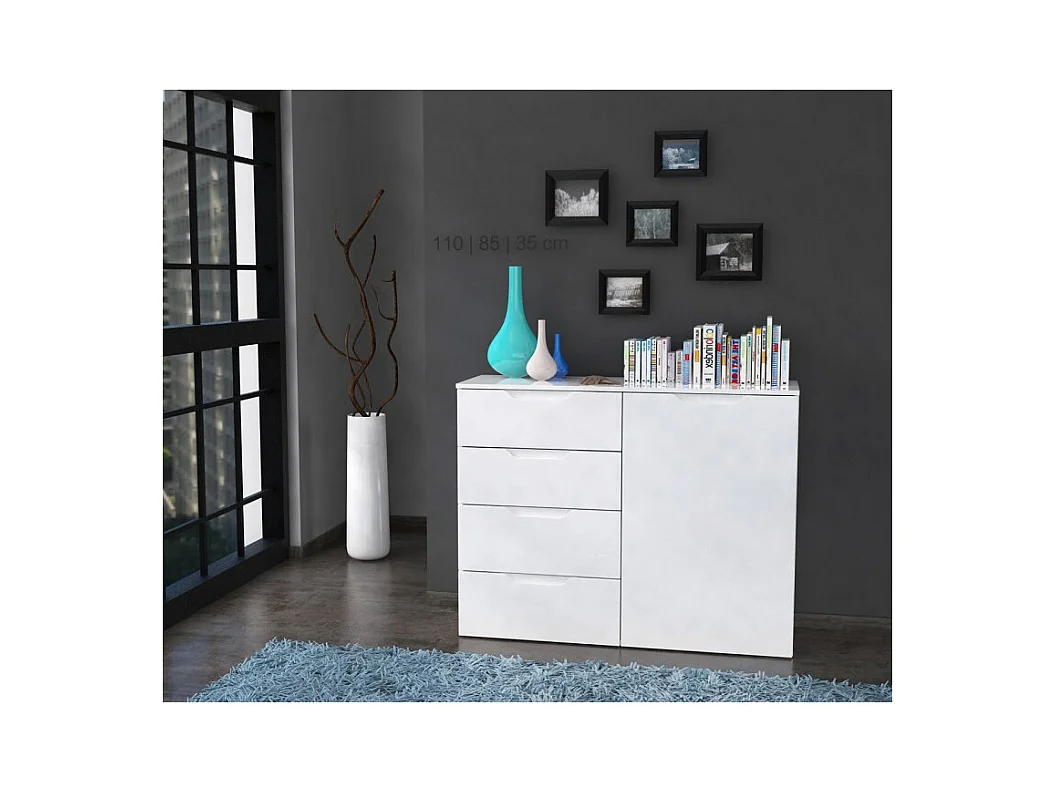 Commode 110 cm blanc laqué et mat 1 porte et 4 tiroirs - PURE