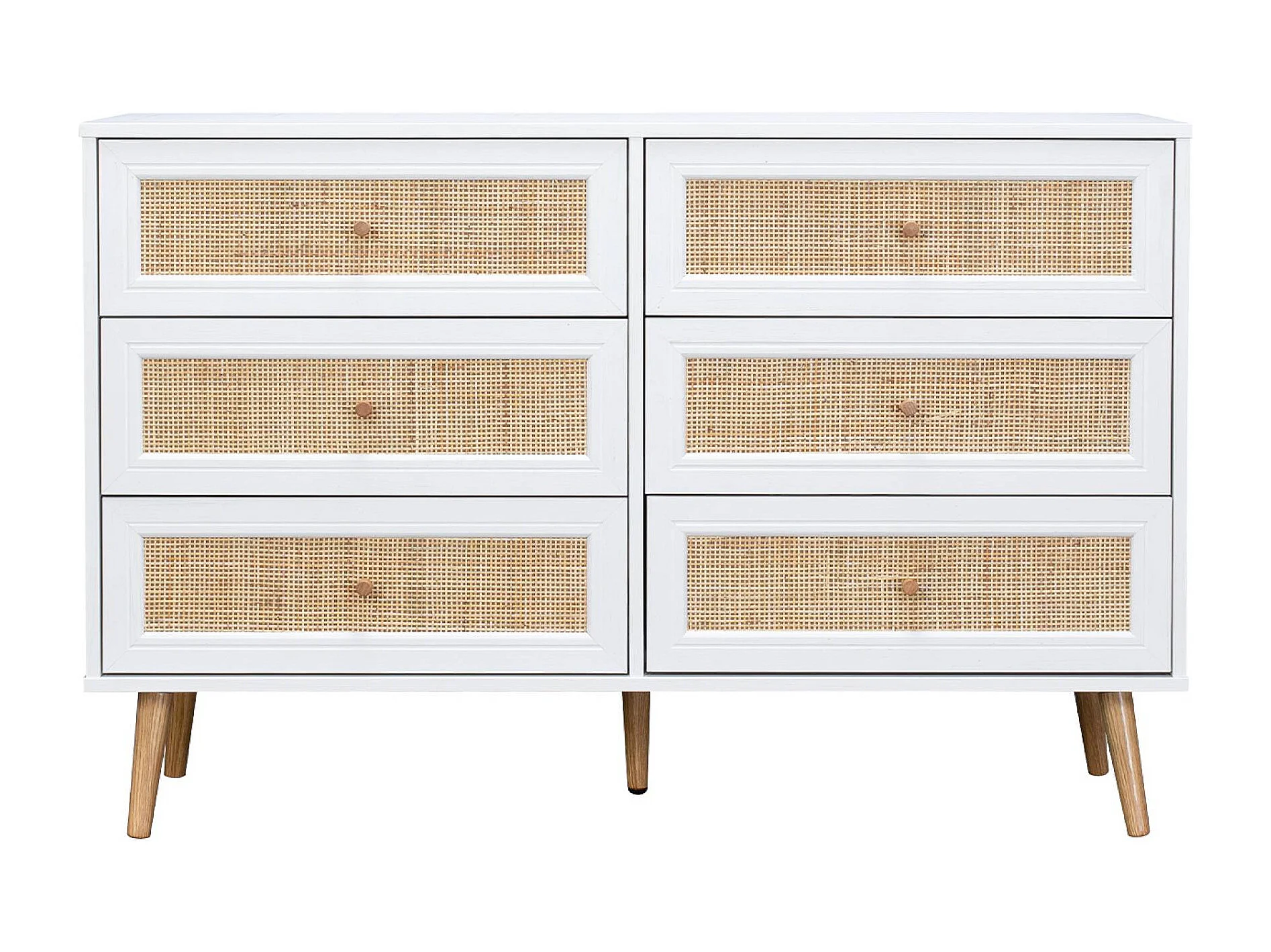Commode décor bois et cannage 6 tiroirs Bohème. blanc - 120x39x79cm