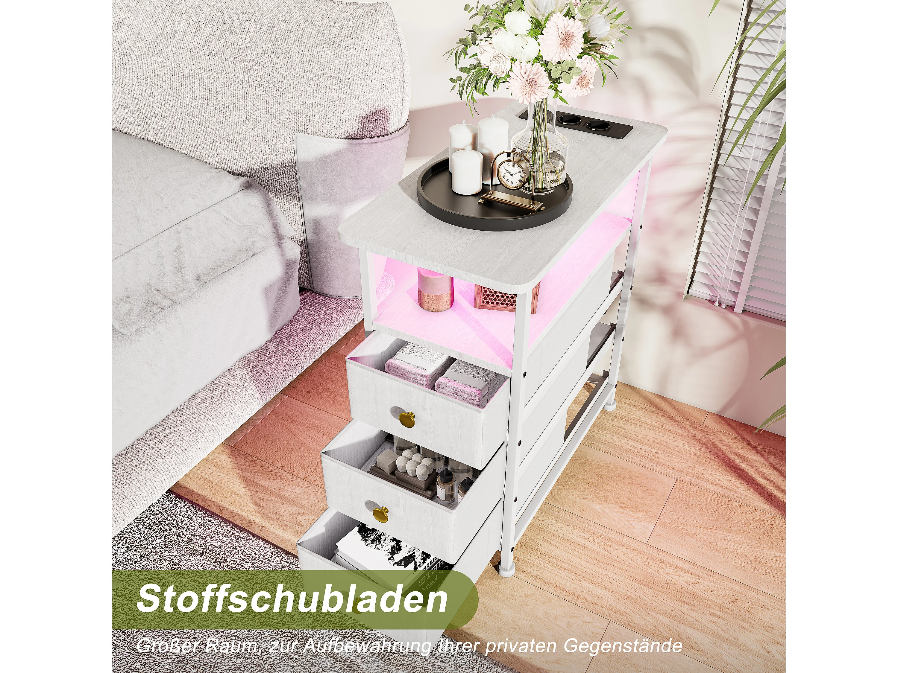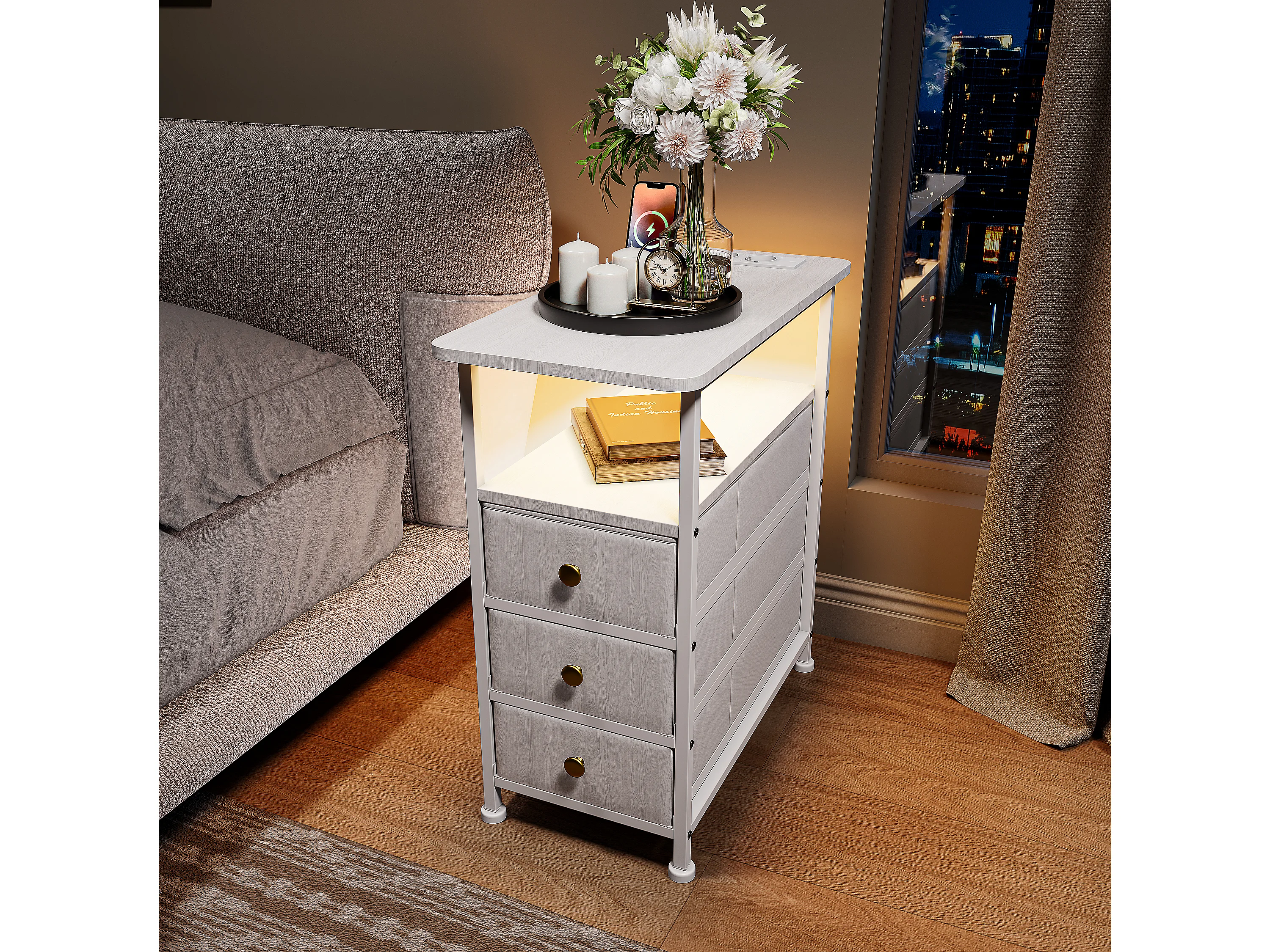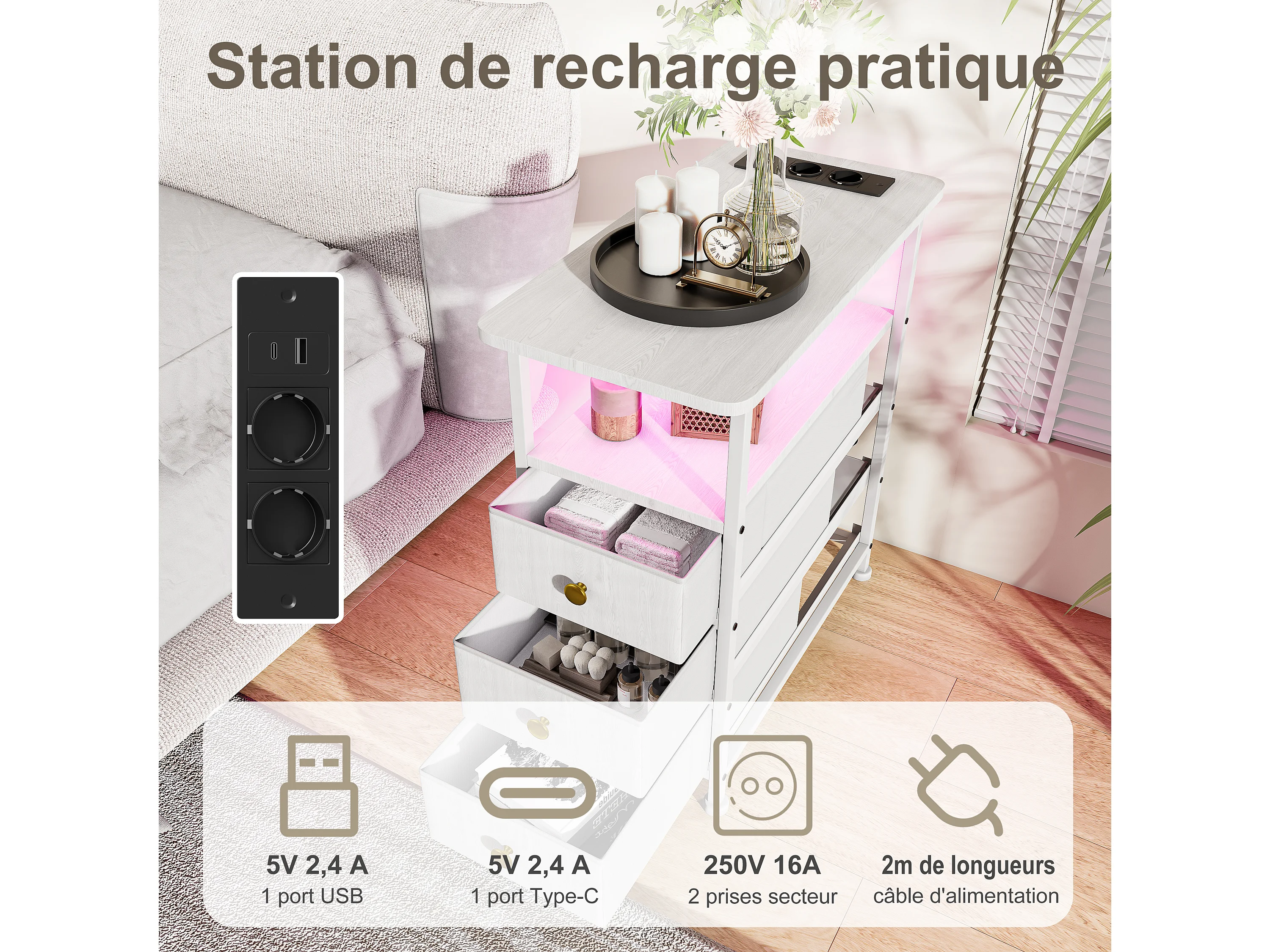 Commode étroite à 3 tiroirs, table de chevet avec fonction de chargement et bande lumineuse, table d'appoint avec tiroirs, 30 x 60 x 62 cm,Blanc