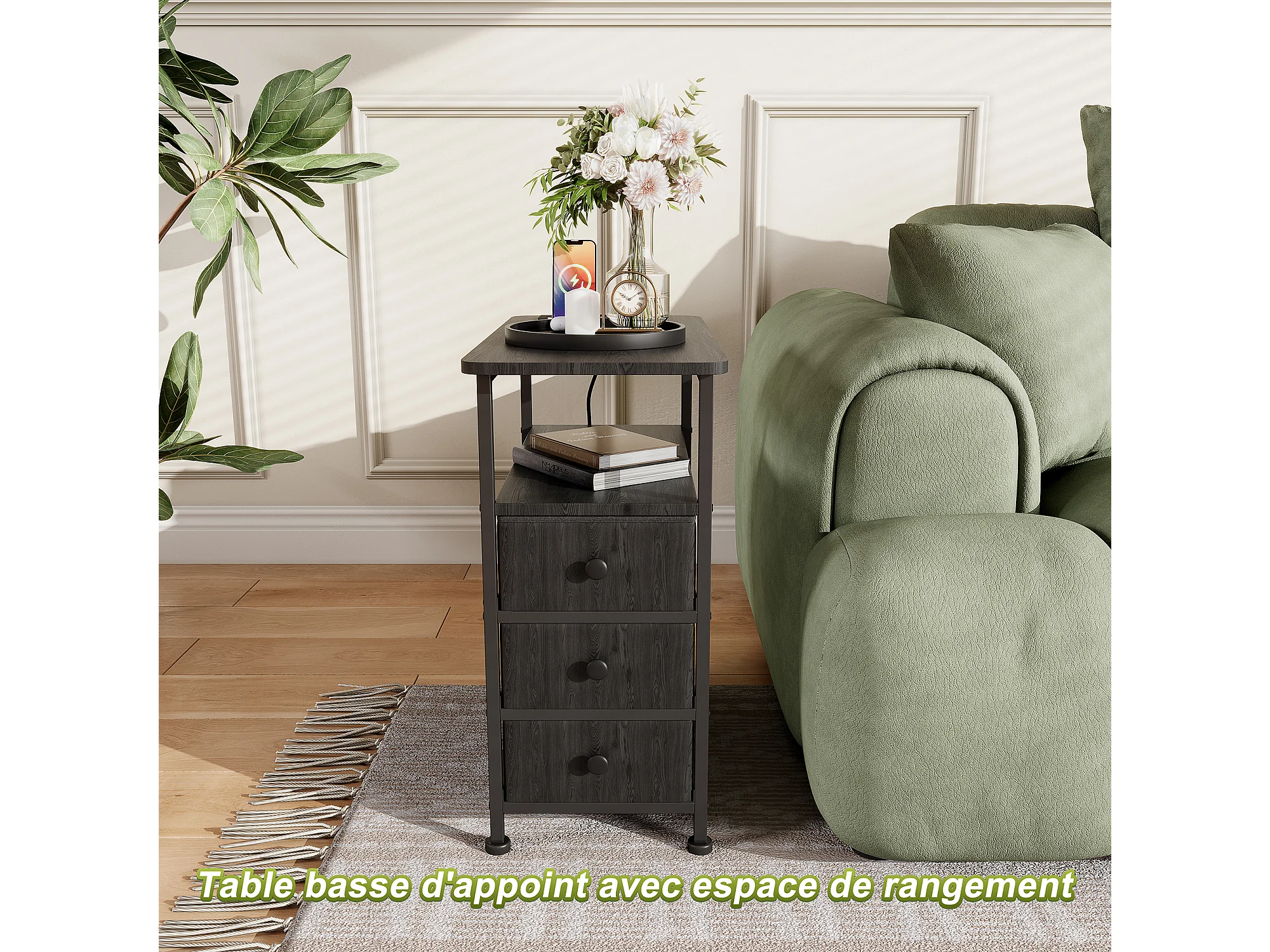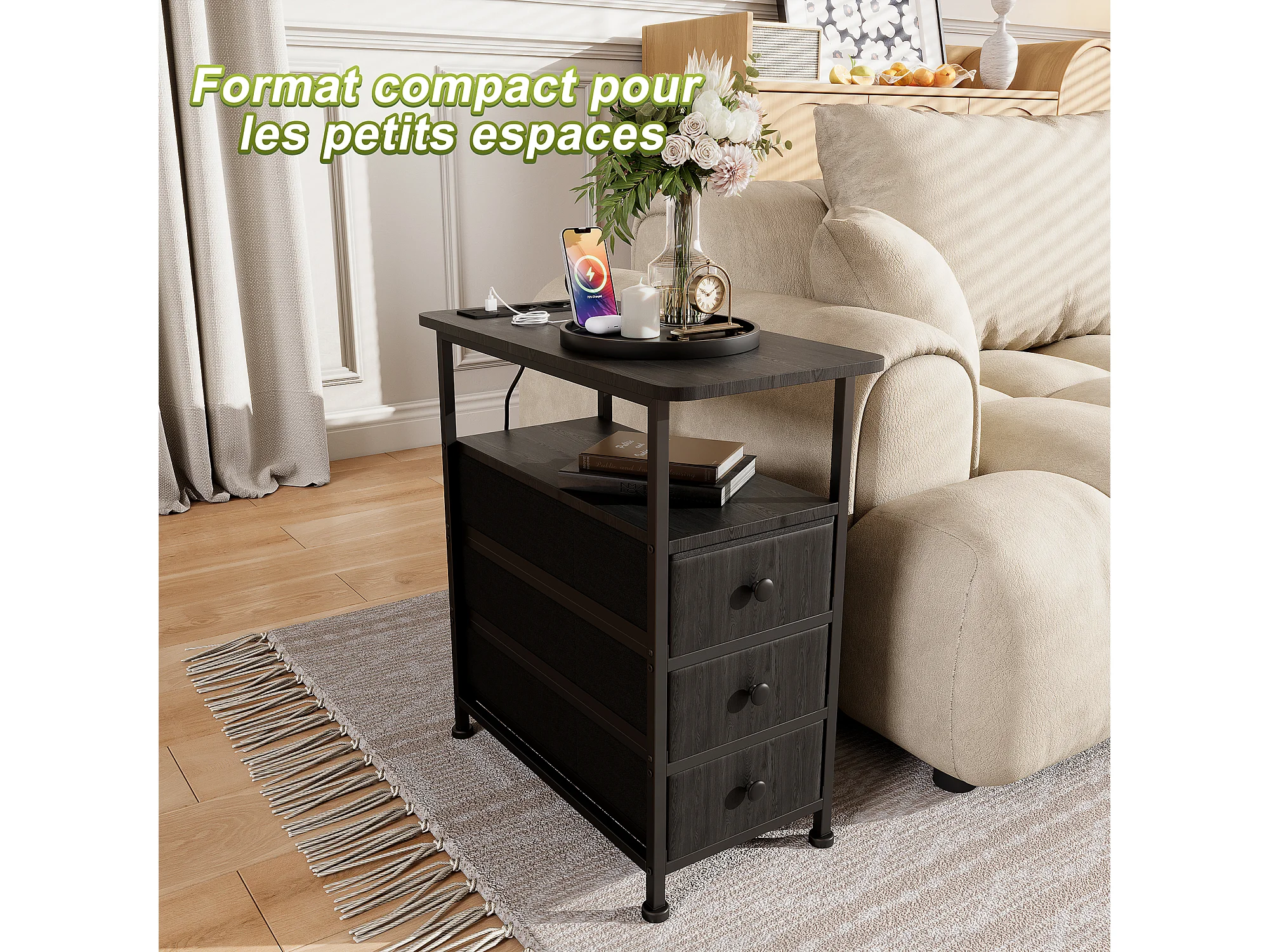 Commode étroite, table de chevet avec fonction de chargement et bande lumineuse, table d'appoint avec tiroirs, 30 x 60 x 62 cm,Noir